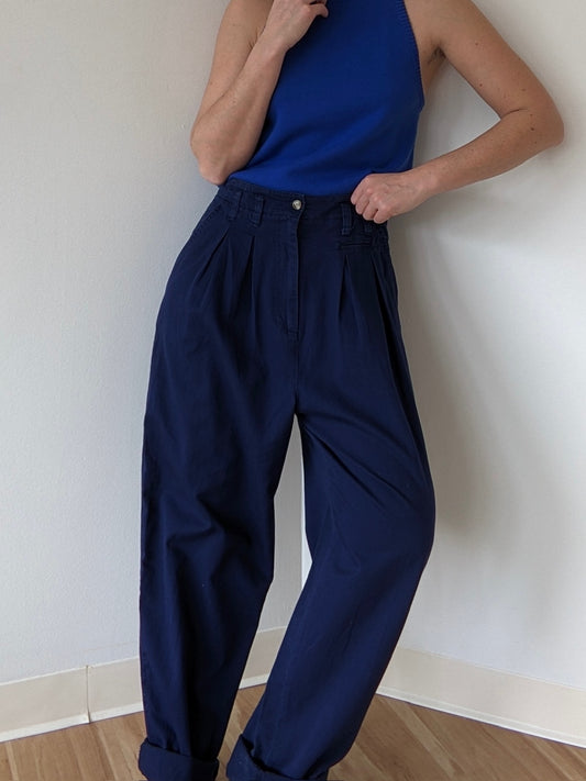 Vintage Navy Pleated Cotton Trousers