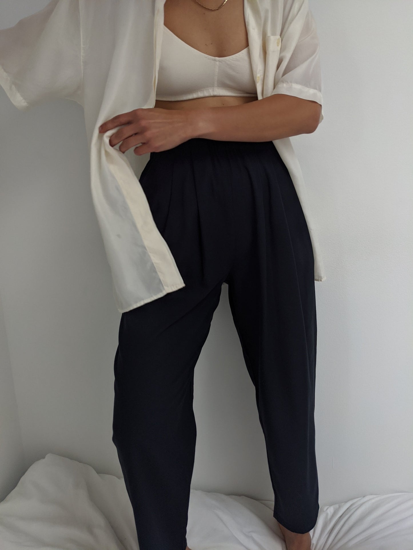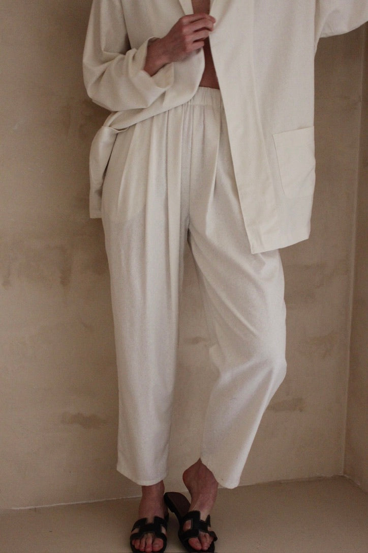 The Lena Pant in our classic raw silk is an incredibly useful pant essential for one's wardrobe. The Lena Pant features a comfortable elastic waist, handsome front pleats, side pockets, and a cropped fit leg. We love pairing the Lena Pant with a favorite vintage blouse or with our coveted Clarke Top.