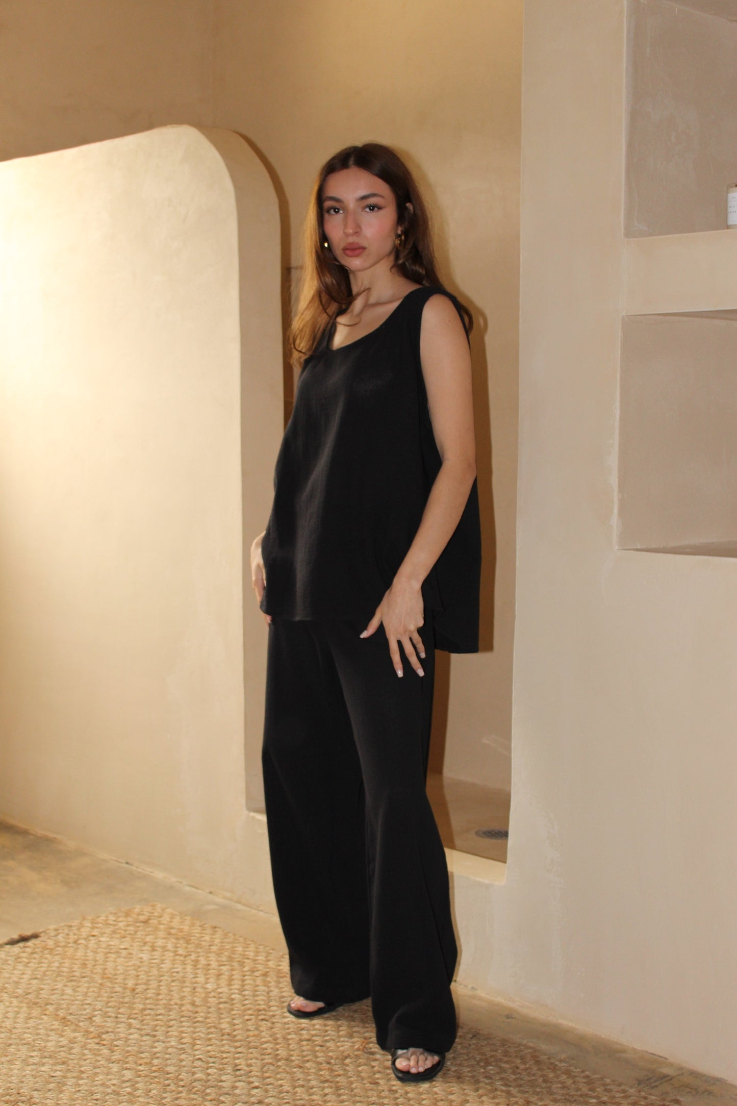 The Na Nin Marni Tank in our favorite waffled cotton fabric features a low scoop neckline, dramatic side drape, and a boxy fit. This gauzy fabric offers a breezy feel with subtle sheerness. We recommend wearing with skin toned undergarments or over your favorite swimwear.