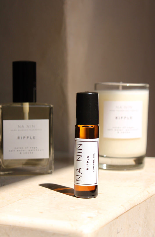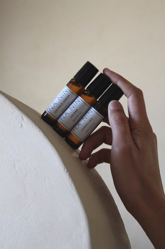Our perfume oil fragrances are hand-blended and bottled at our studio in Richmond, VA. Ingredients are simply fractionated coconut oil, essential oils, and premium fragrance oils that are free of parabens, pthalates, or sulfates.