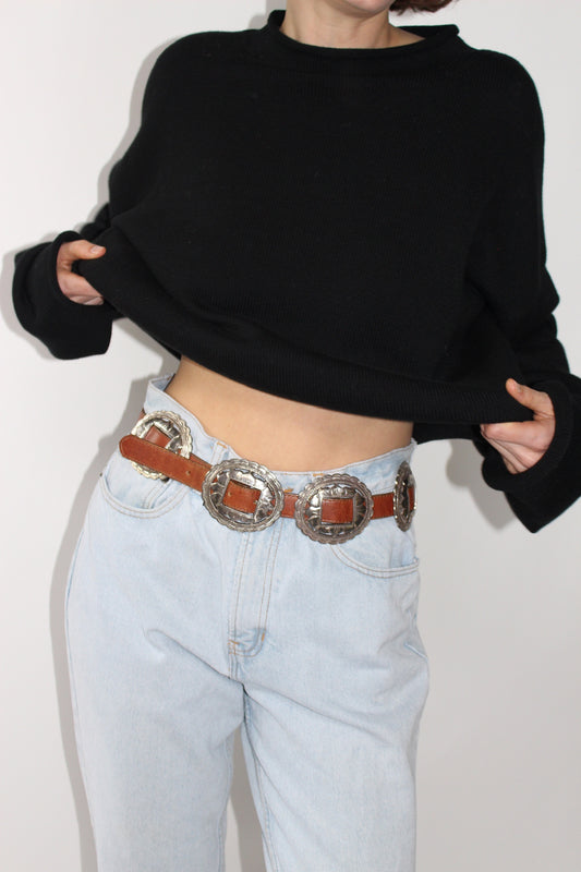 Rare Vintage Heavy Silver & Embossed Leather Belt