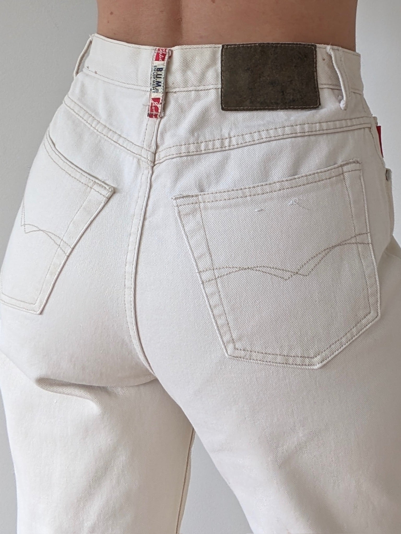 90s vintage denim by B.U.M Equipment in the best natural tone. Jeans have a high-rise fit with tapered leg, a 5-pocket structure and logo patches at front & back.