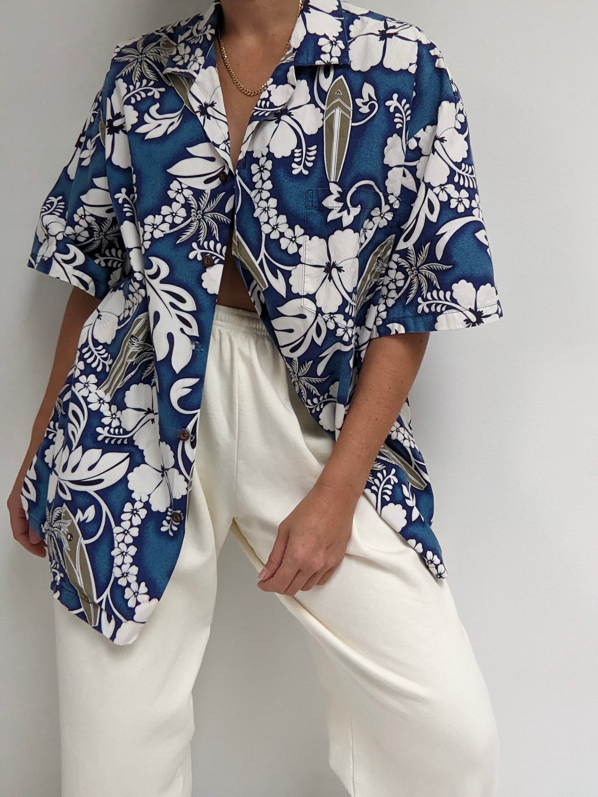 Fun 90s surf-print shirt in a classic Hawaiian style. Shirt is made of a crisp cotton fabric and features a collared neckline with single pocket at the chest.