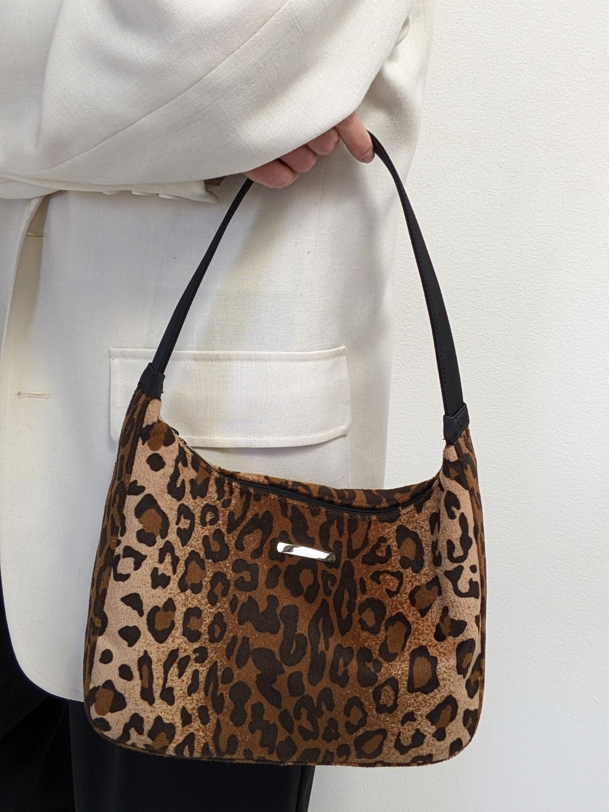 Fun 90s style purse by Nine West in a felt-textured fabric with a cheetah print throughout. Purse has wide shoulder strap and a silver logo at the front.