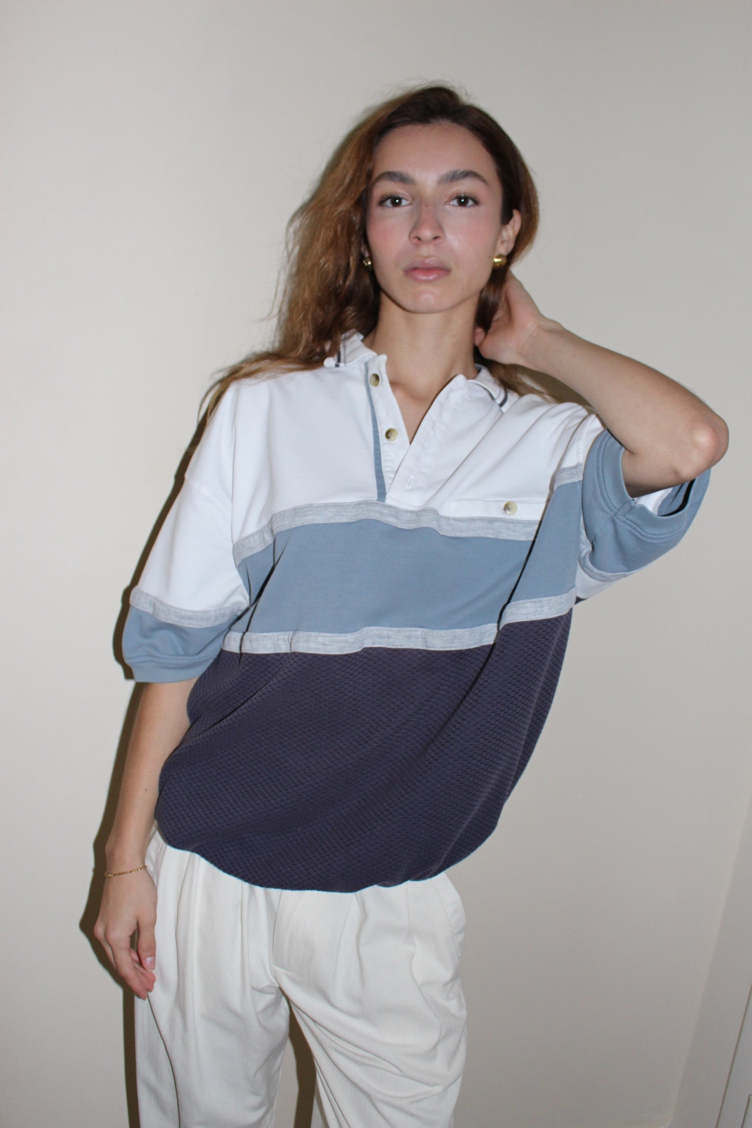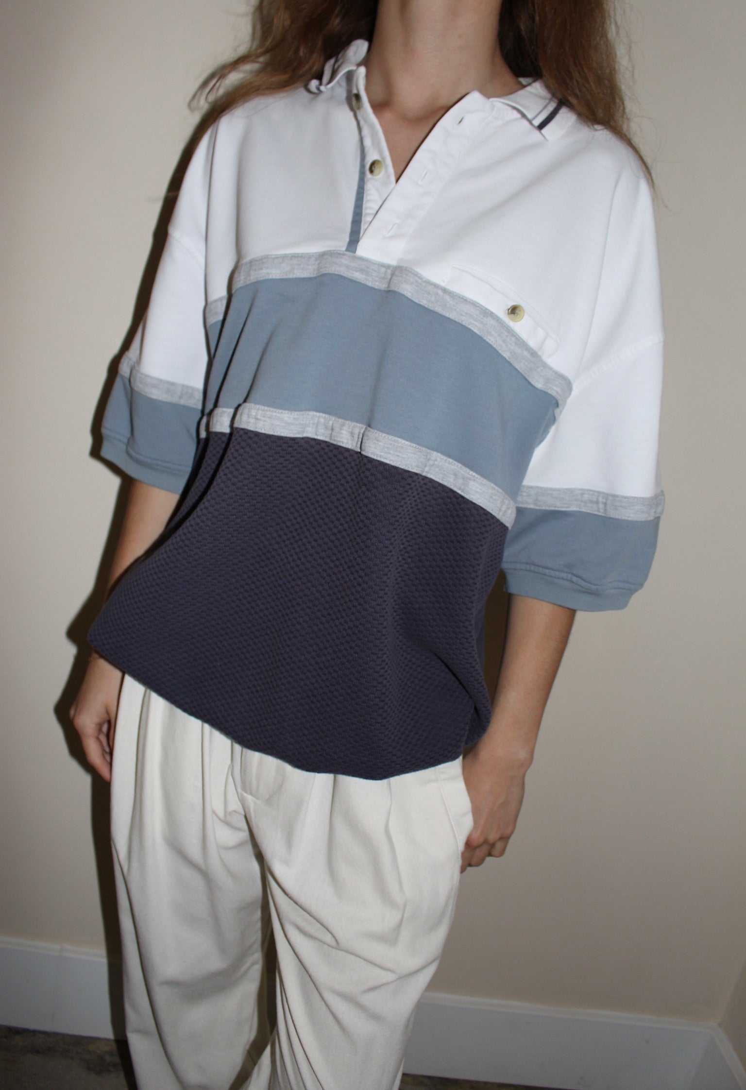 90s leisure henley with wide stripes, a chest pocket, collared neckline and woven accent at the lower body.