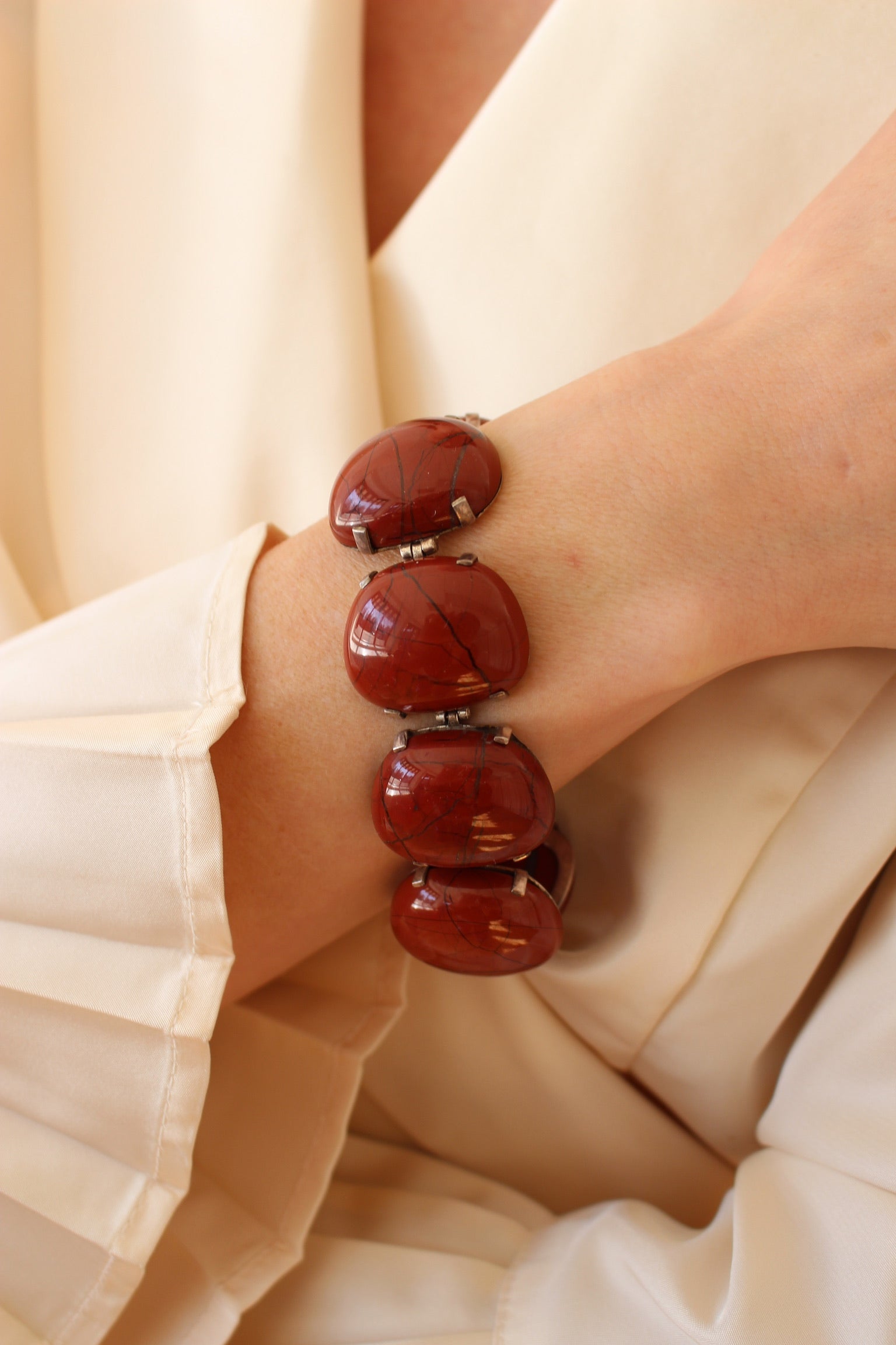 Absolute favorite vintage panel bracelet with bold, ultra-smooth red jasper stones held tightly together by sterling silver frames. Features a classic & simple clasp closure.