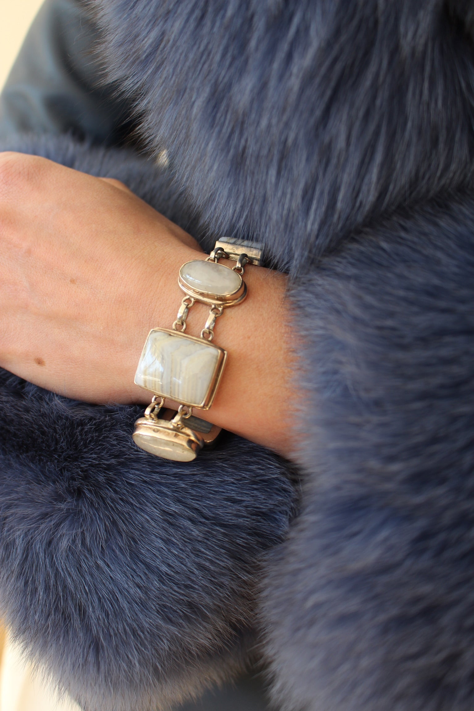 Absolutely stunning vintage bracelet in a segmented design featuring lovely blue lace agate & moonstone. Bracelet is set in 925 silver and features an adjustable, toggle closure.
