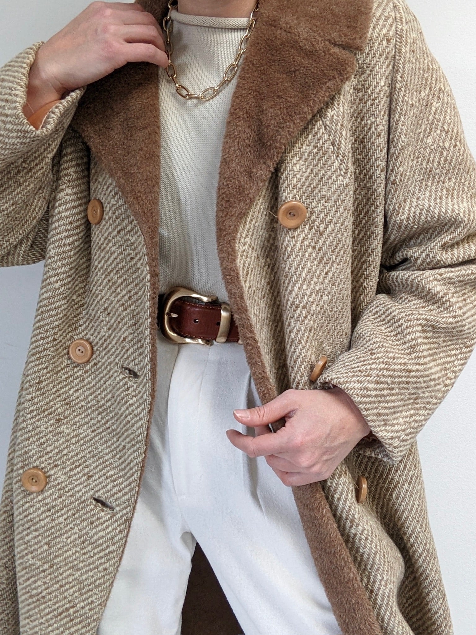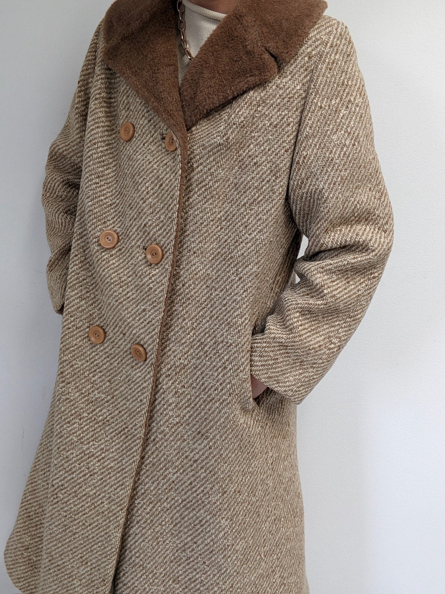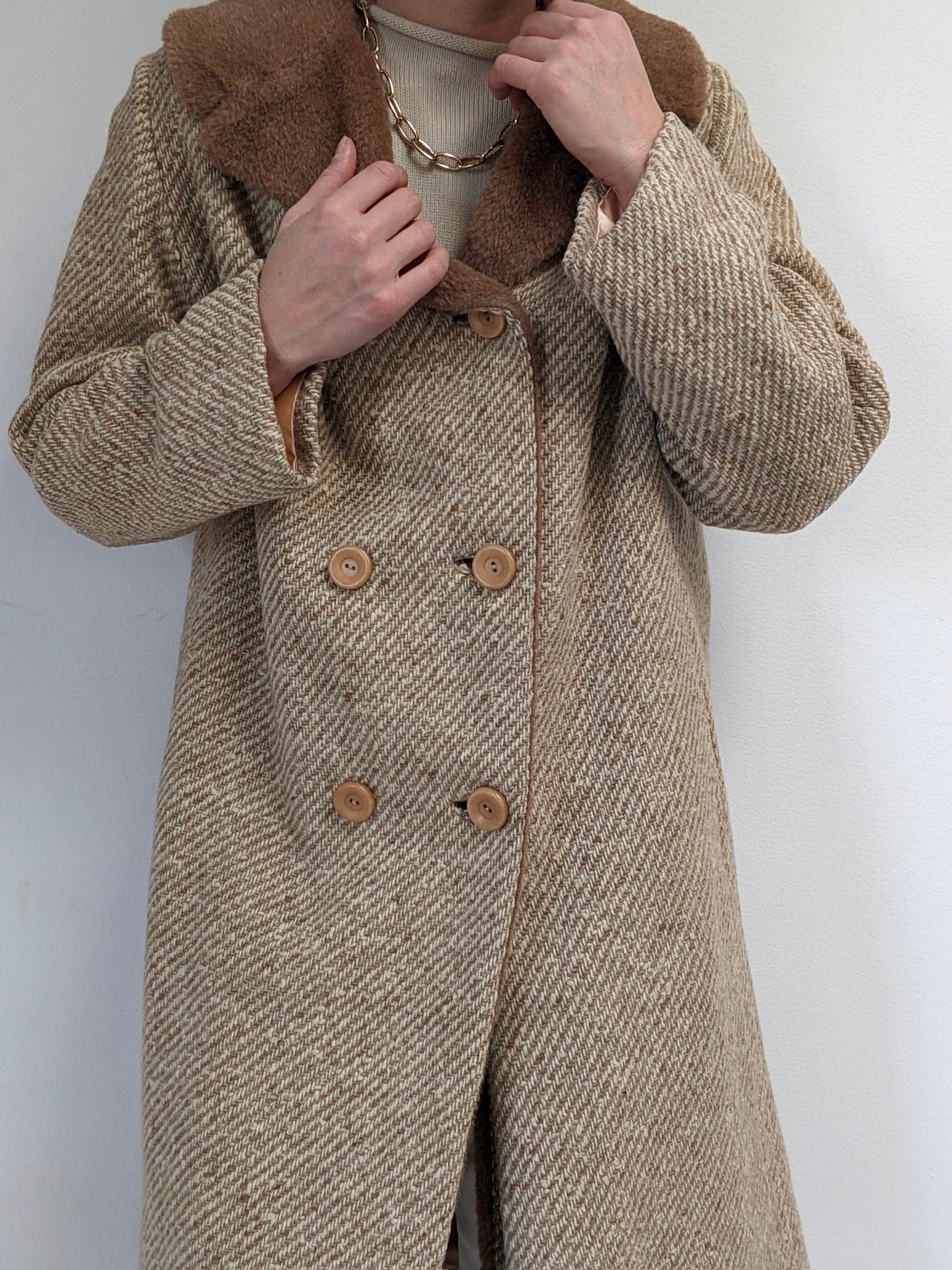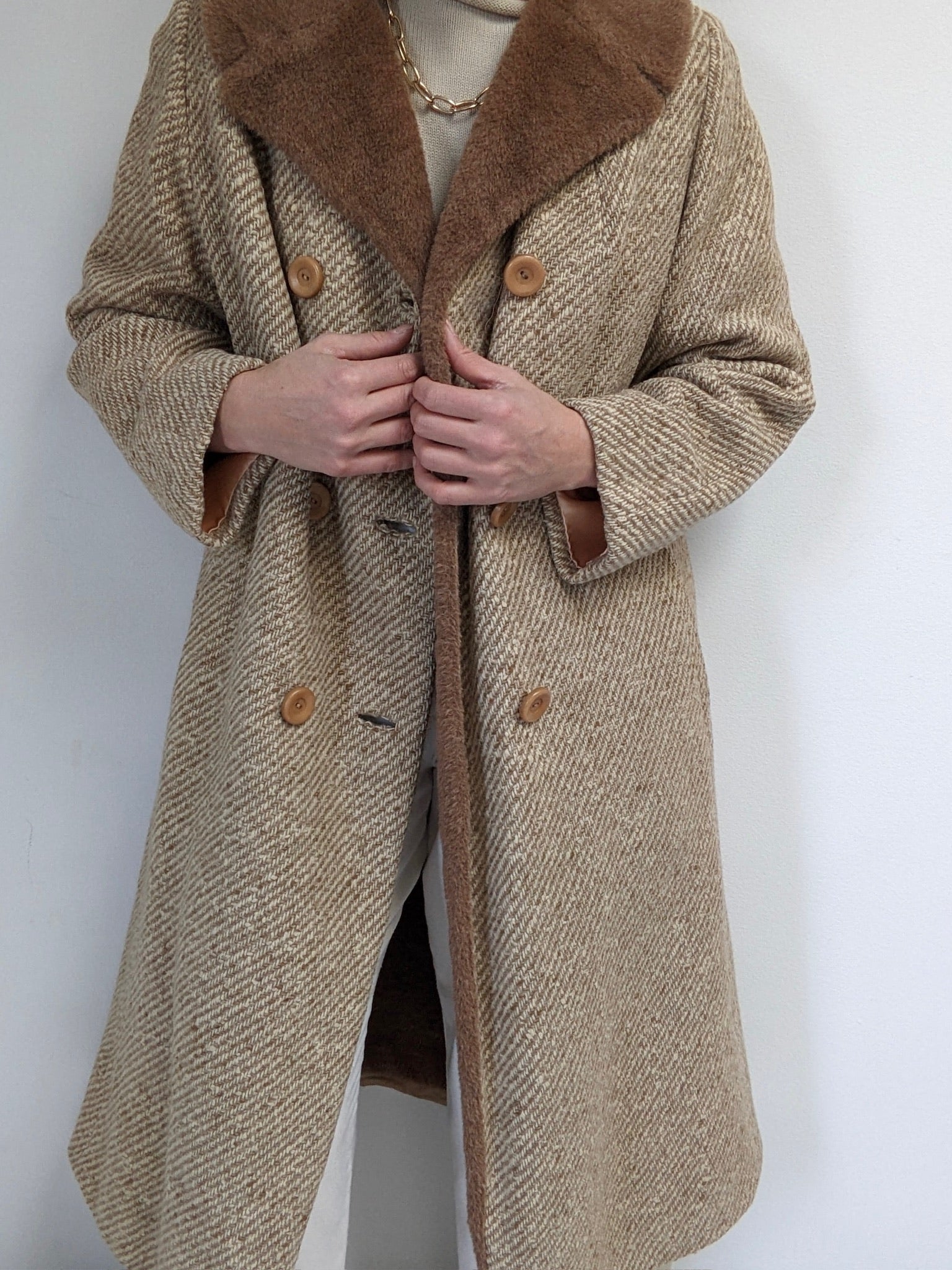 Amazing vintage coat in a stunning, almond & cream, woven tweed wool. Coat has an incredibly plush & cozy lining. Features large double-breasted button closures up the front, side pockets and a long drape.