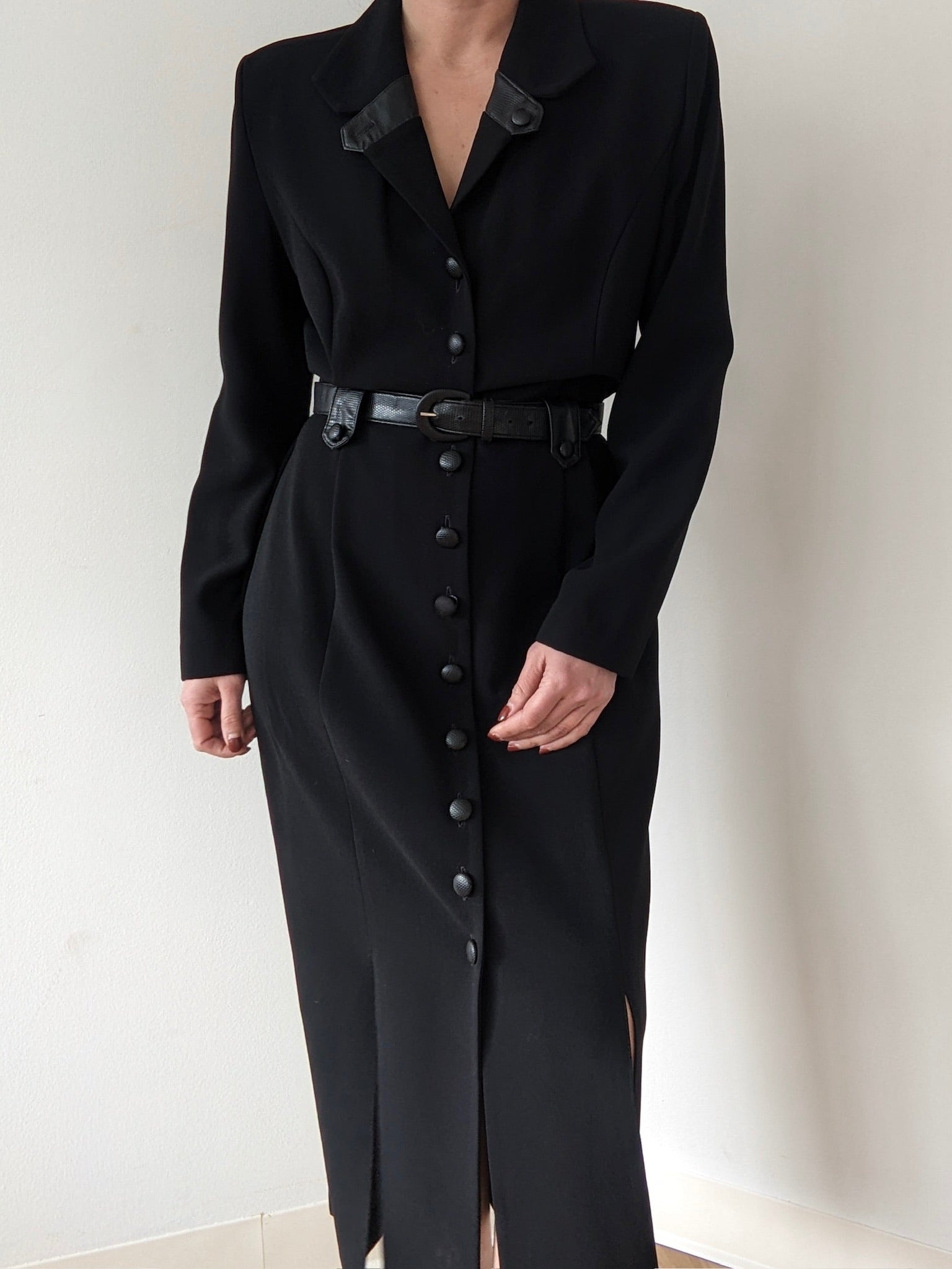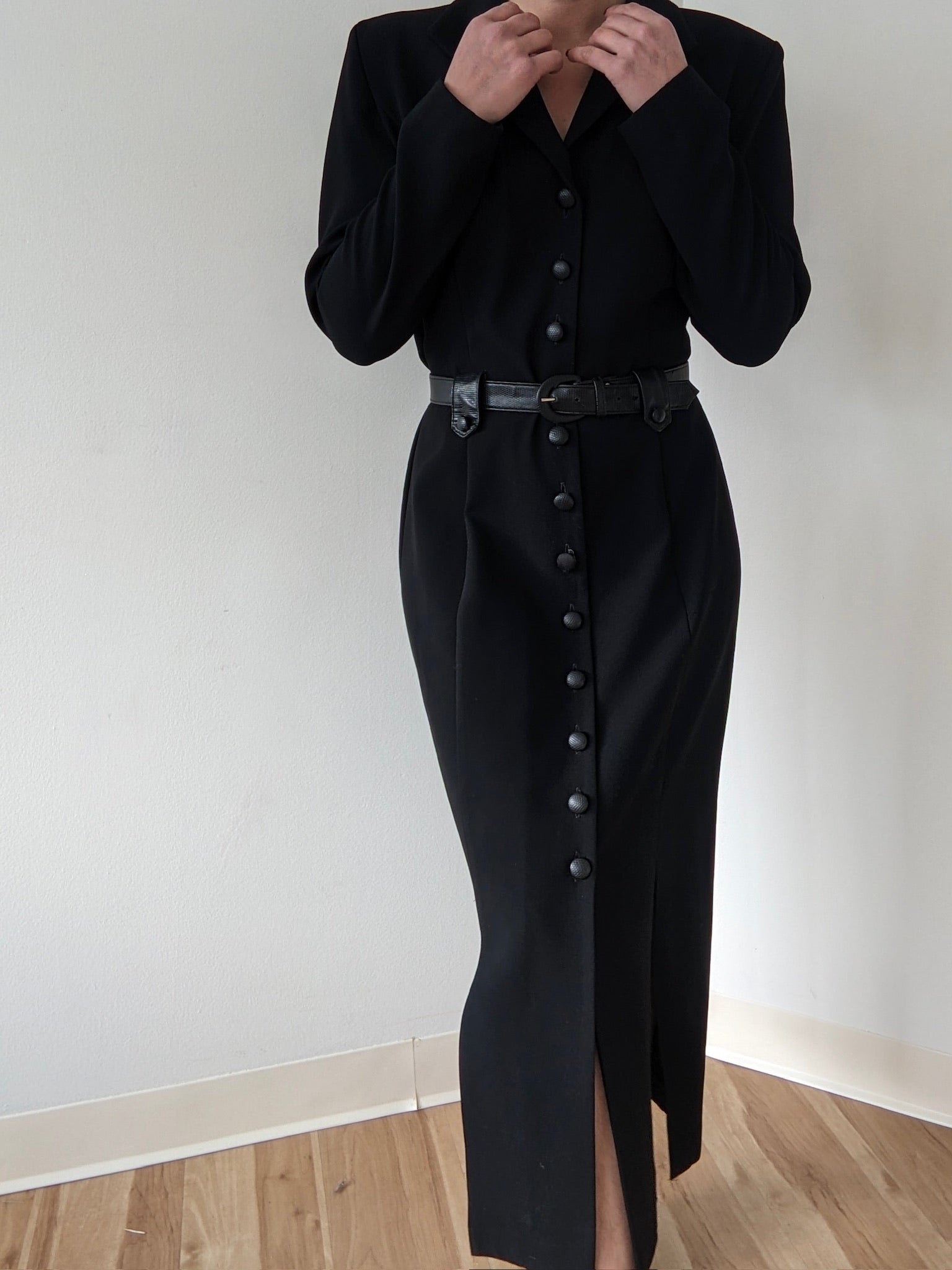 Amazing vintage onyx dress in a micro-ribbed fabric with our favorite belted design. Dress has a collared neckline, faux leather buttons up the entire front, faux leather belt loop around the waist and multiple slits at the bottom.