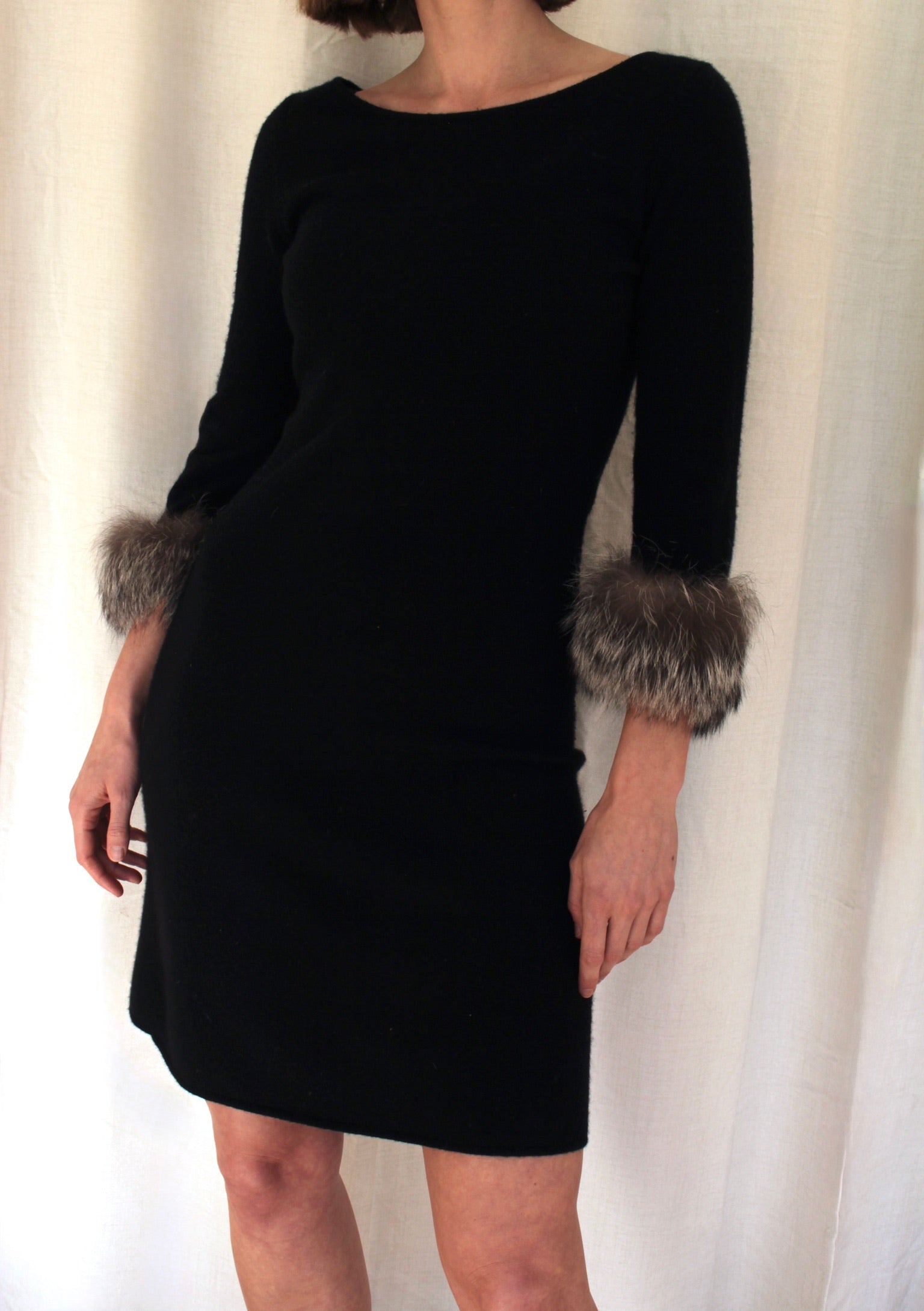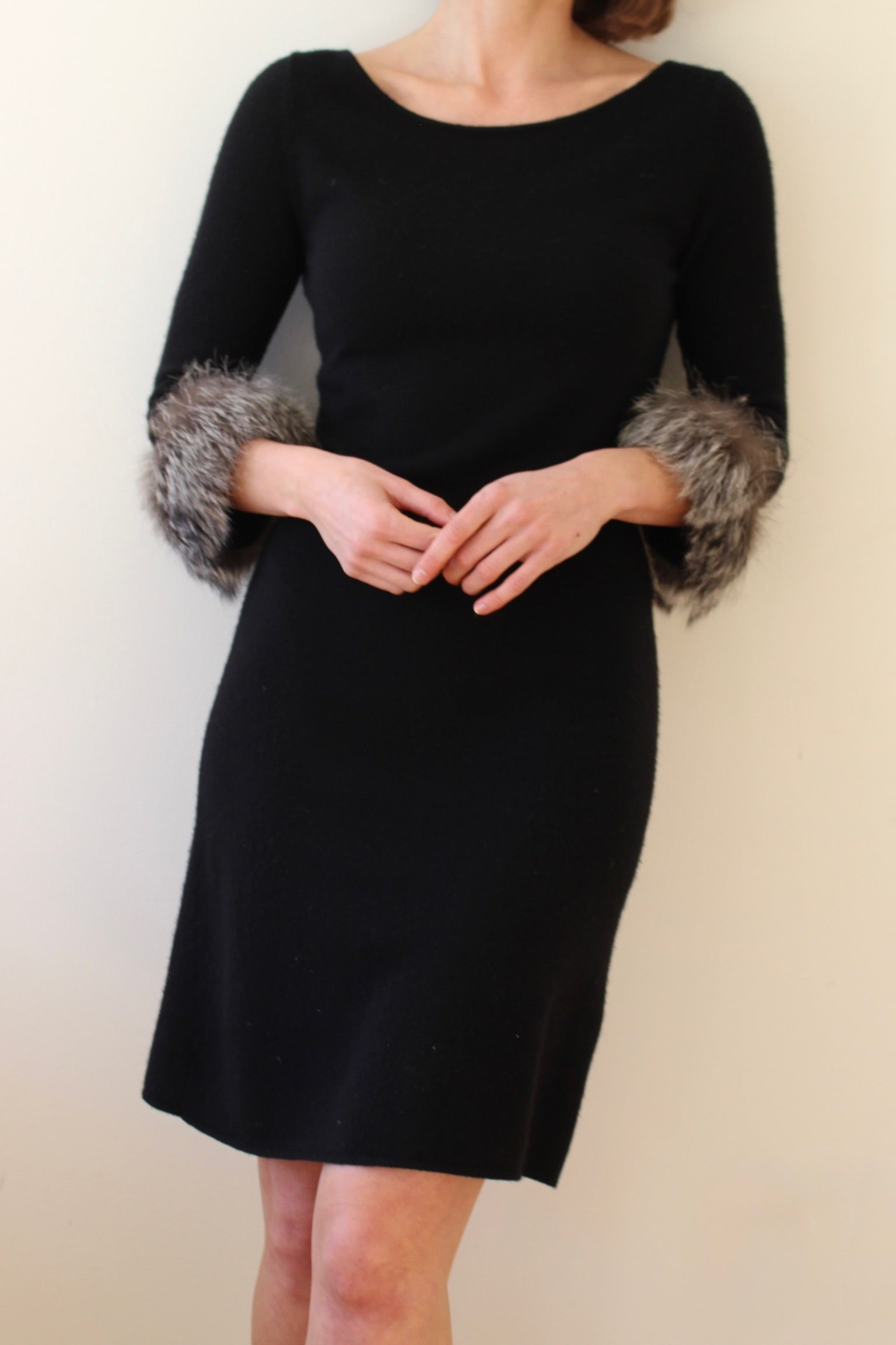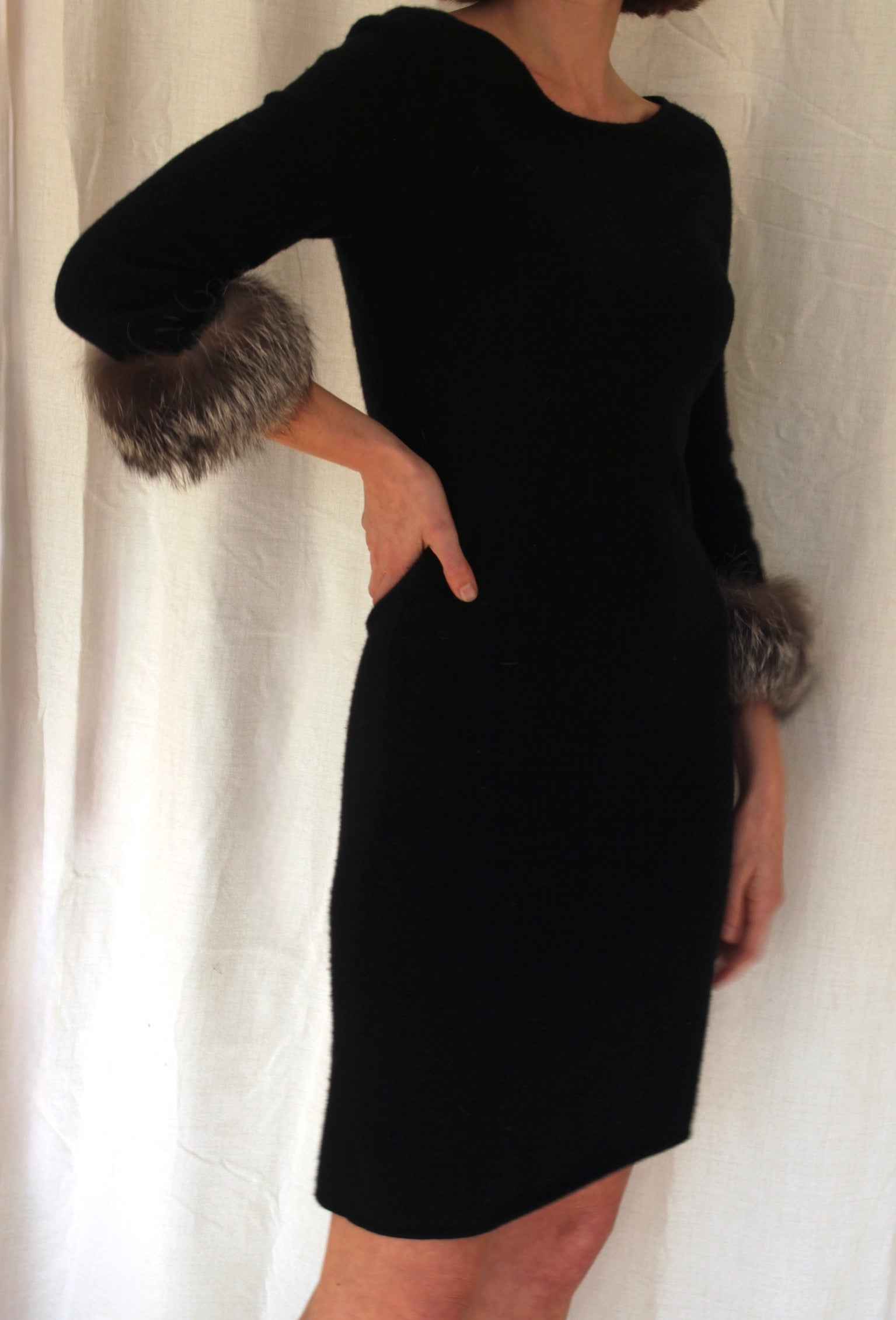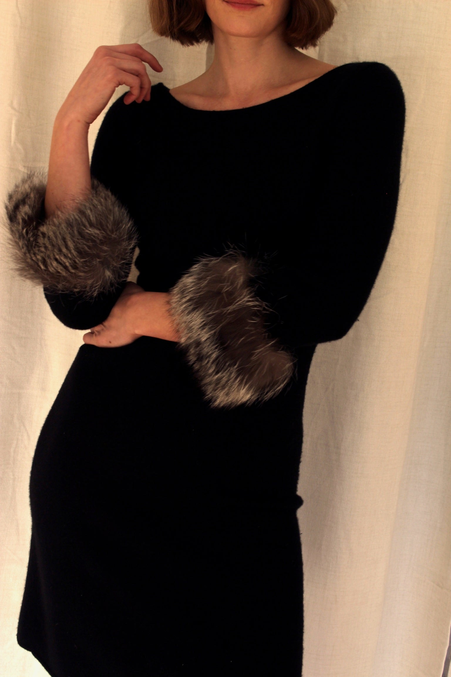 Absolutely amazing vintage sweater dress made of a luxurious cashmere fabric. Dress has a sweet & flattering fit with scooped neckline and lovely, fox fur trim at the cuffs.