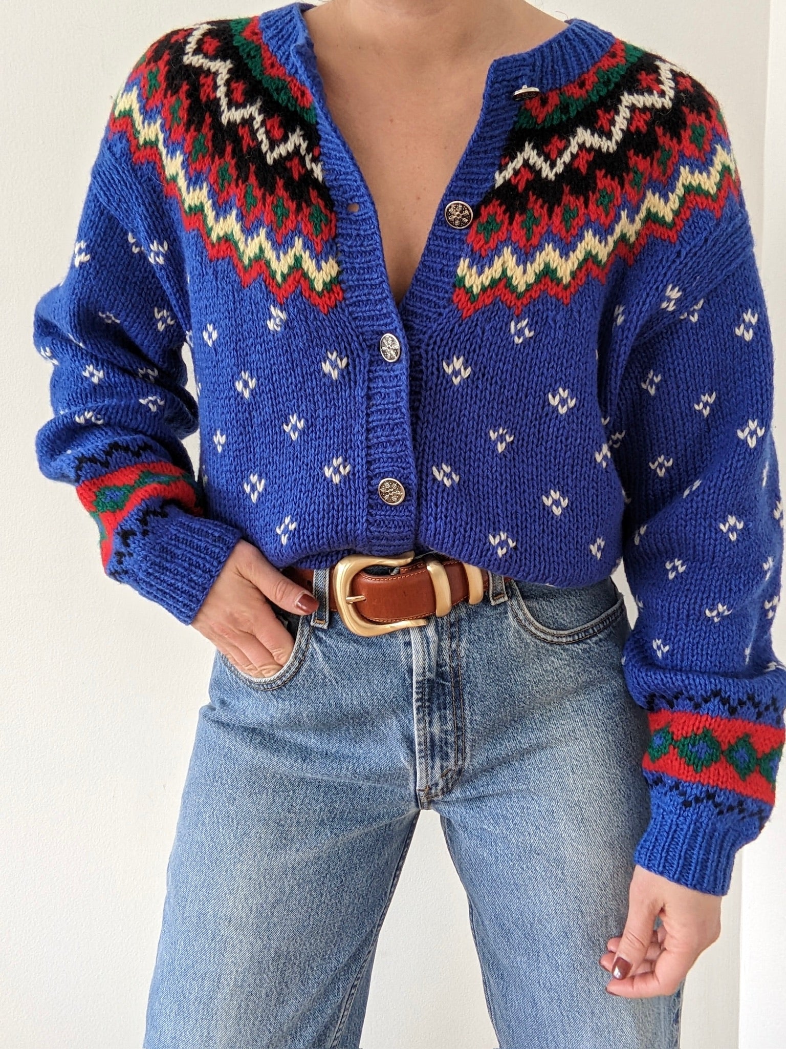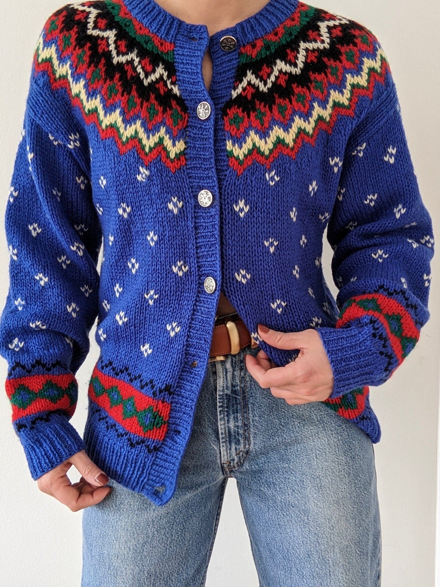 Absolutely amazing vintage sweater by Eddie Bauer in the best fair isle pattern & thick, knitted wool fabric! Cardigan is set in a bold blue with vibrant red & green accents. Features snowflake-embossed buttons up the front and a perfectly relaxed fit with dropped shoulder seams.