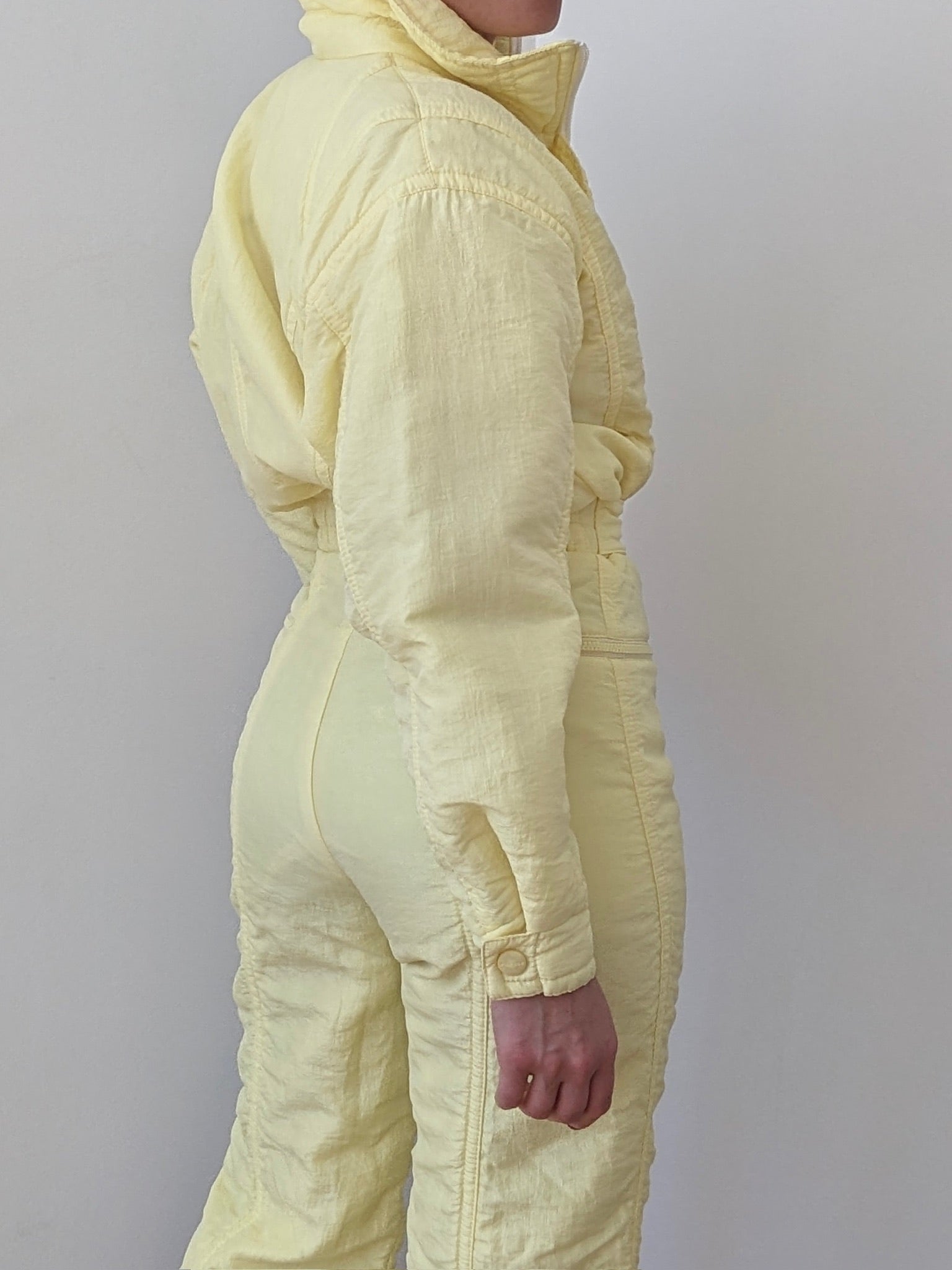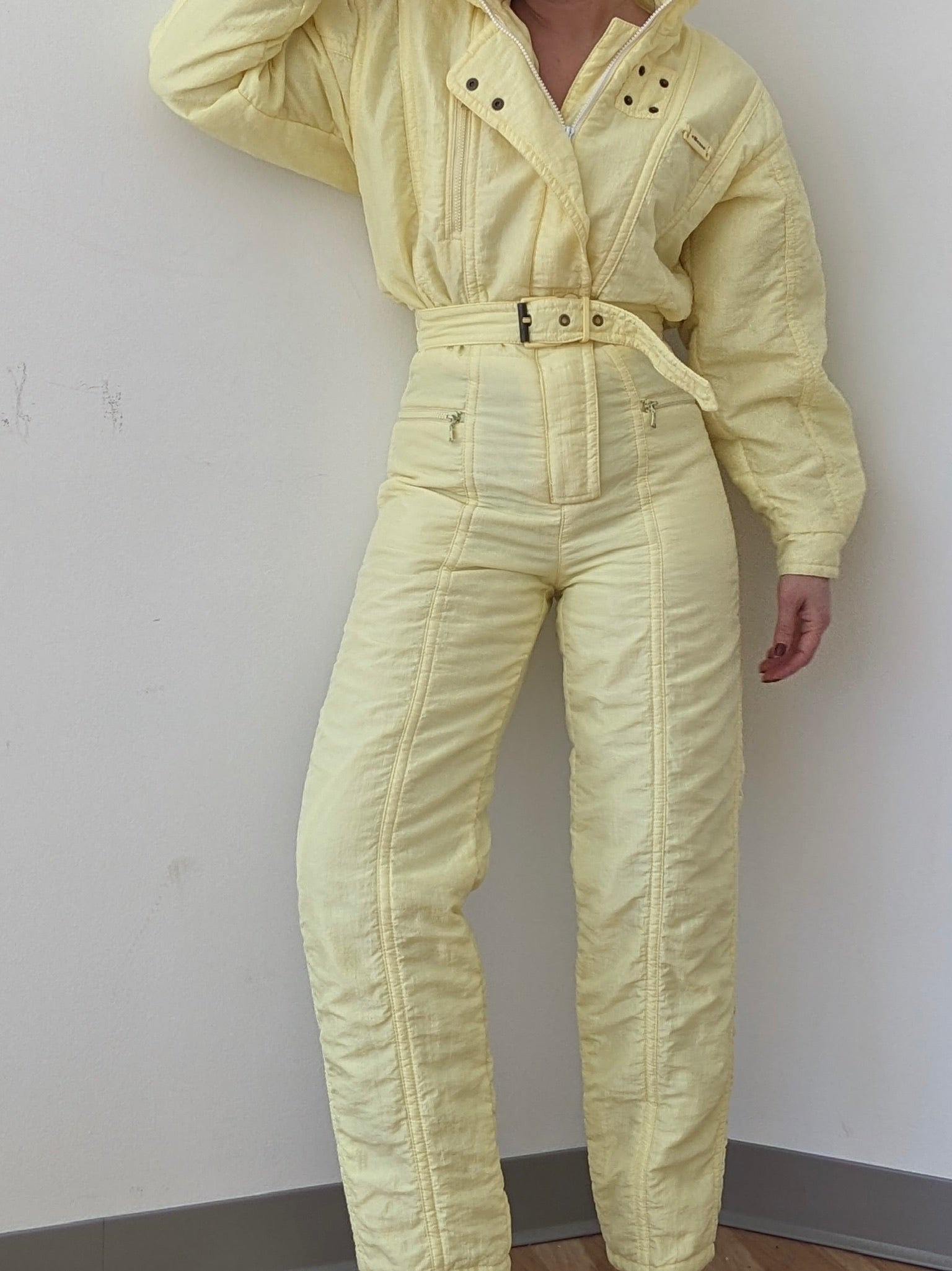 Absolutely amazing vintage ski suit by Ellesse in a fun lemon yellow color! Ski suit has all of our favorite & thoughtful details. Features a zip closure up the front, unique zippered front-to-back side pockets, a matching waist belt and a comfortable elastic fit at the waist. Includes a lined & padded interior for added warmth and comfort as well as zippered leg vents and a vertial chest pocket.