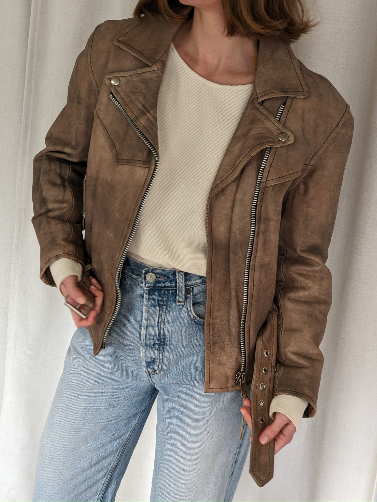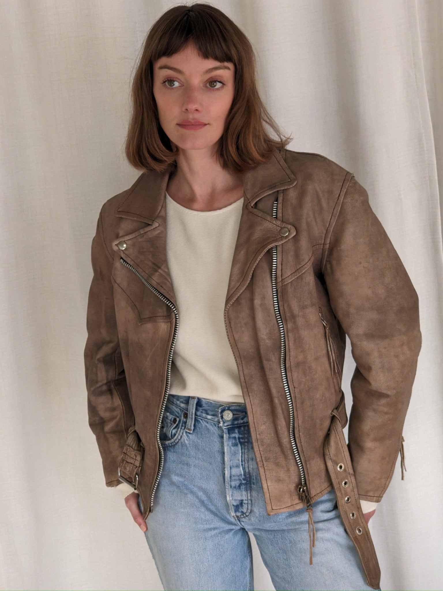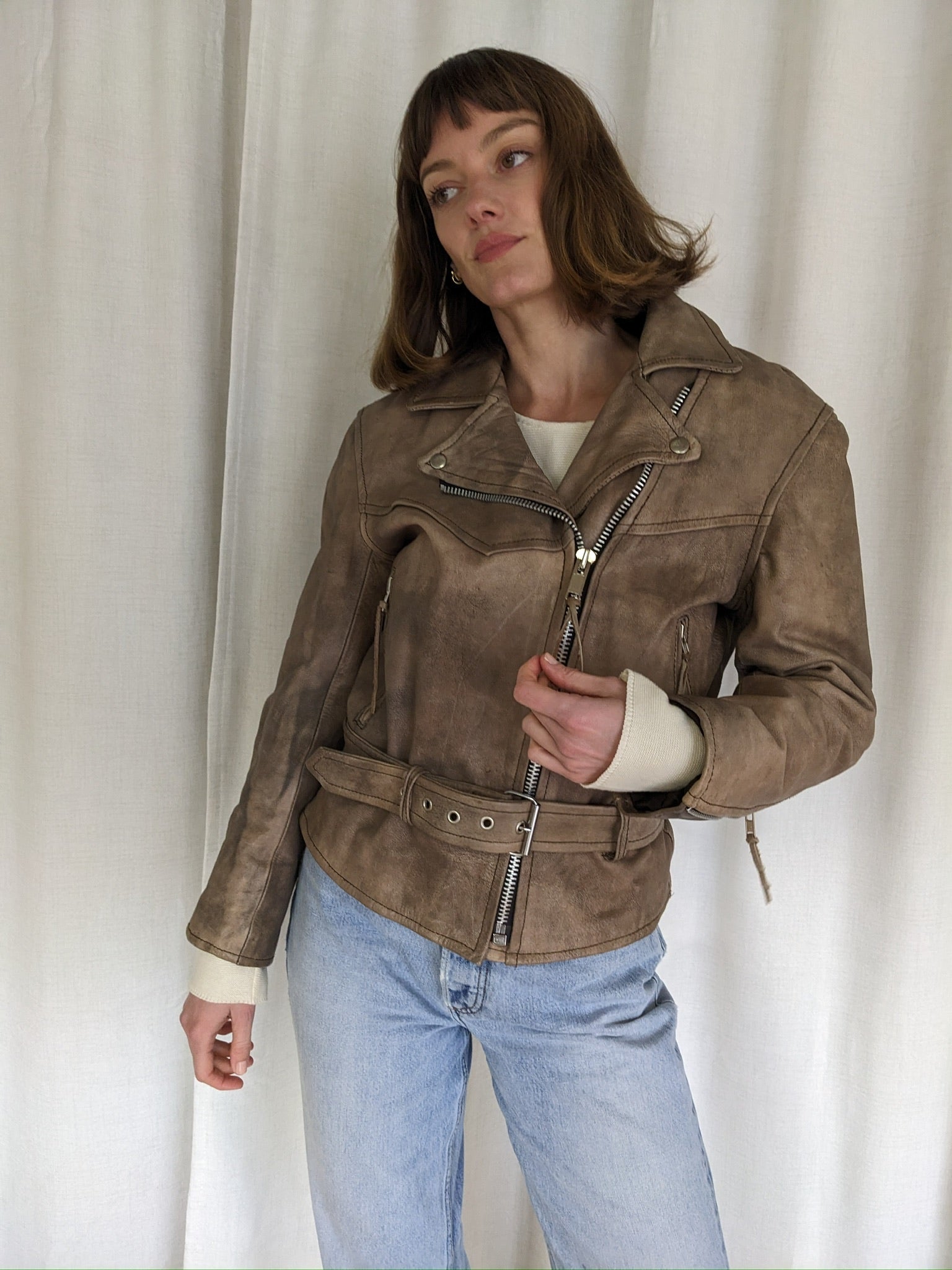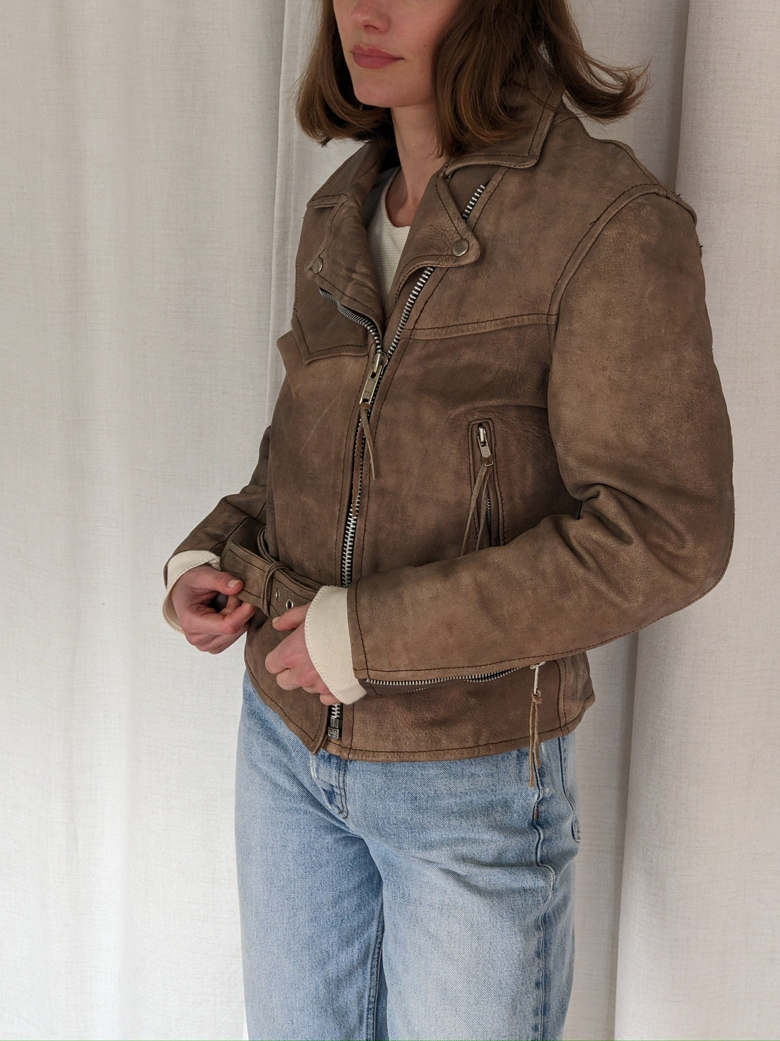 Perfectly faded almond brown moto jacket in a heavyweight leather. Jacket has a notched collar, front zip closure, side pockets and the best belted waist detail.