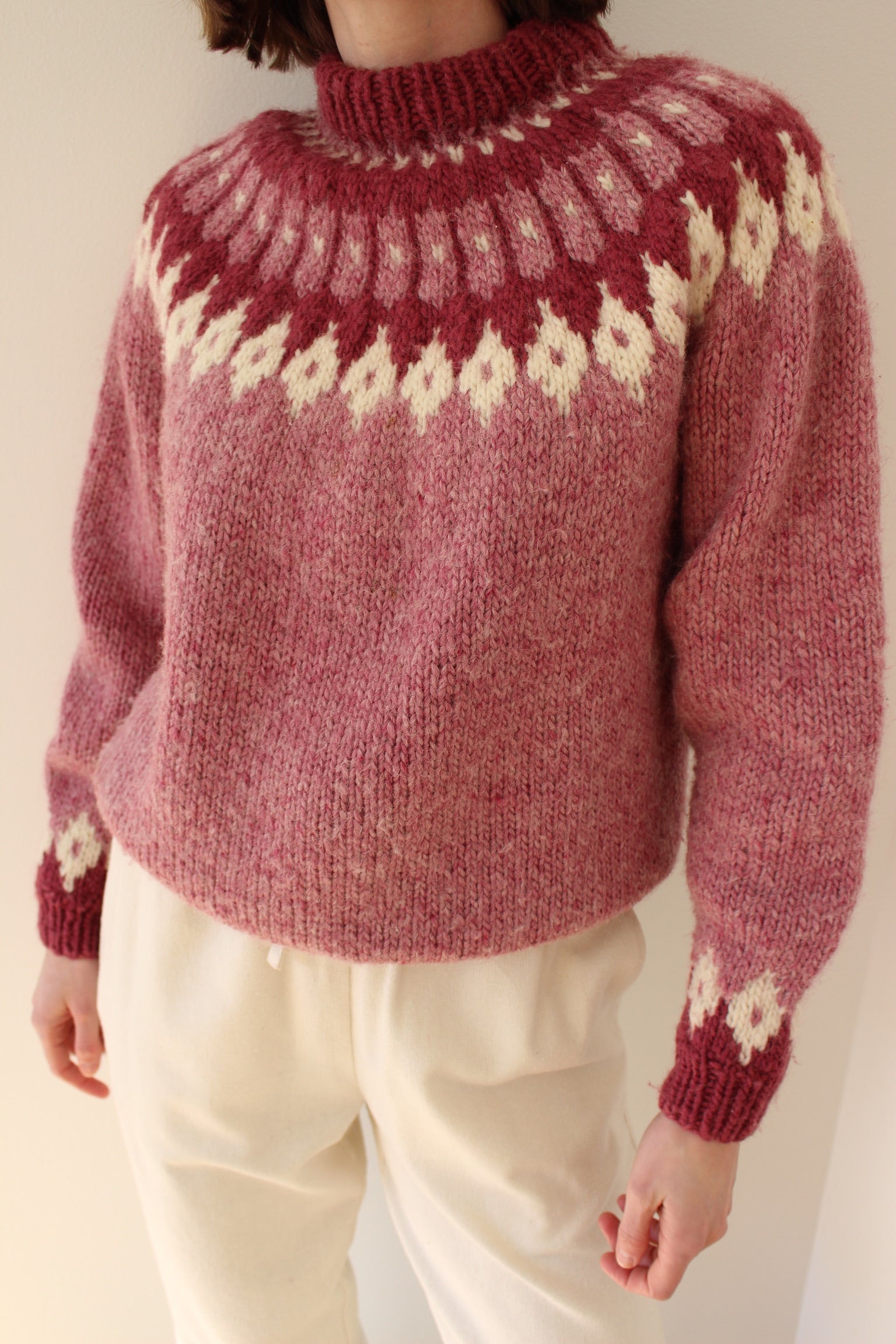 An amazing vintage knit! This multi-pink tone sweater is made of a plush wool yarn in a classic fair isle pattern. Features a high-cut neckline and raglan seams.