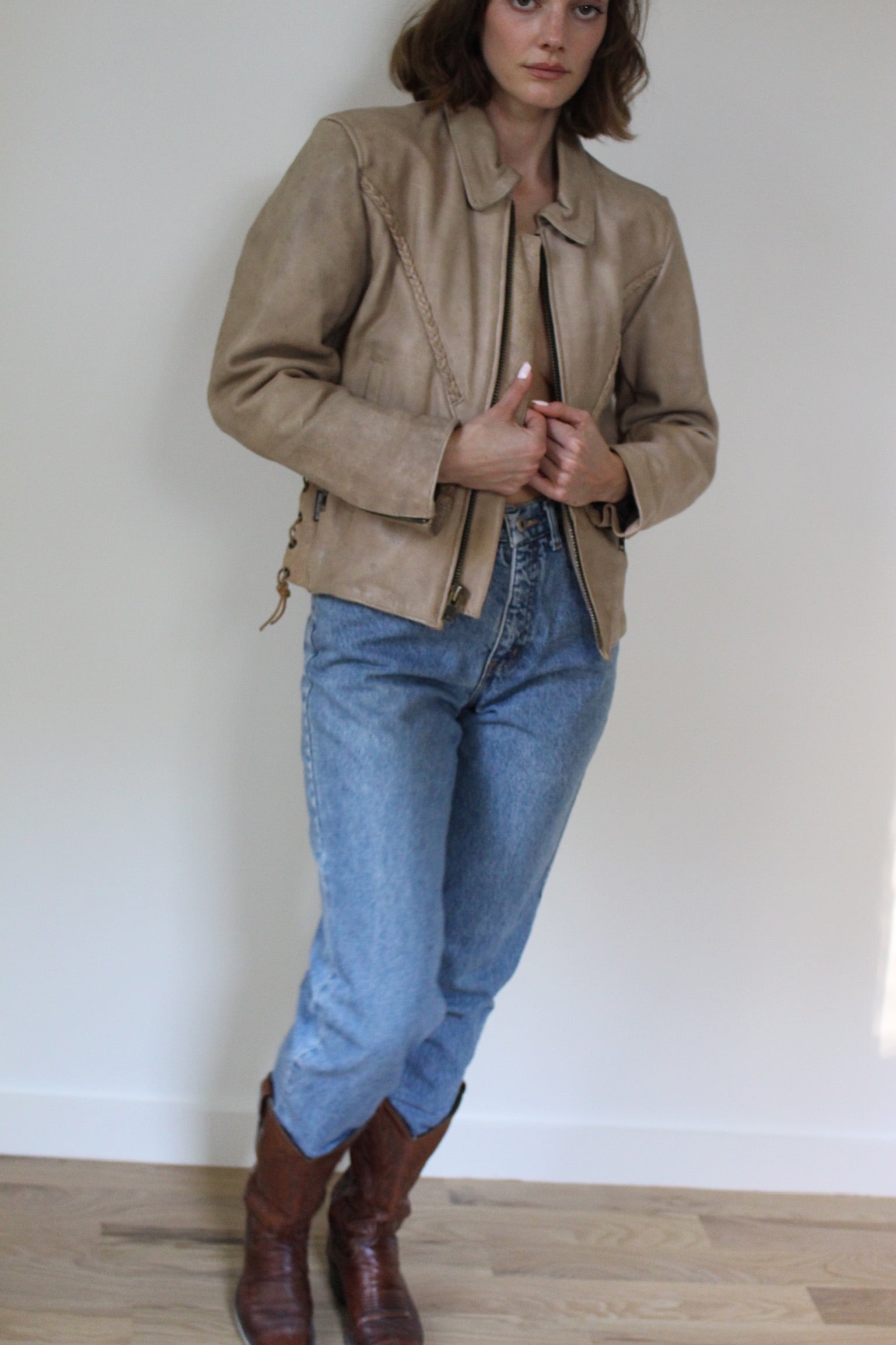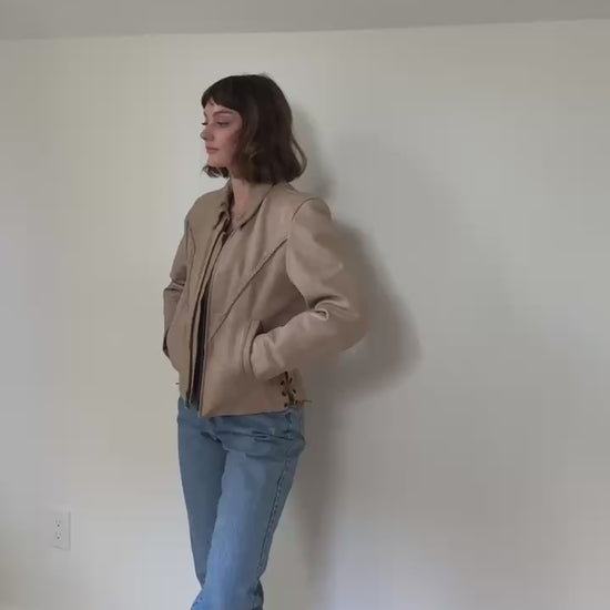 Amazing vintage jacket in a heavyweight, smooth leather & perfectly neutral sand color. Jacket has fun details such as lace-up accents at the side seams, a cinched & vented back and braided seams along both front & back body! Features a collared neckline, full zip closure, pockets and a lined interior.