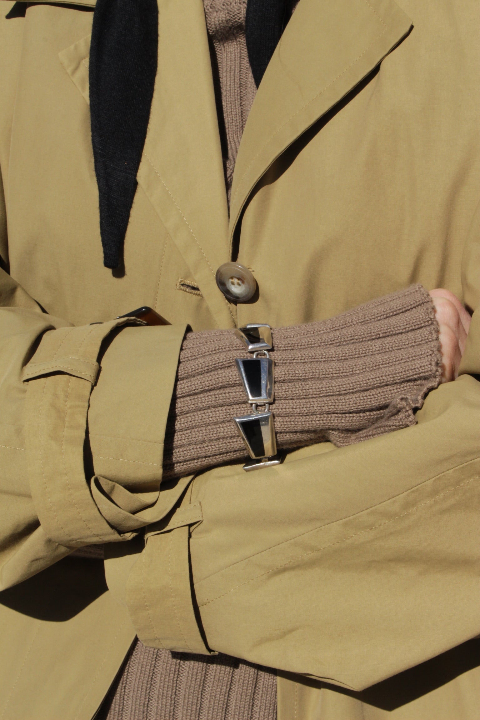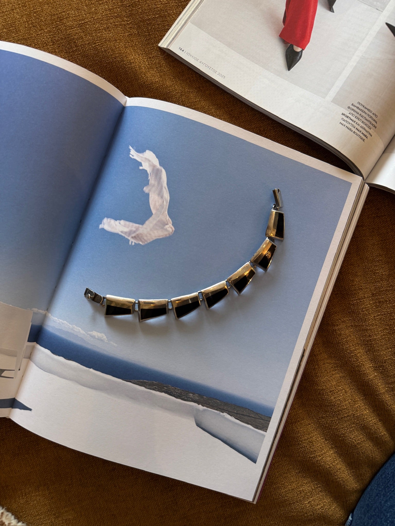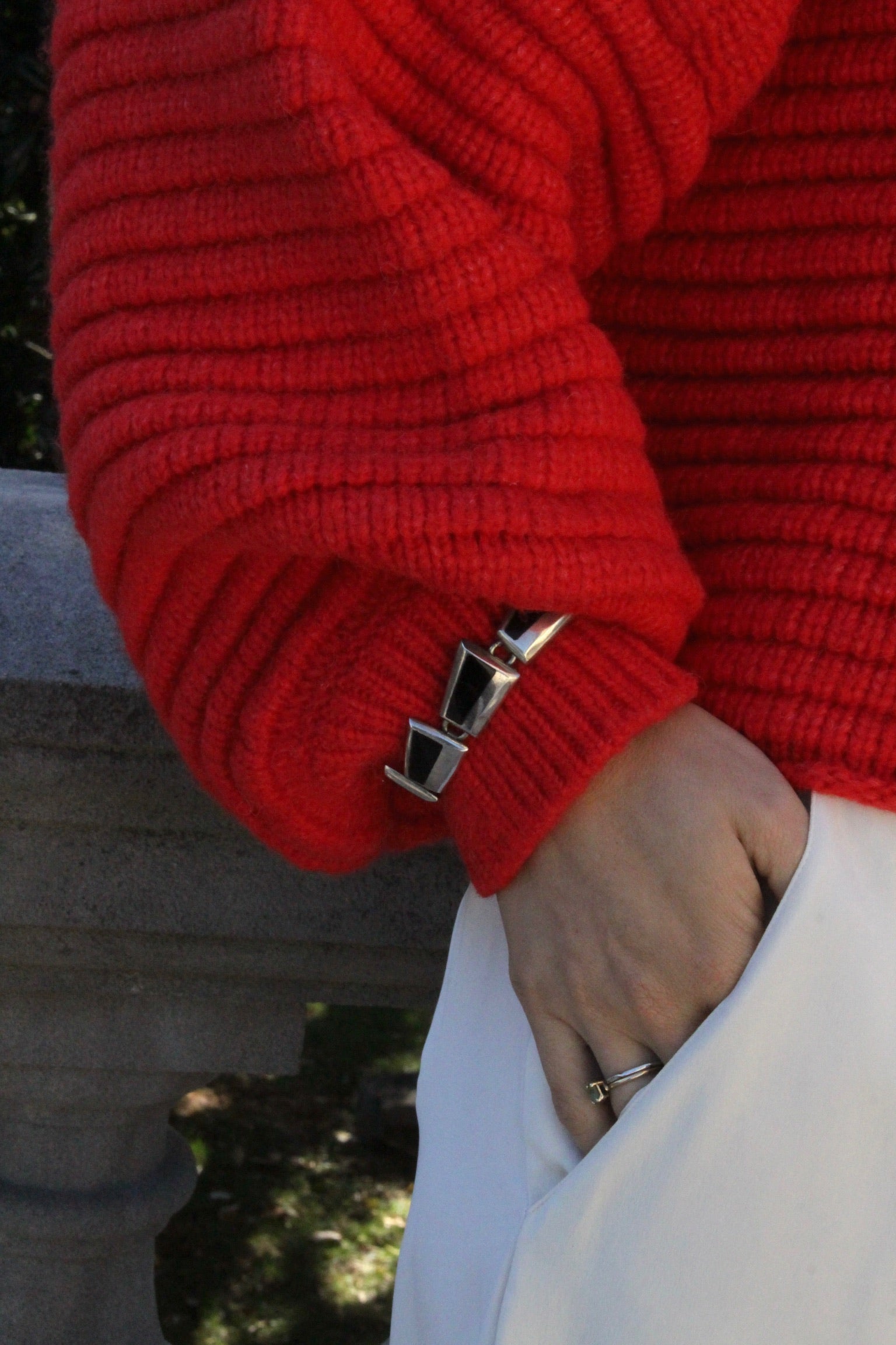 Amazing vintage bracelet in a bold, geometric design made out of thick sterling silver with onyx inlay. Bracelet has a link design and an elegant box clasp.