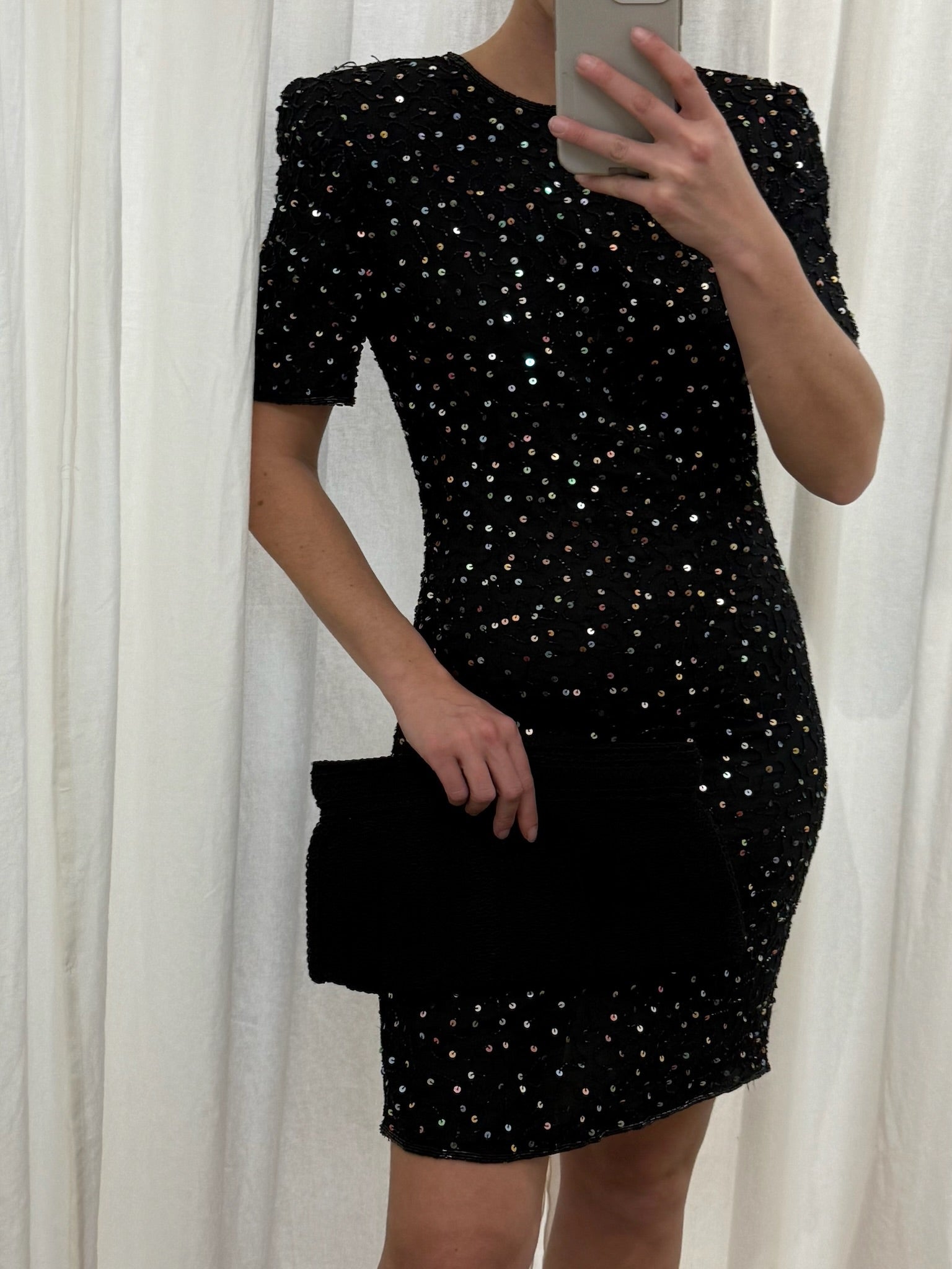 Beautiful vintage onyx dress in black with fun beaded & sequinned embellishments throughout. Dress has a crew neckline, zip closure at the back, padded shoulders and a lined interior.