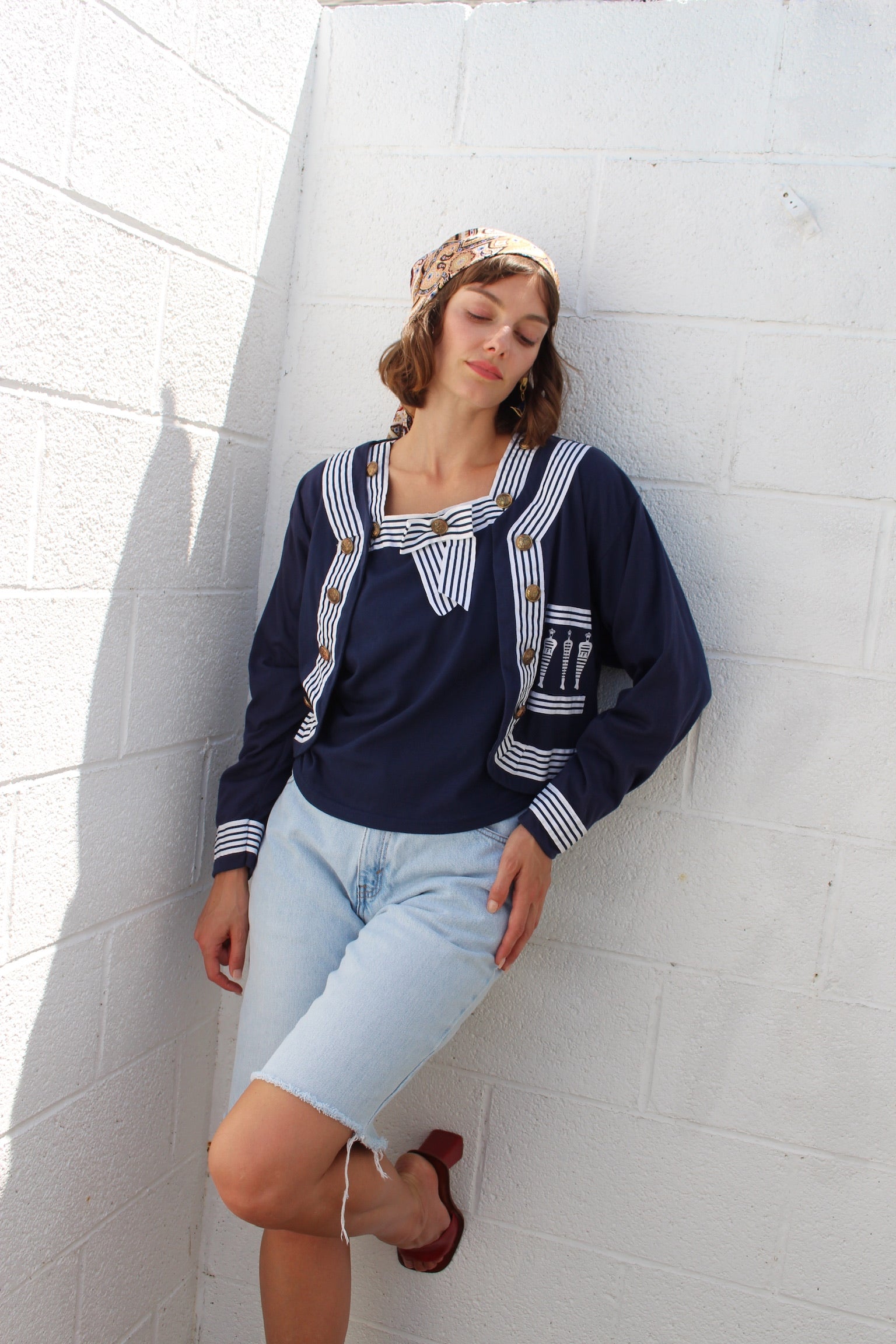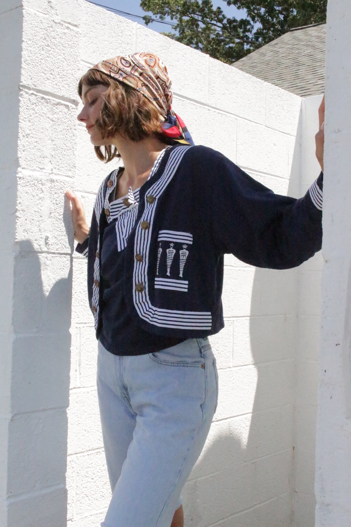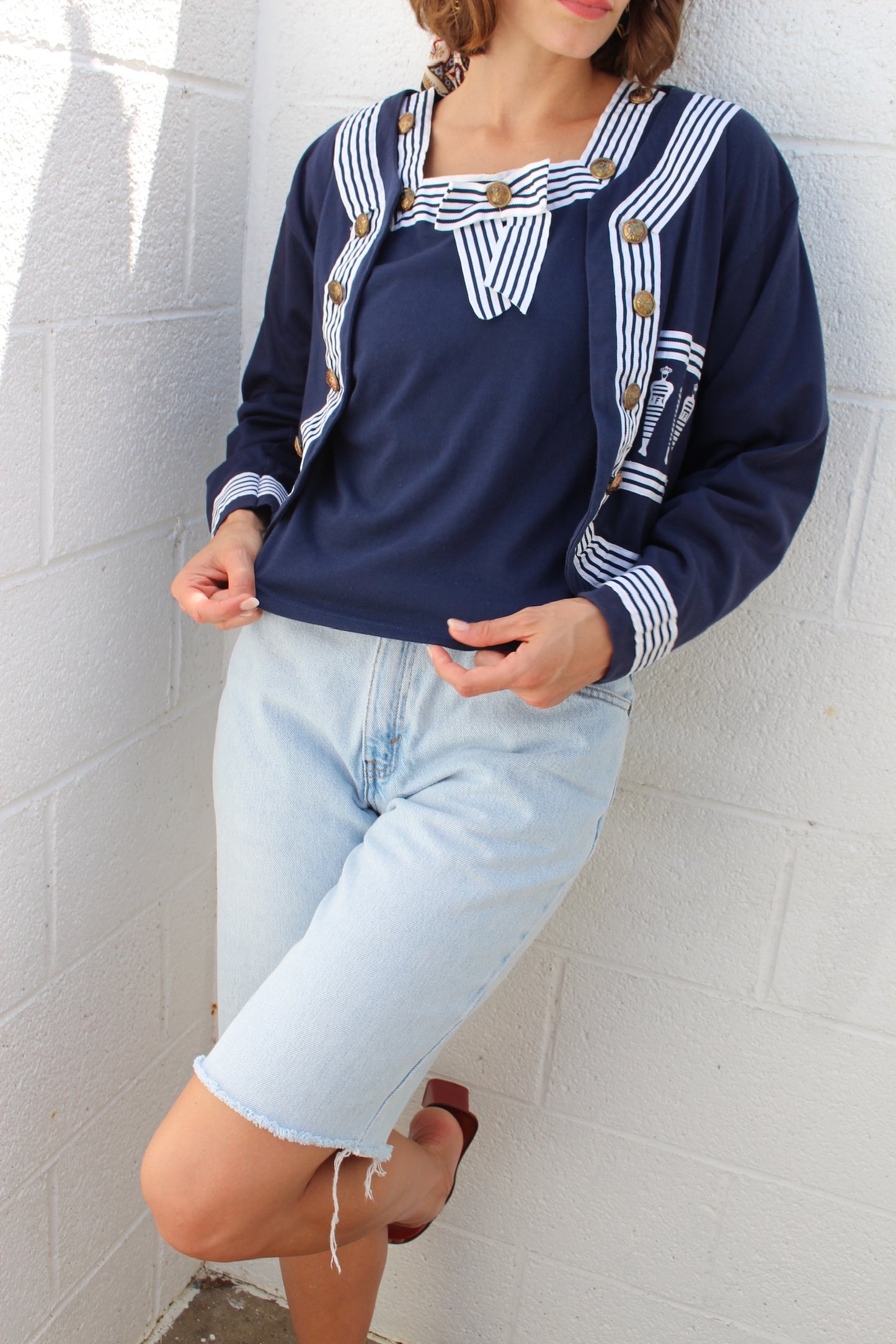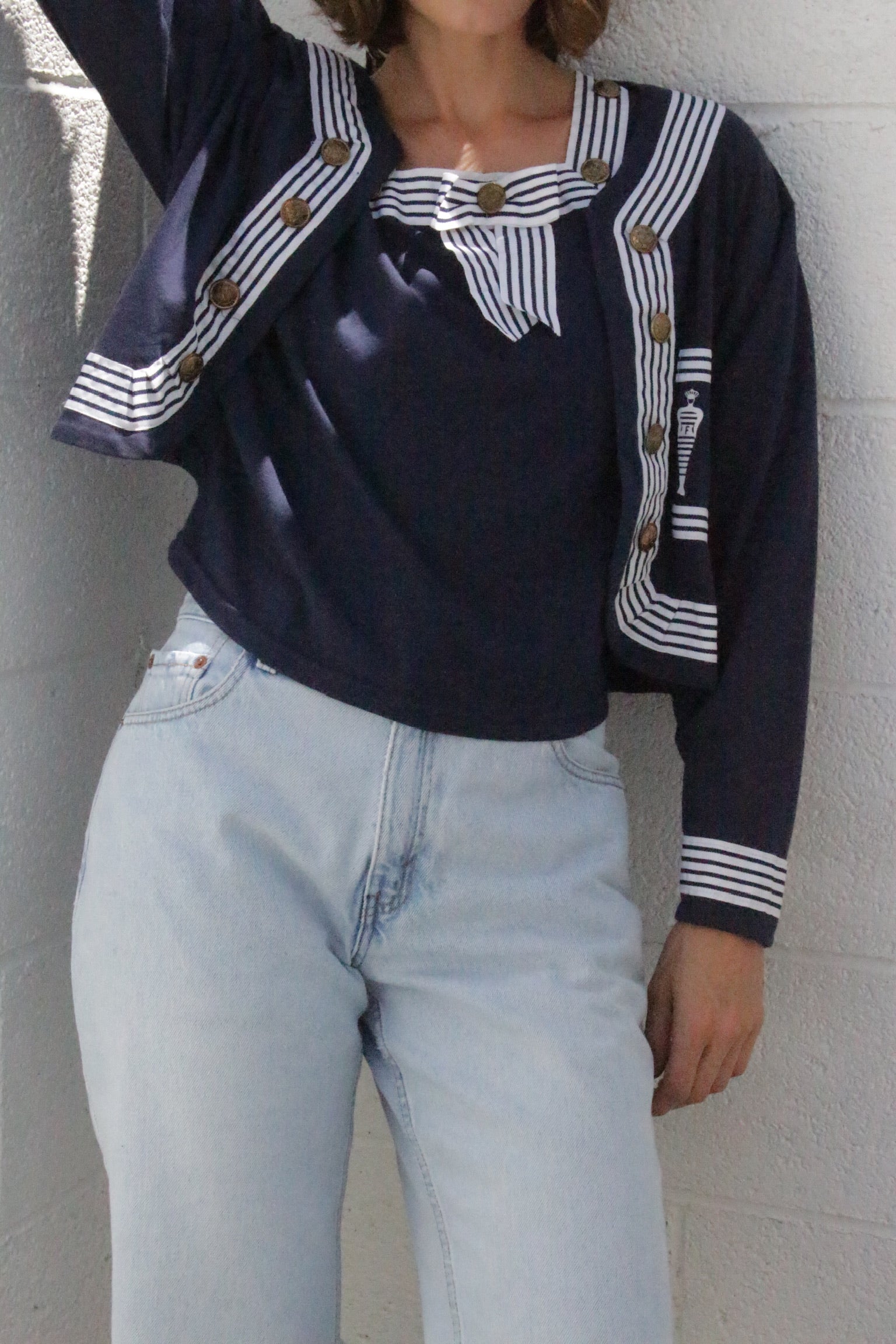 Beautiful Vintage Navy & Ivory Trimmed Cardigan Set