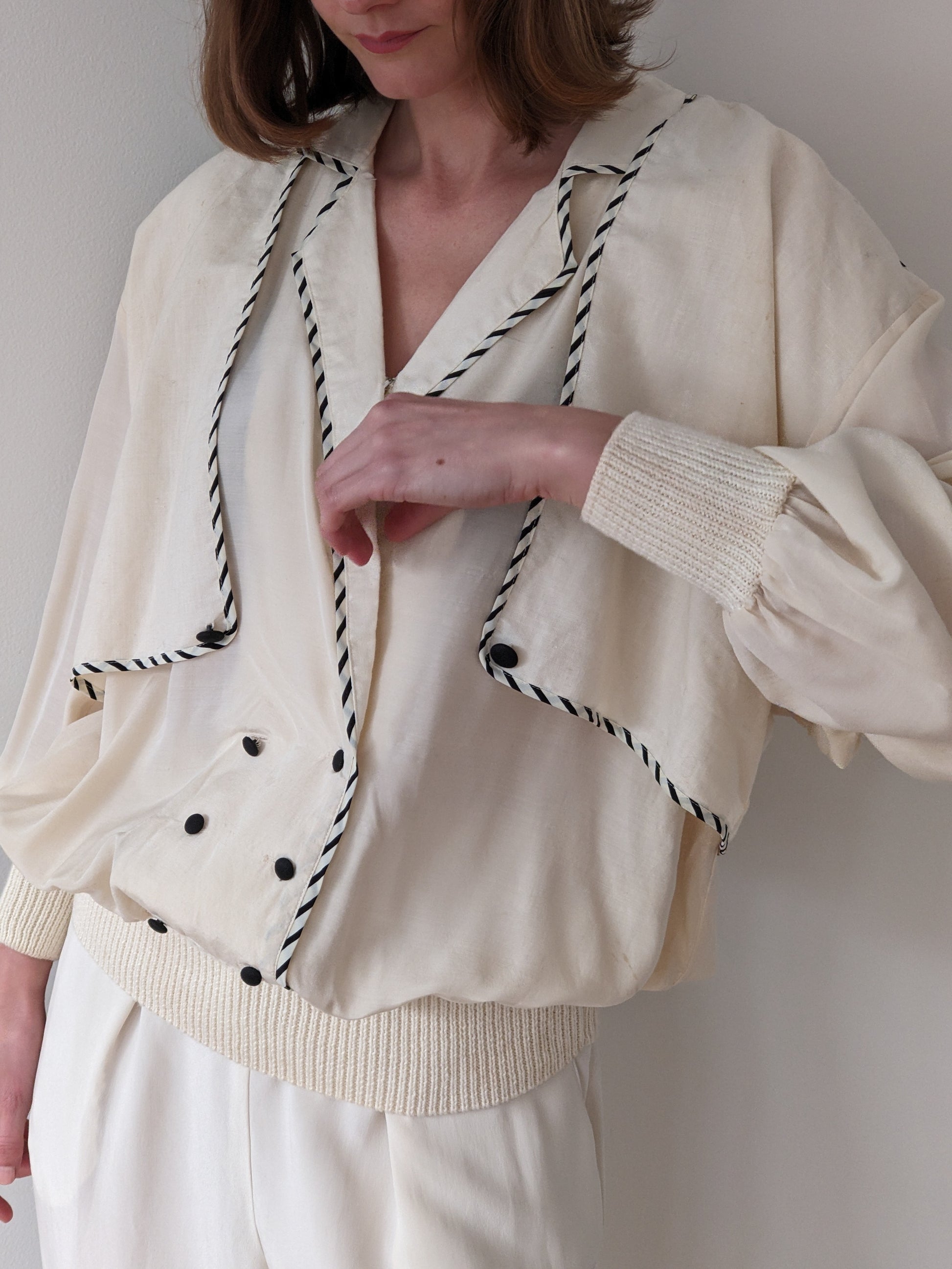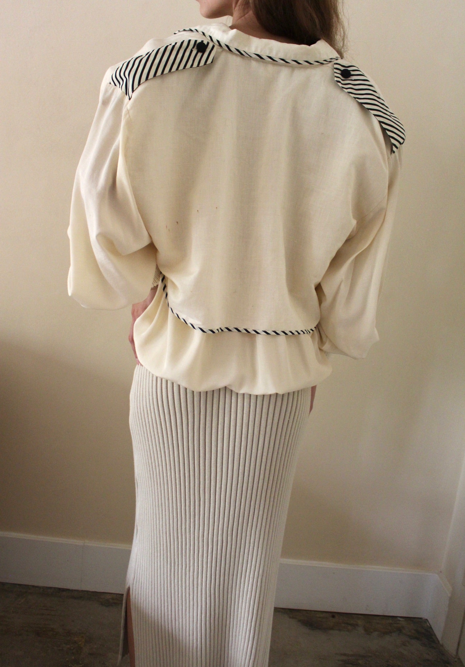 Absolutely stunning vintage popover blouse in a unique design! Features a woven silk body with striped edges & shoulder panels as well as a cinched knit waist hem & cuffs. Blouse has elegant double-breasted buttons at the lower front and flaps at chest & upper back.