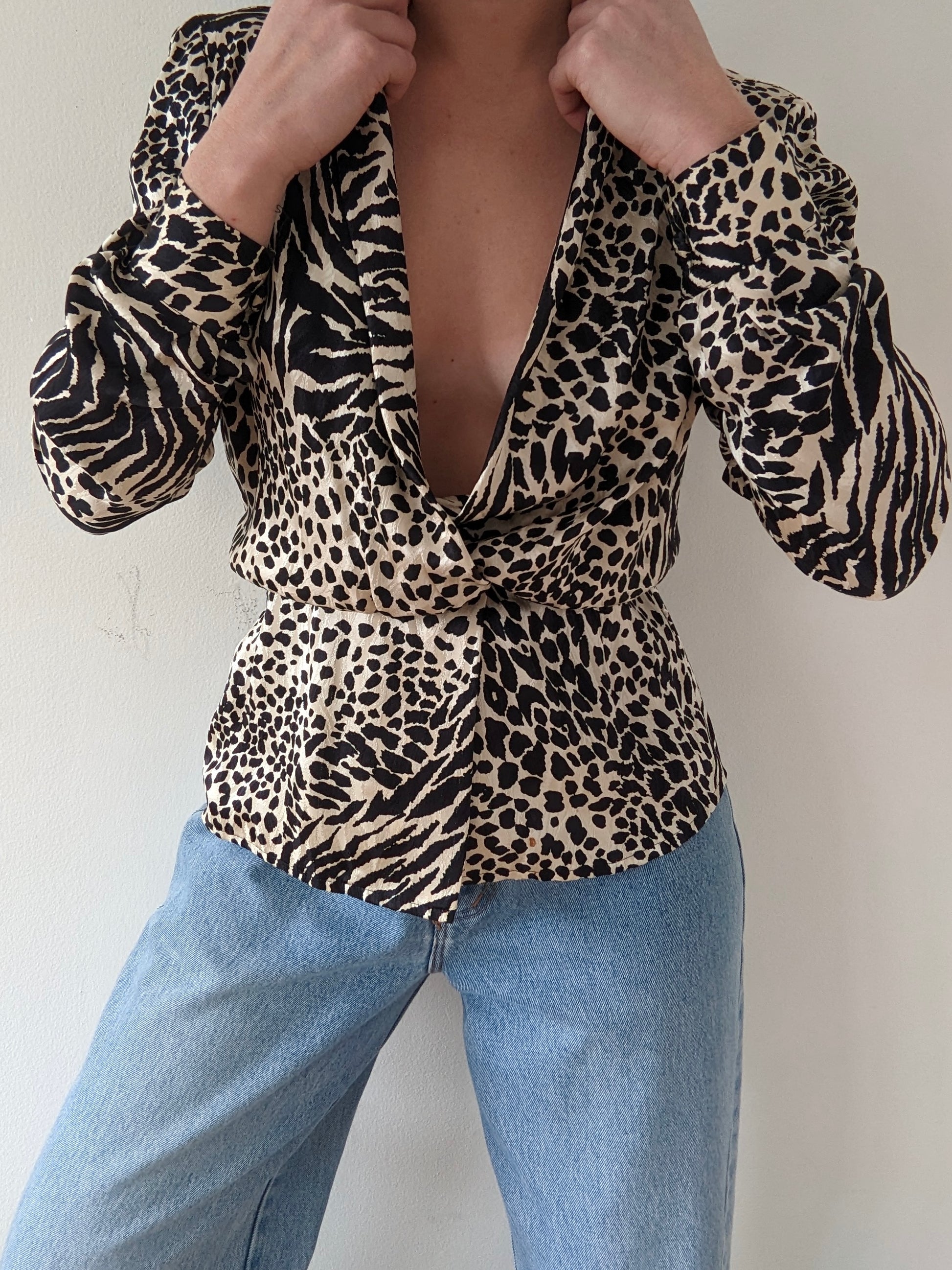 Lovely vintage blouse in a bold, animal-printed silk. Blouse has a low draped neckline, closures at the cuffs and hidden snap closures at the waistline.