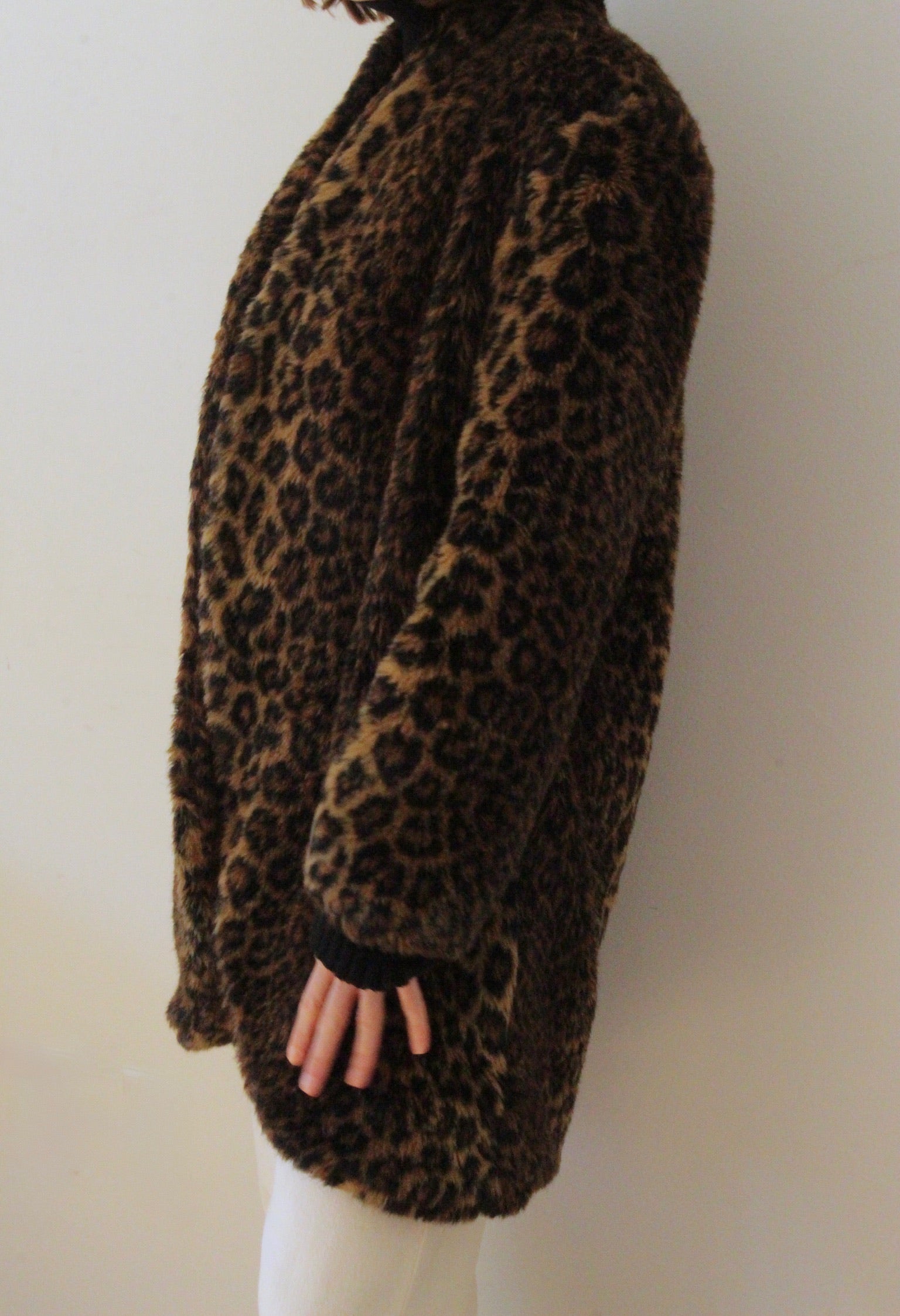 Fun & bold vintage coat in a plush, faux fur fabric and leopard pattern. Coat has an open design with side pockets and a lined interior.