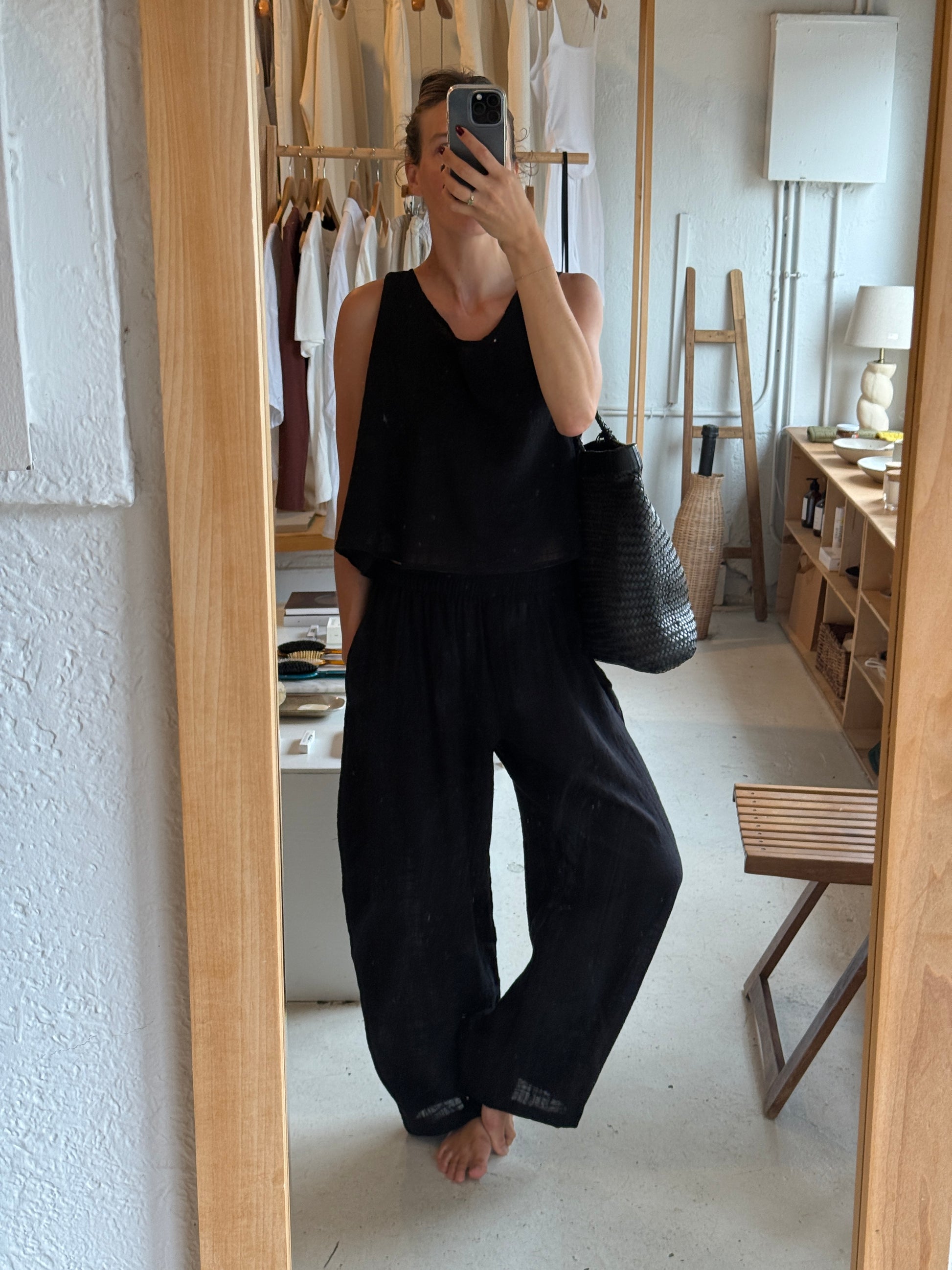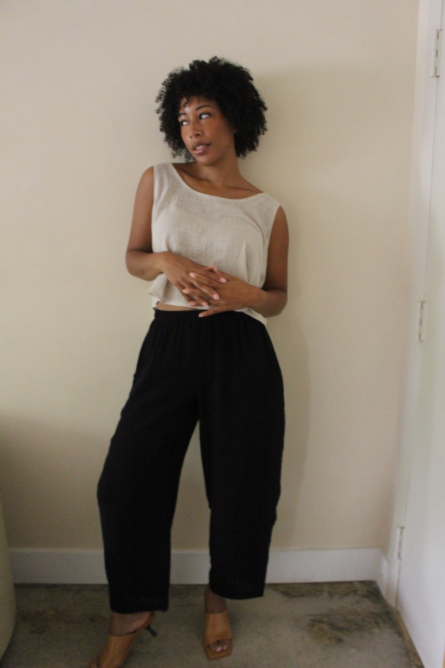 The Camden Cotton Gauze Pant offers a relaxed fit with a subtly bowed silhouette. It features a soft elastic waistband with an adjustable inner drawcord and practical side pockets to keep essentials close. Its distinctive, refined shape draws inspiration from vintage styles, while the ultra-soft cotton gauze fabric ensures a breathable, lightweight feel that combines comfort with elegance.
