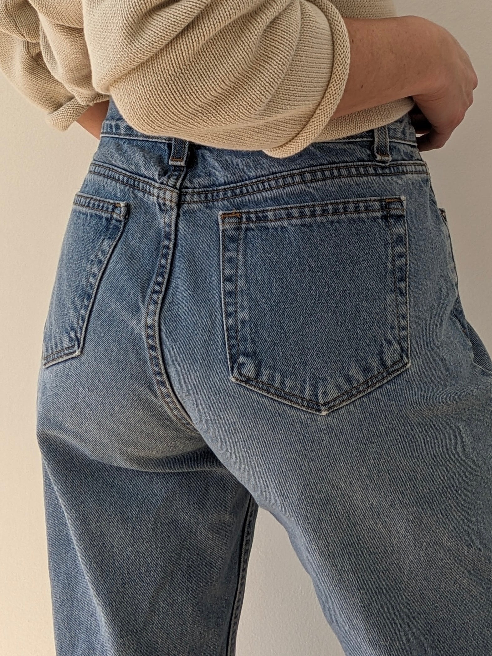 Classic vintage blue jeans in a perfectly faded medium wash. Jeans have a mid-rise fit with belt loops, a 5-pocket structure and a straight leg.