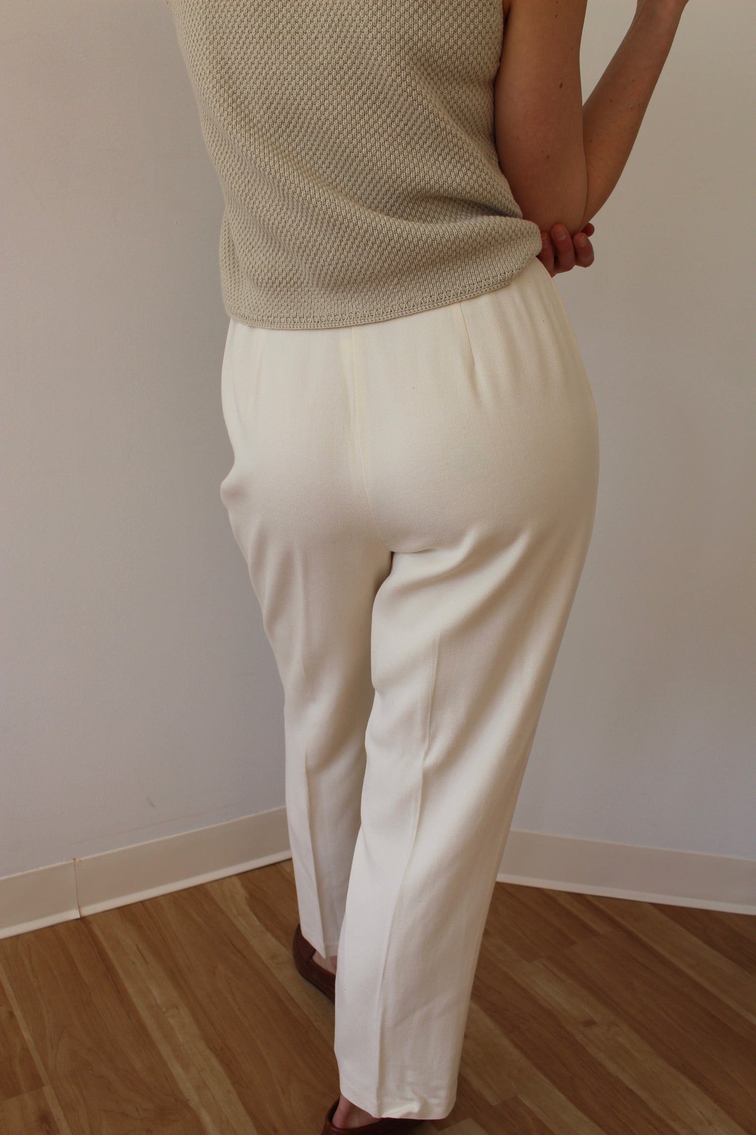 Classic vintage trousers in a lovely cream tone & perfectly lightweight wool crepe fabric. Trousers have a pleated design with partial elastic waist, belt loops and side pockets. Includes an interior lining for added comfort.