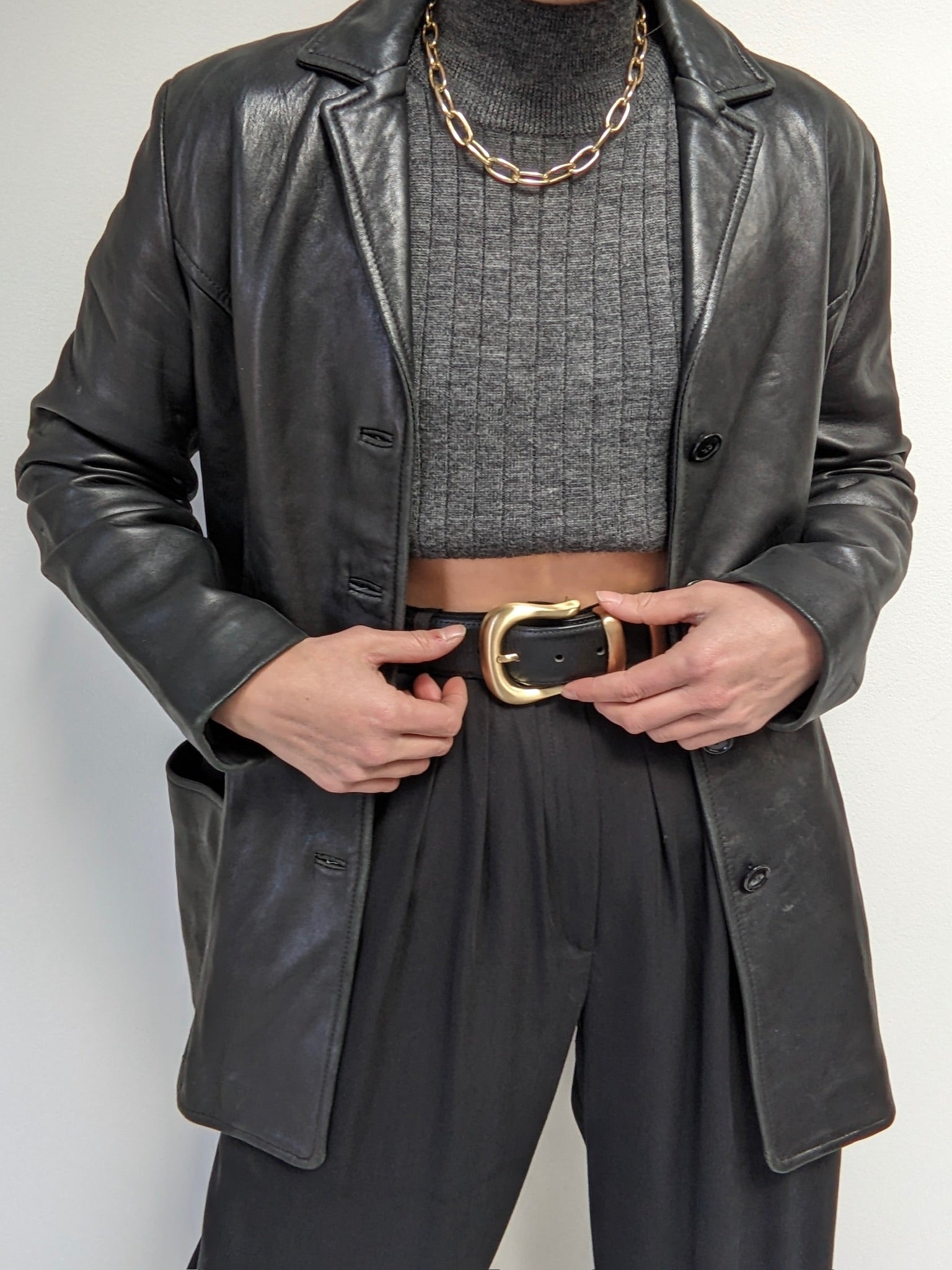 Incredibly supple & smooth leather jacket in a faded black color. Jacket has a blazer cut with notched collar, front buttons, deep pockets and a lined interior.