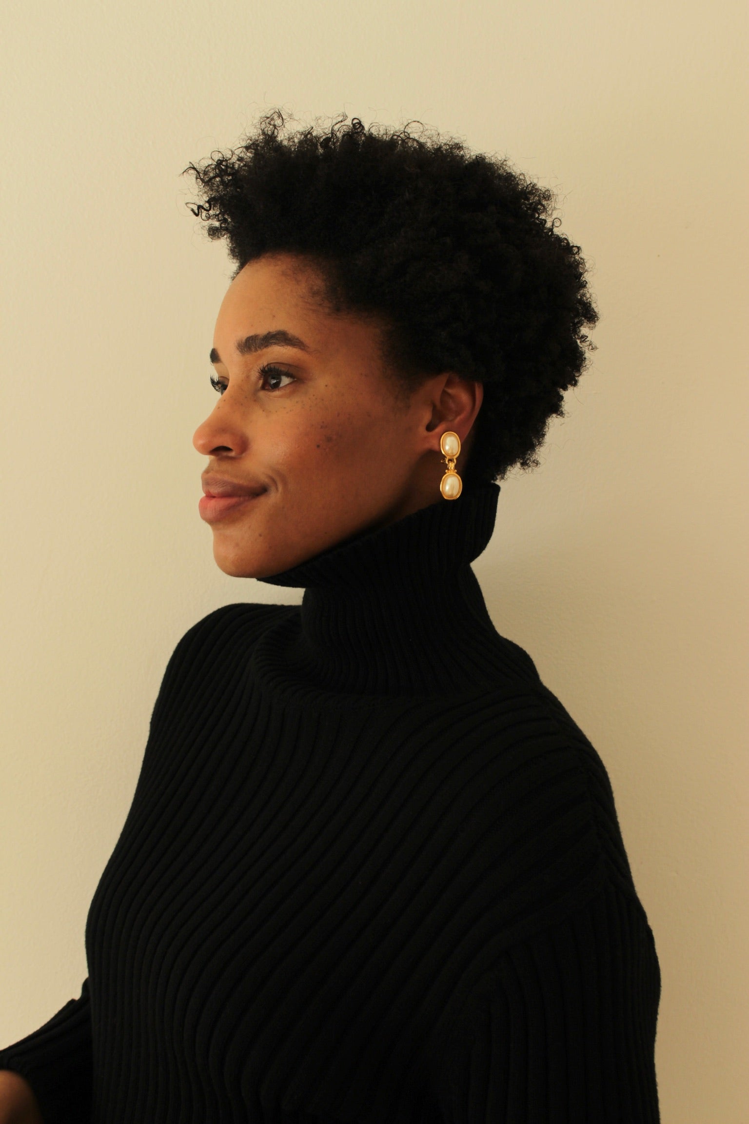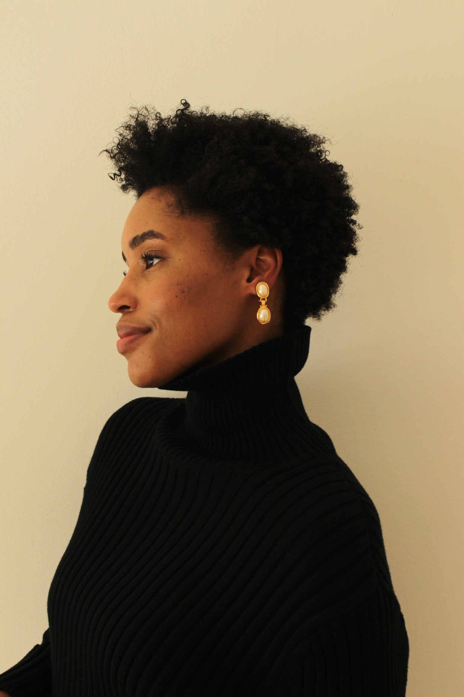 Beautiful vintage clip-on earrings with a classic dropped design. Earrings have bright gold frames around two domed & ultra-smooth faux pearls.