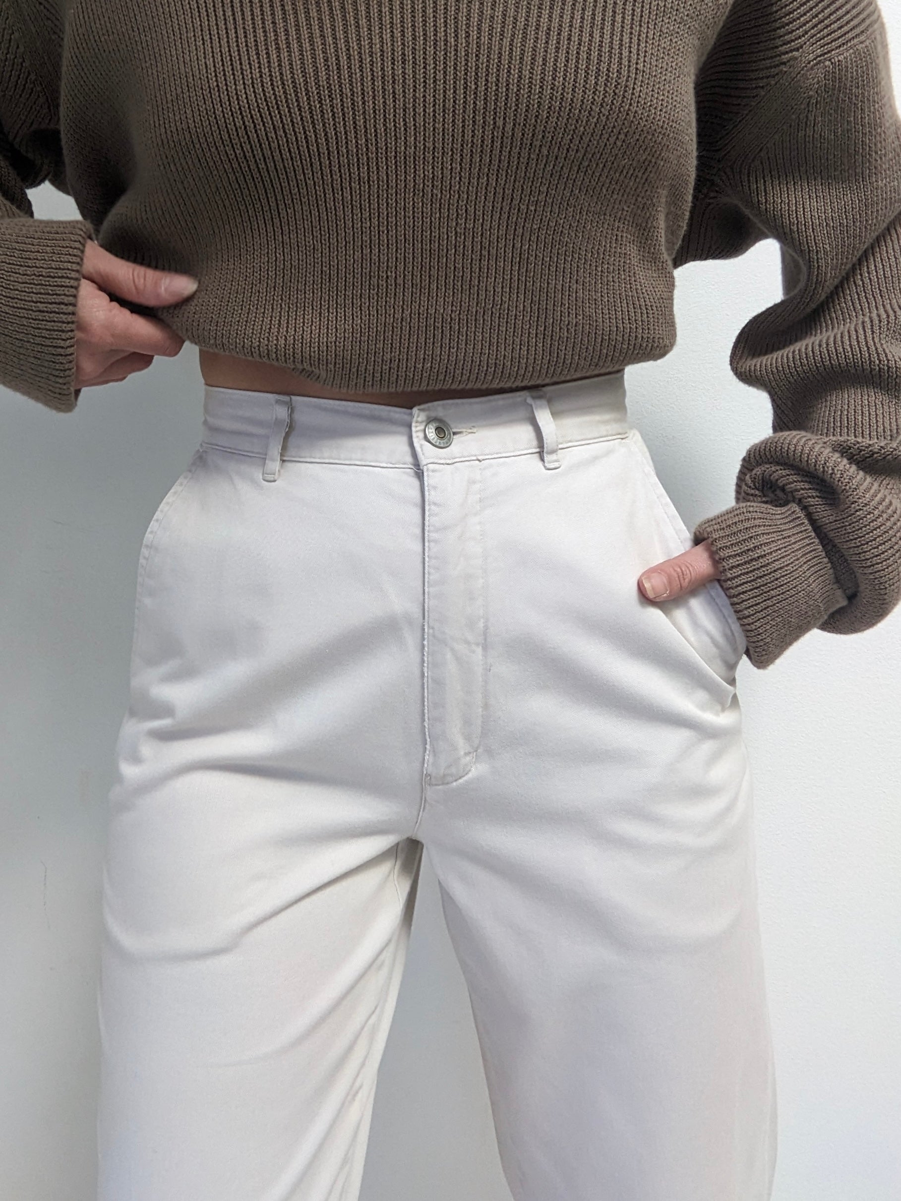Classic vintage pants in a pale khaki cotton with our favorite twilled weave. Pants have a high-rise fit with belt loops, side pockets and a slightly tapered leg.