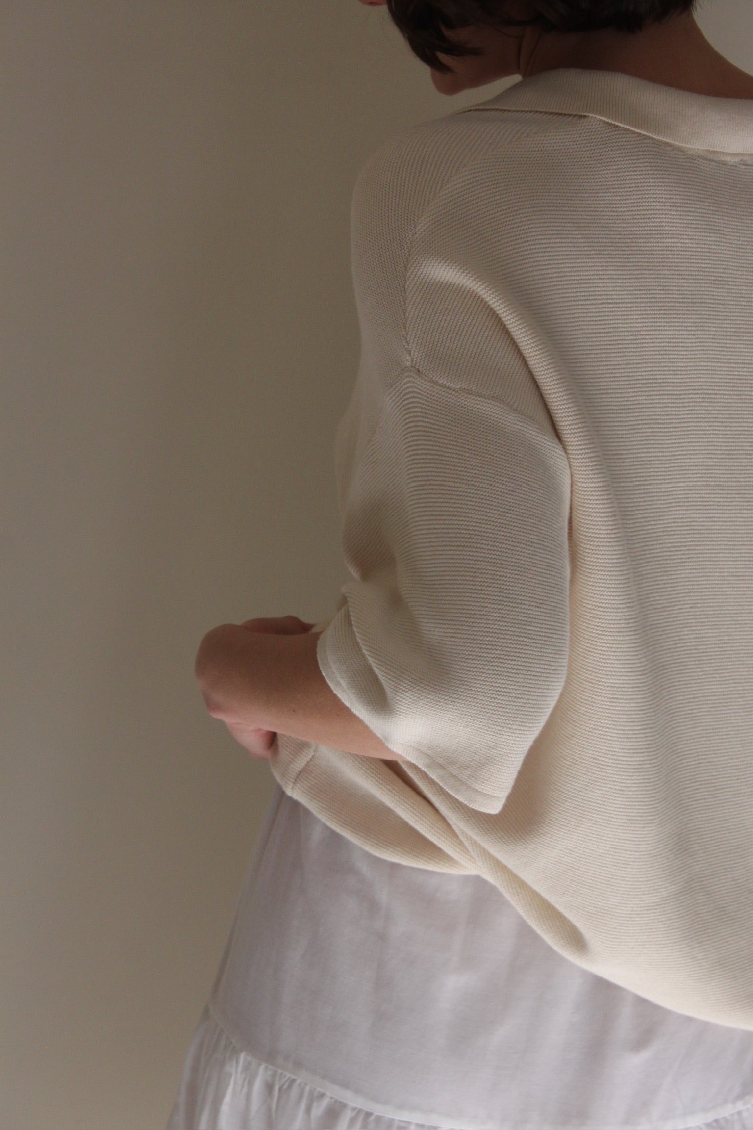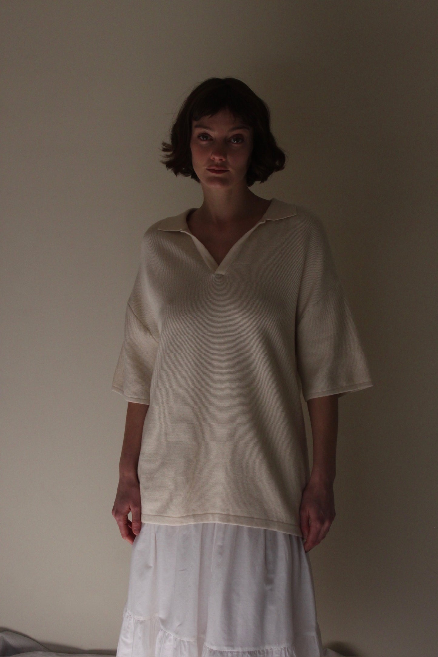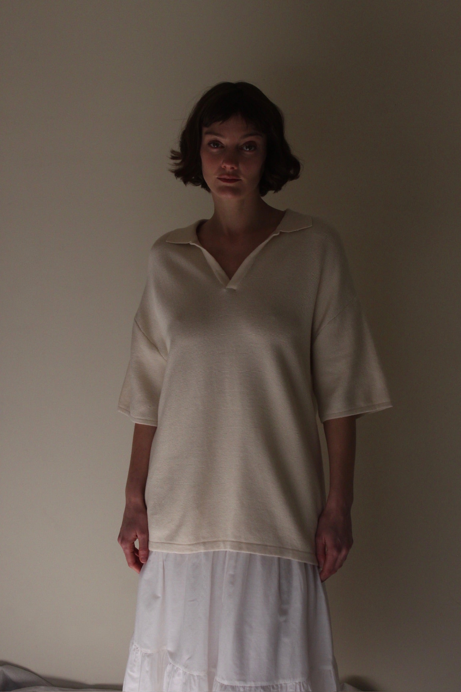 The Ernie Cotton Seed Stitch Polo is a unisex pullover top with a vintage feel. Our team was inspired by a beloved sweater and set out to recreate the original fabric for our new collection. With a relaxed fit, short sleeves, and casual spread collar, the Ernie offers a comfortable and laid-back style.