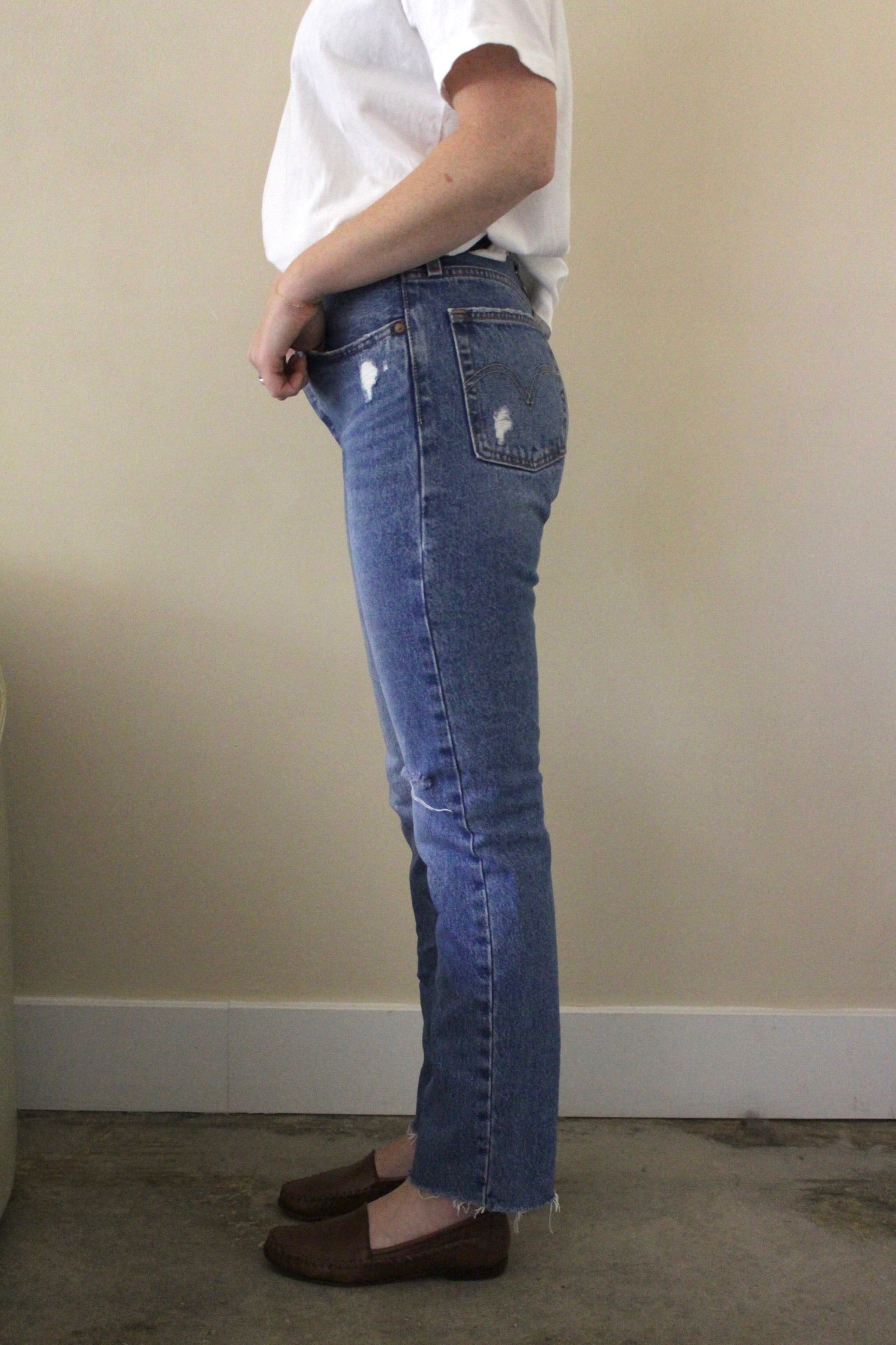 Easy button fly denim by Levi Strauss in a classic 501 fit. These have an intentional distressing at the pocket, front, knee, back pockets and a raw hem.