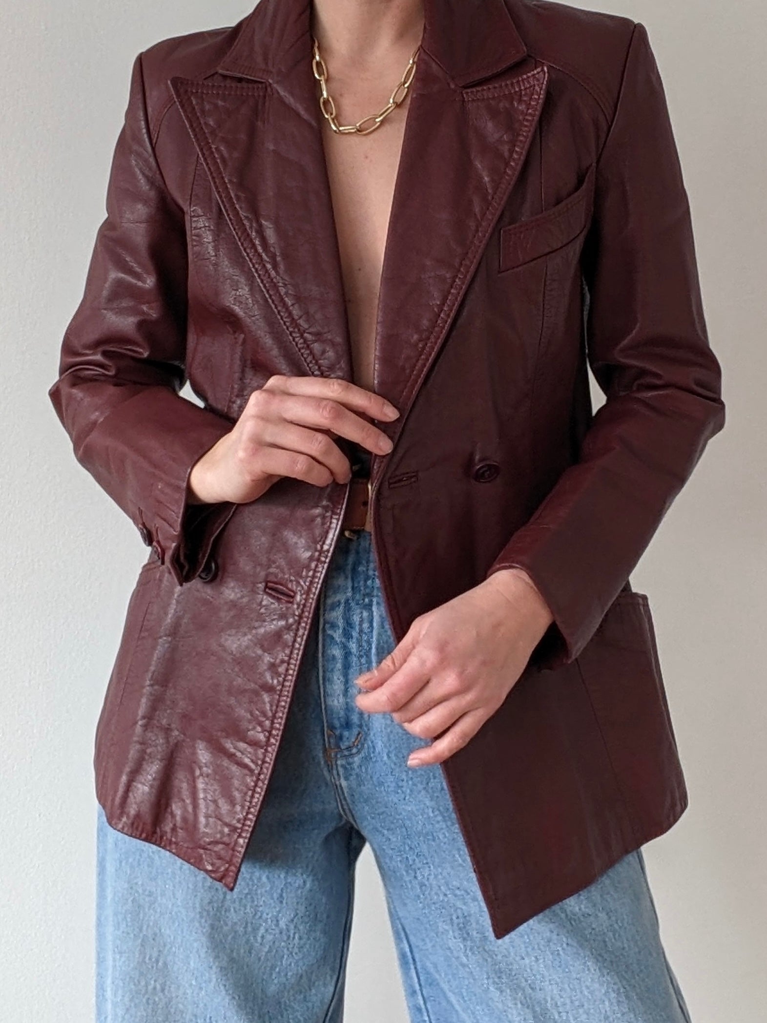 Favorite vintage jacket by Etienne Aigner in a beautiful merlot leather. Jacket has double-breasted button closures, a dramatic notched collar, side pockets and a lined interior.