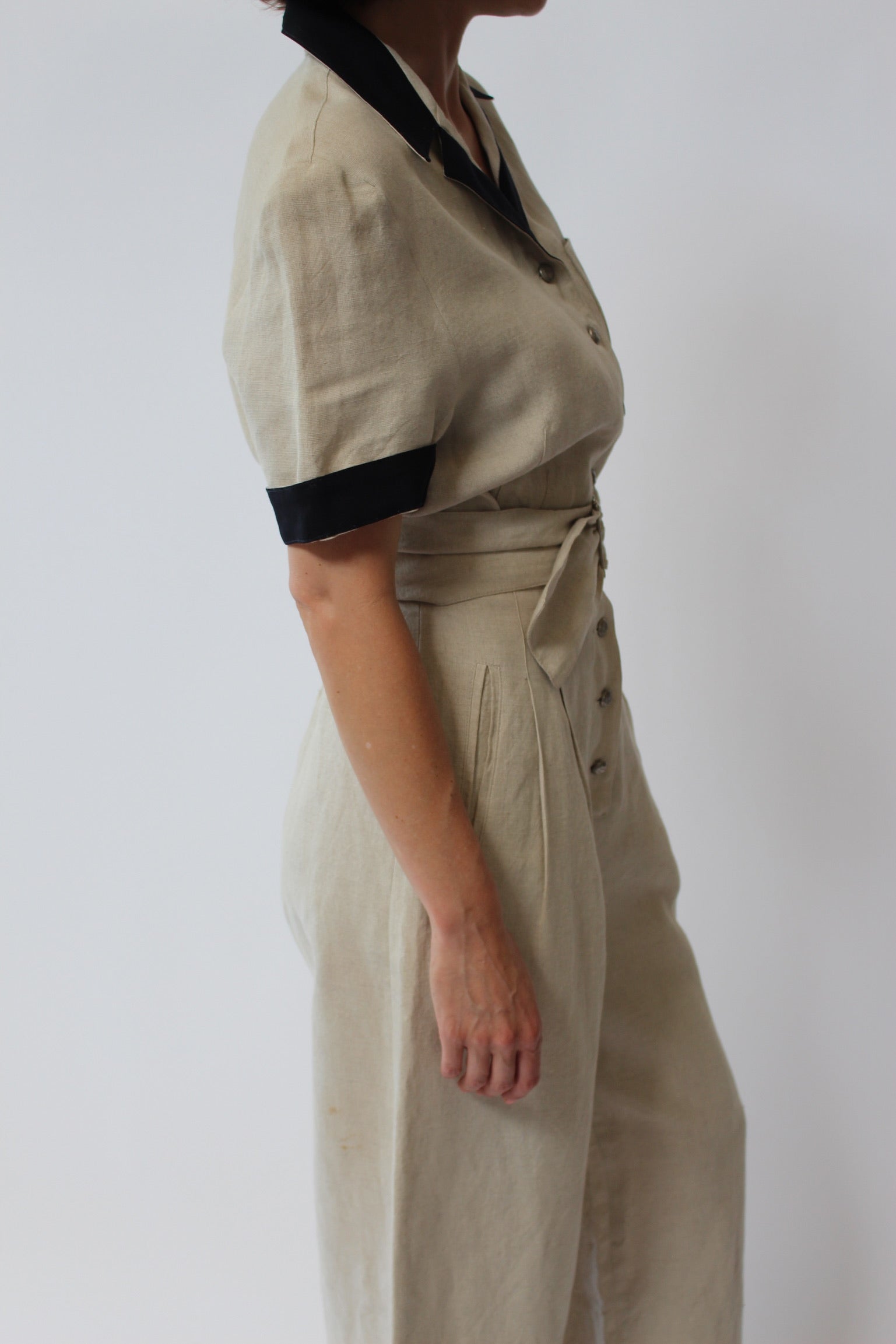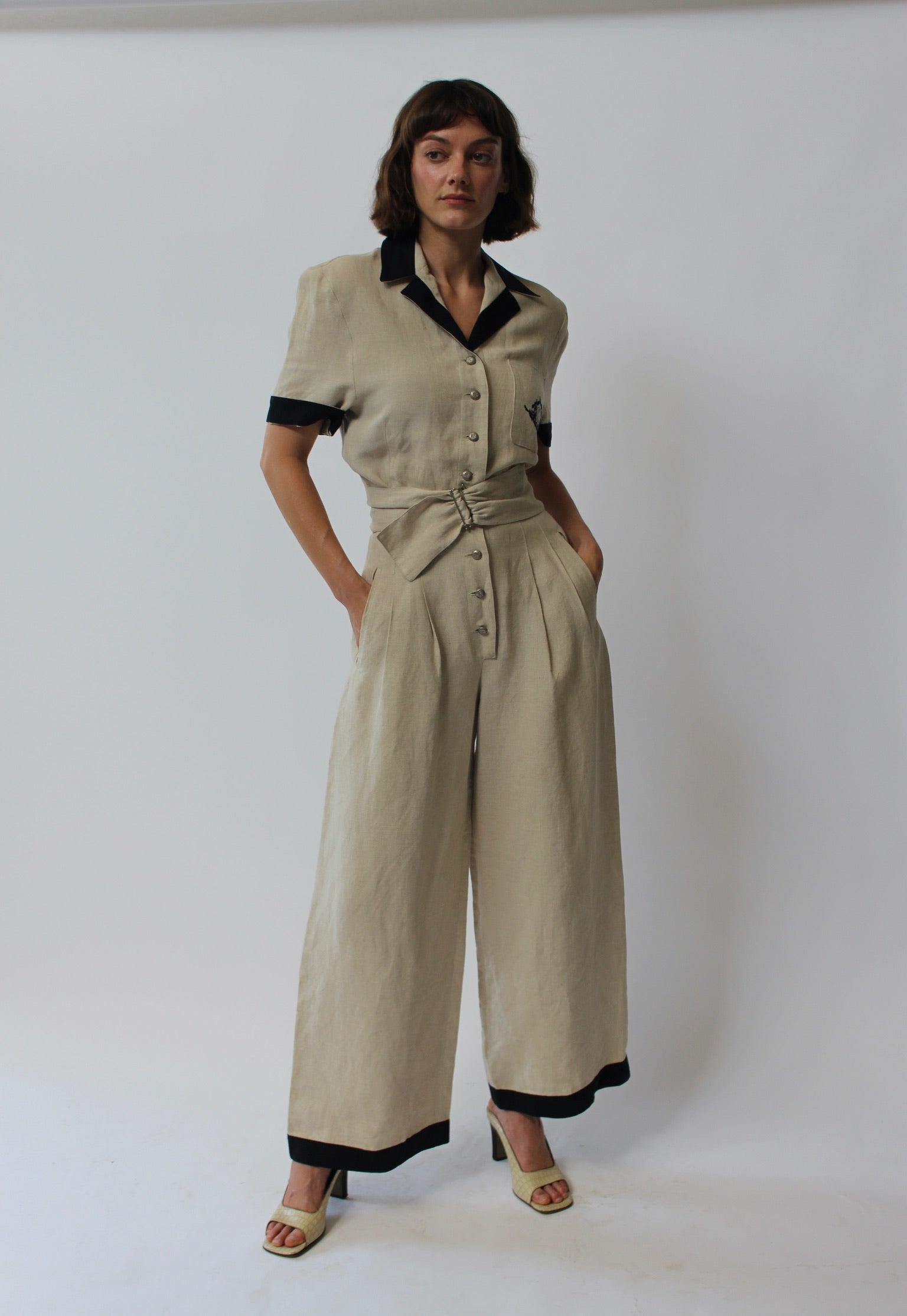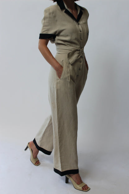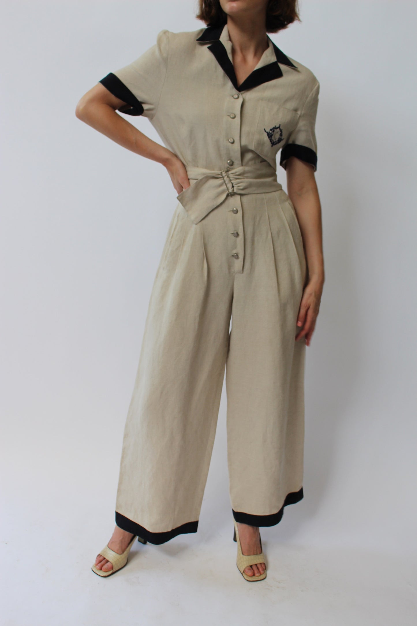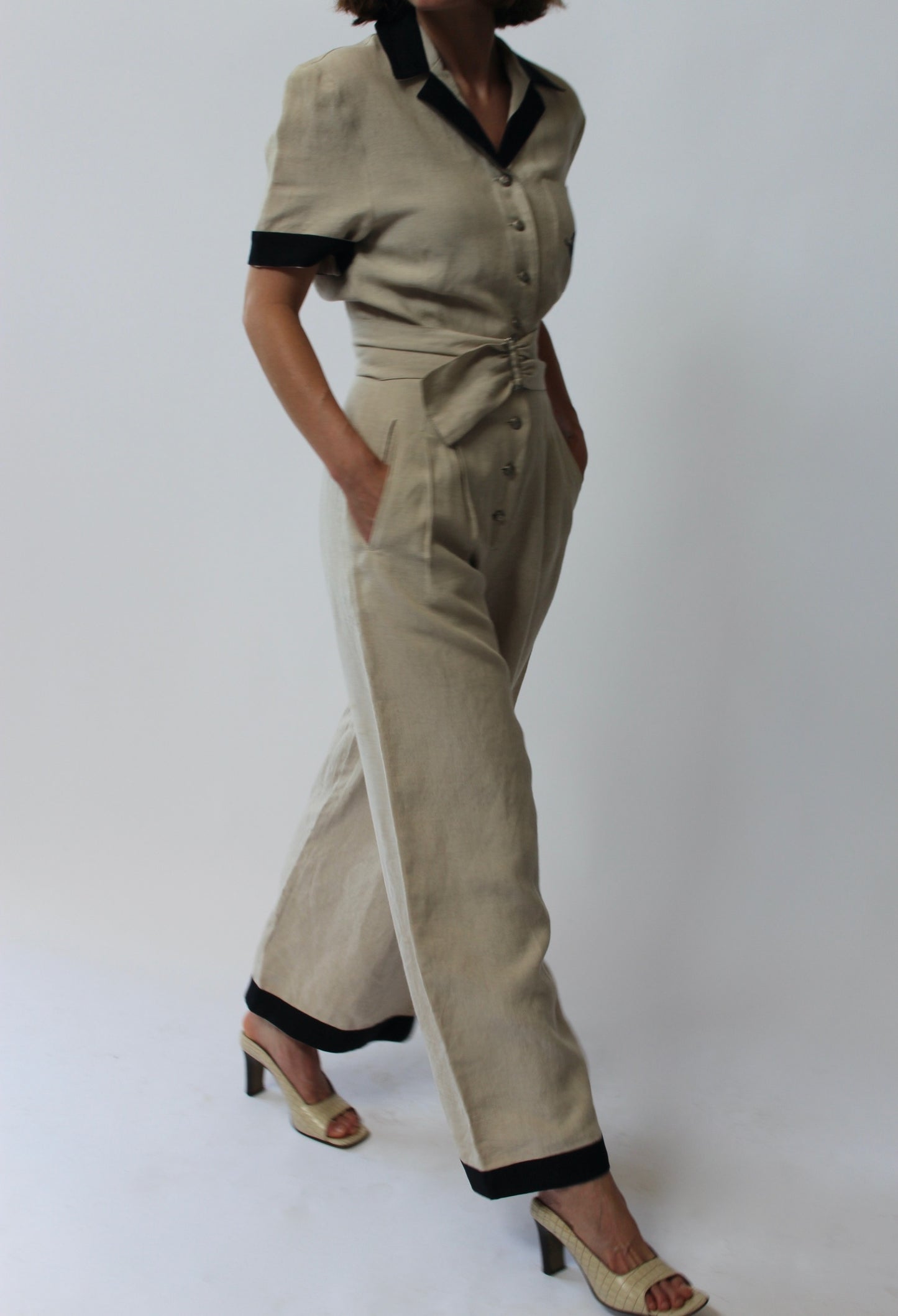 Incredible linen jumpsuit with a wide leg and belted accent. The jumpsuit has a notched collar, belted sash, wide leg, and black wide stripe accents along the collar, sleeve end and bottom hems. The single chest pocket is embroidered and has front pleating, side pockets and silver toned buttons.