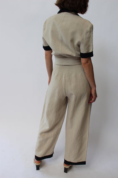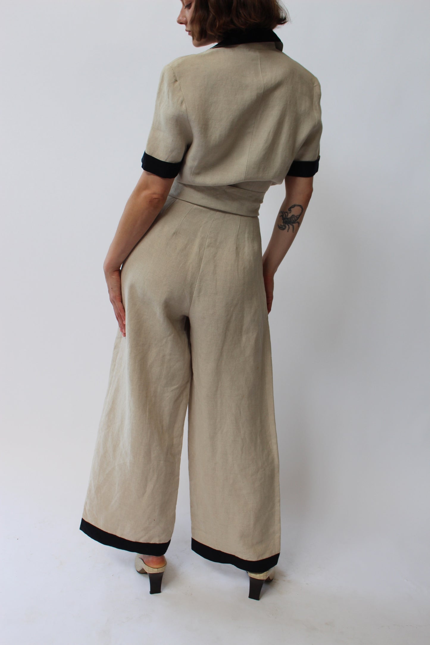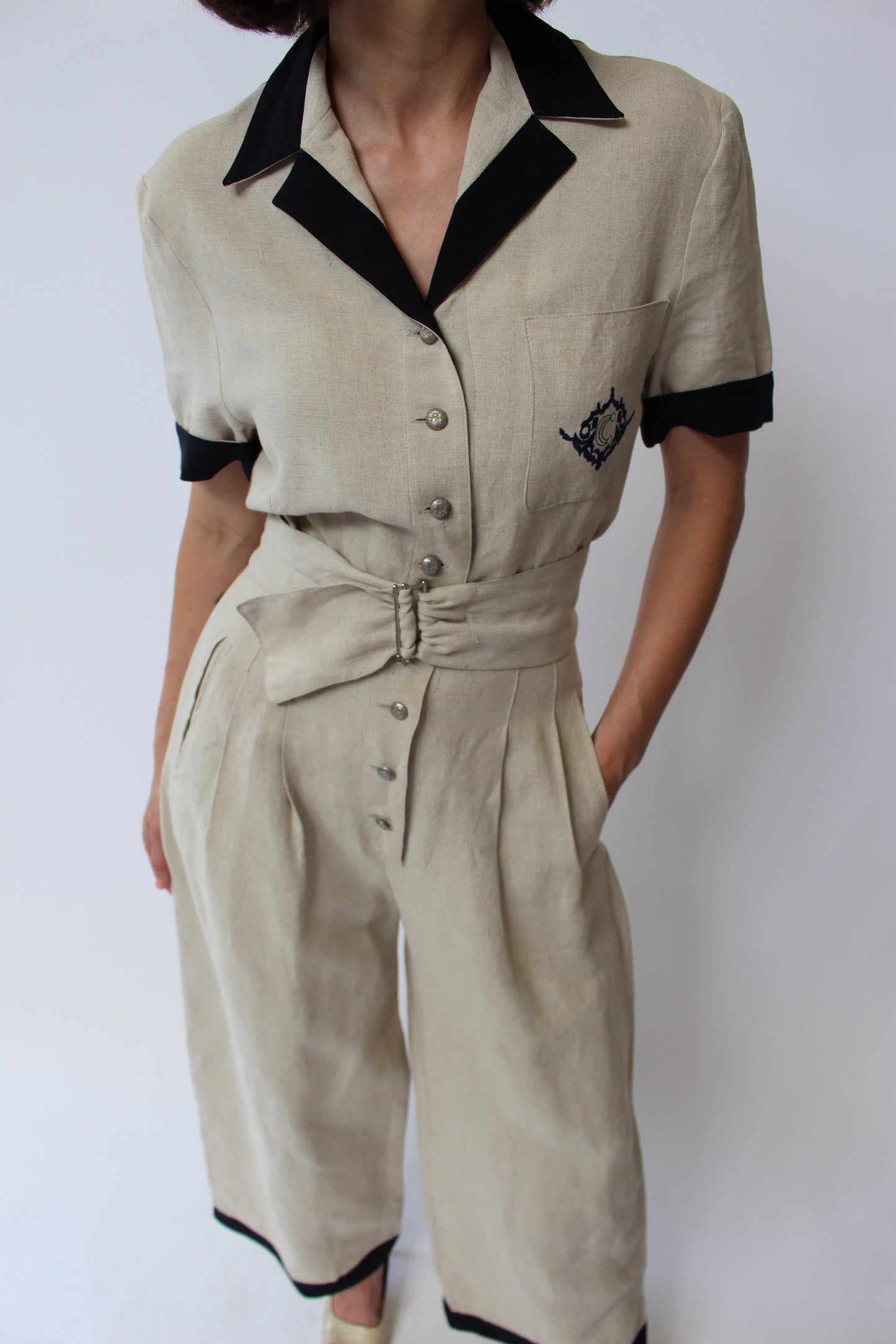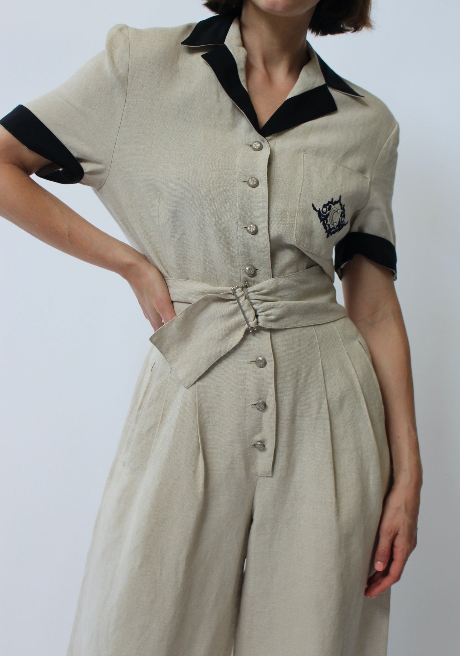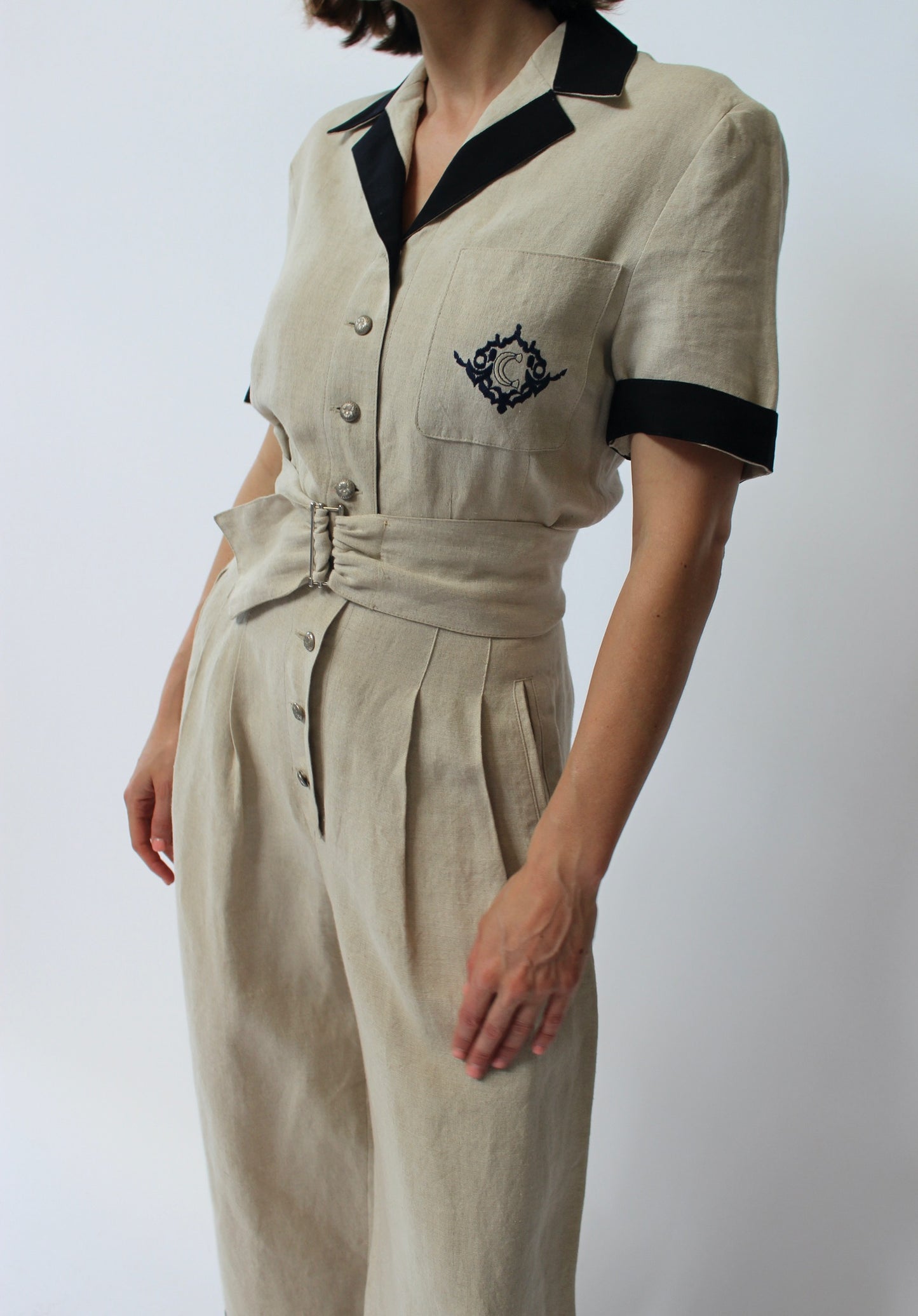 Incredible linen jumpsuit with a wide leg and belted accent. The jumpsuit has a notched collar, belted sash, wide leg, and black wide stripe accents along the collar, sleeve end and bottom hems. The single chest pocket is embroidered and has front pleating, side pockets and silver toned buttons.