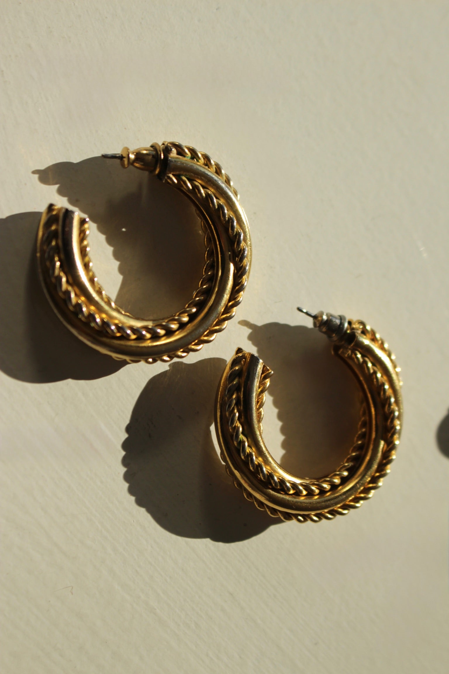 Favorite vintage large hoop earrings in a gold twisted coil & rope design. Earrings have a wonderfully lightweight feel & post backings.