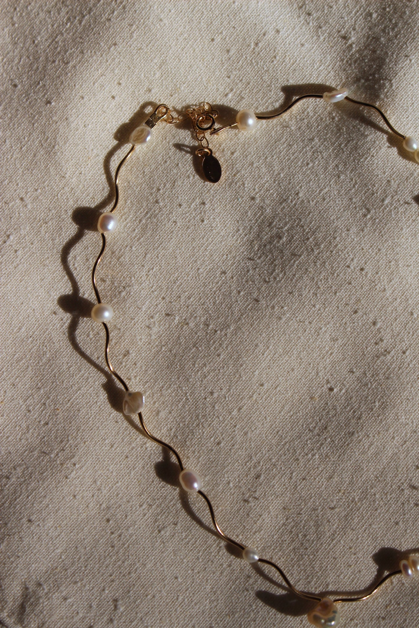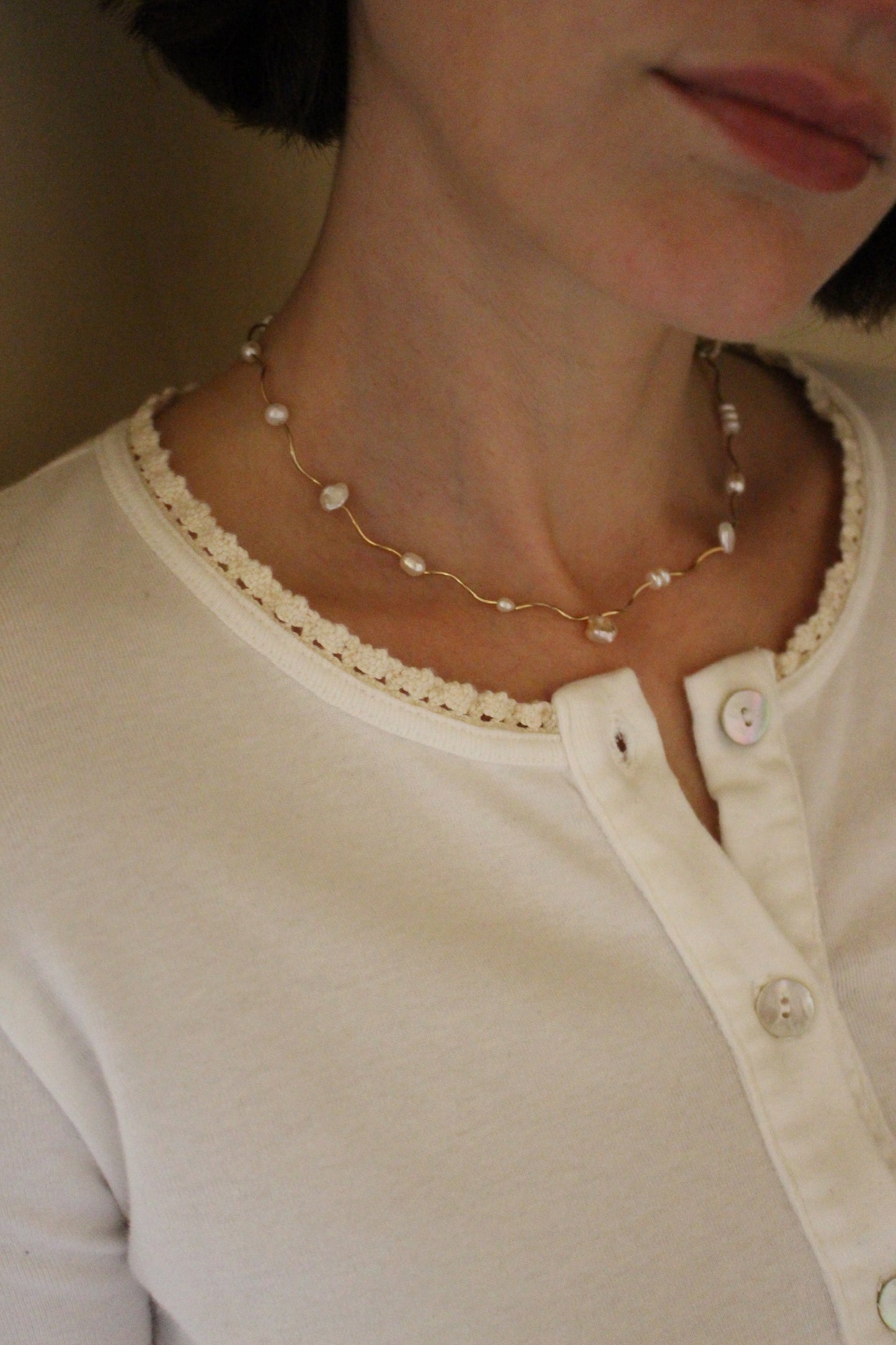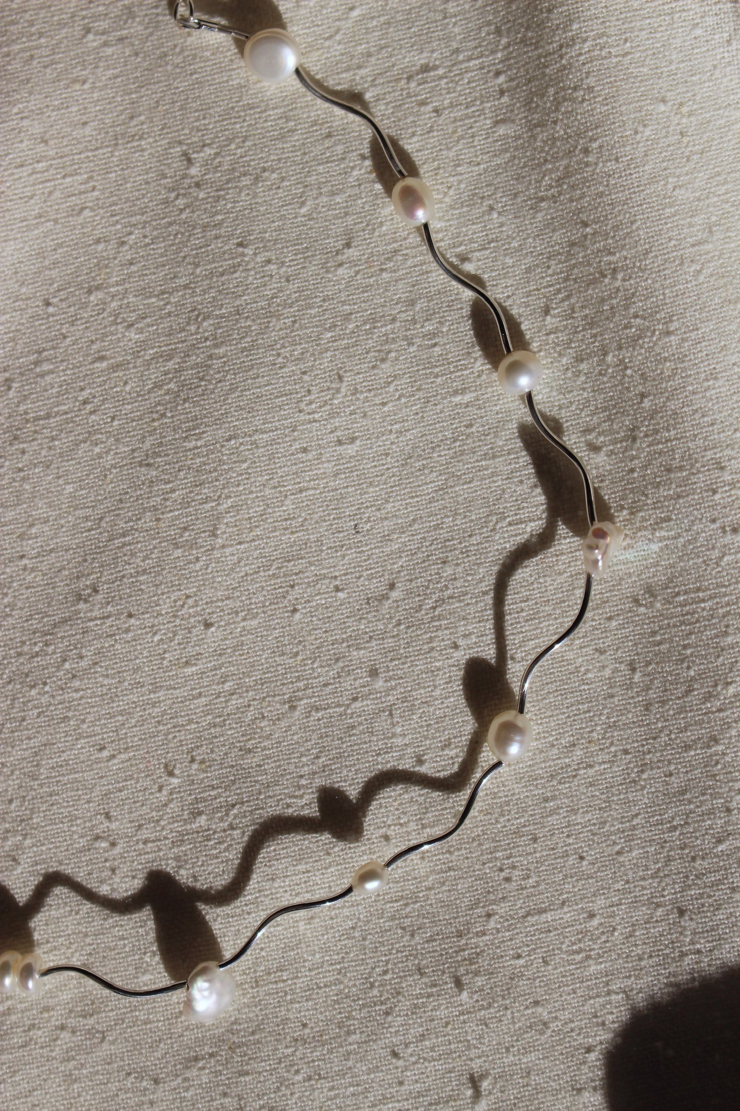 The Marida Filament Necklace is a visually striking piece, featuring intricate twirls and a diverse selection of freshwater pearls in varying shapes.