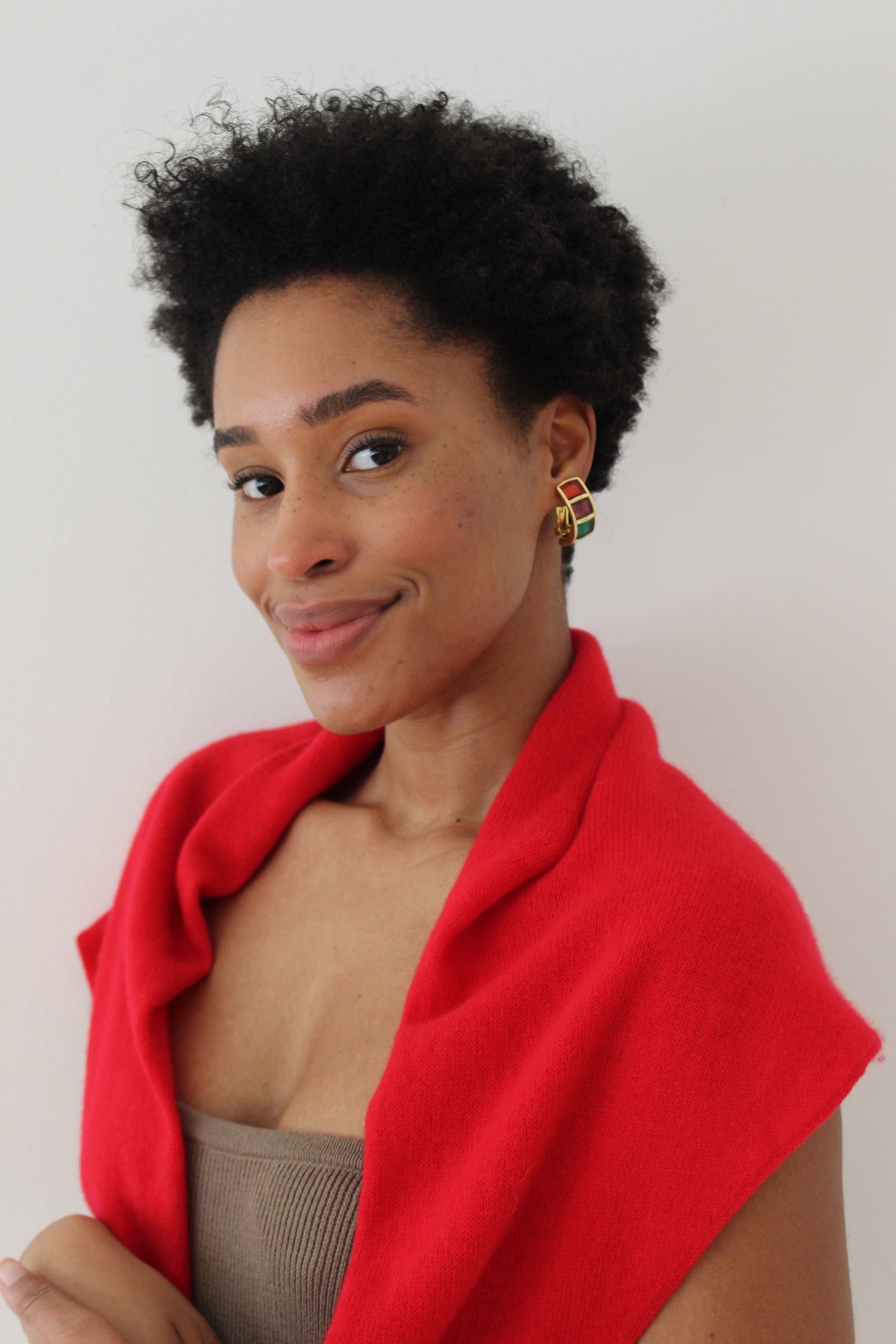 Fun vintage clip-on earrings with a bold design! Earrings have bright gold trim surrounded squared, multi-colored faux gems. Features a curved shape and sturdy clip backings.