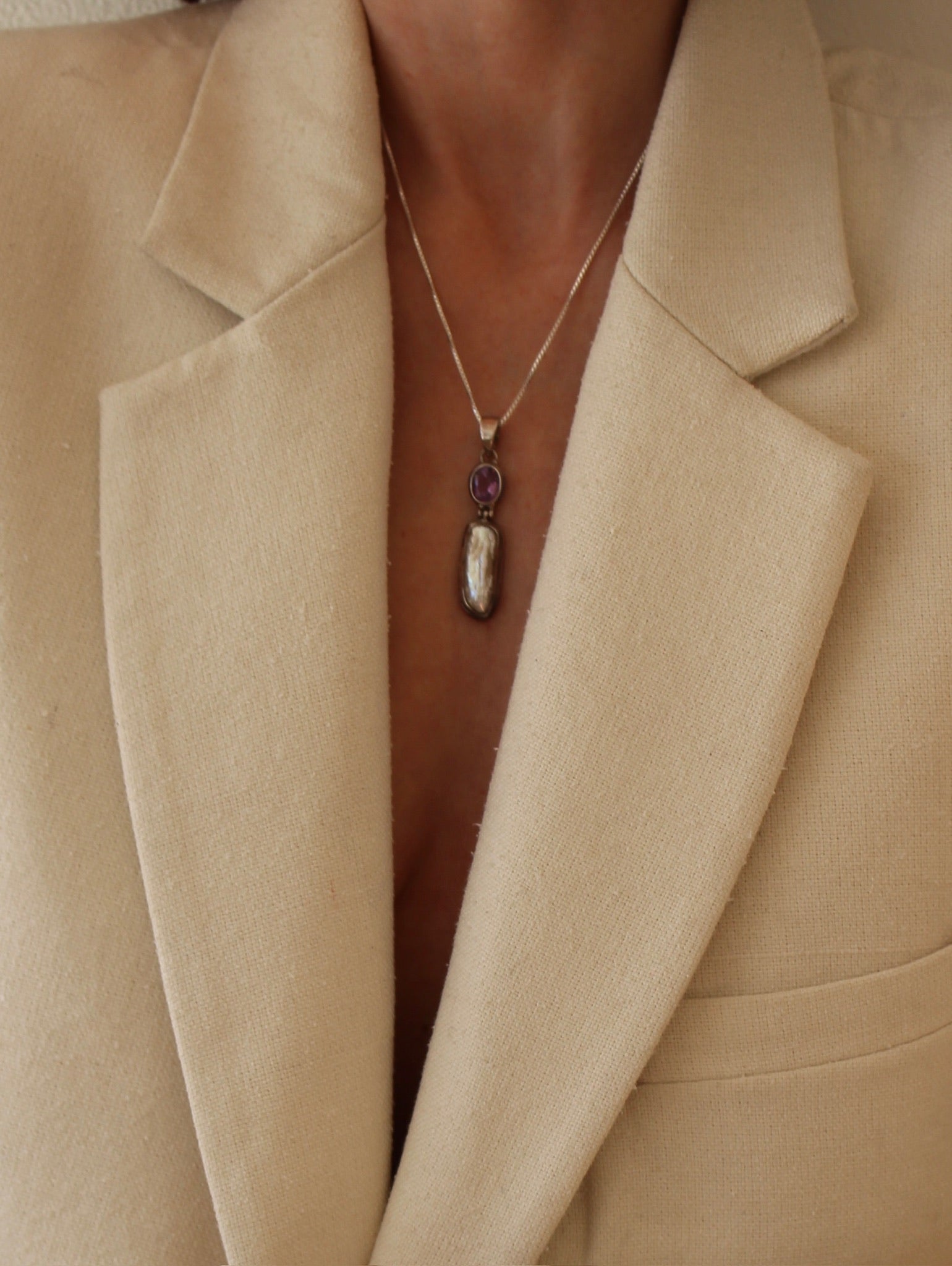 Absolutely gorgeous vintage pendant with an elongated, baroque freshwater pearl sitting below a faceted purple amethyst stone, both in sterling silver framed settings. Pendant includes a delicate, Italian sterling silver chain.