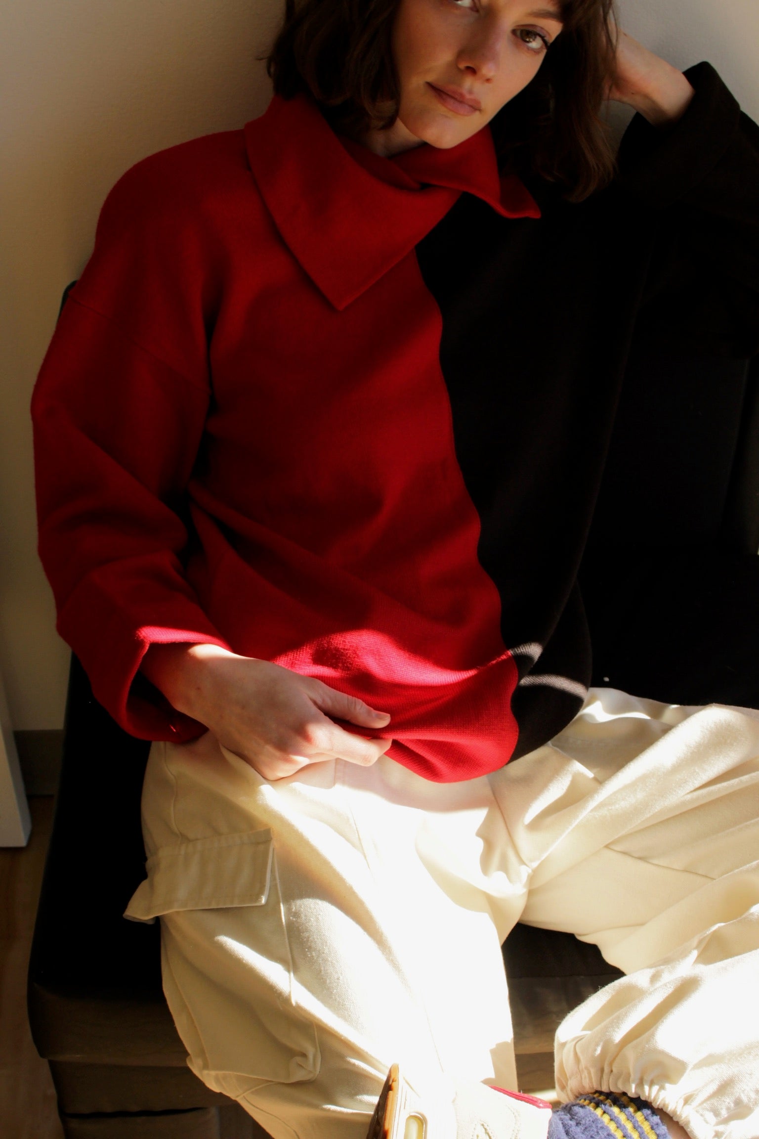 Absolute favorite knit tunic by St. John Sportswear. The tunic has a statement collar, and split red and black body.