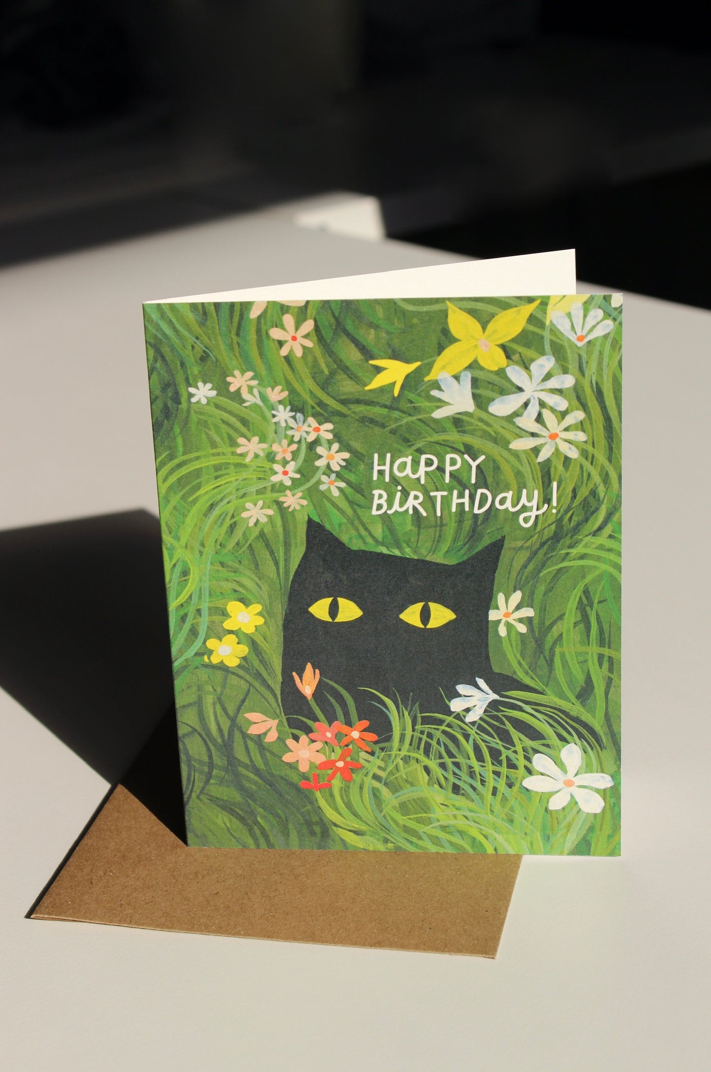 A perfect and simple black cat in a field to wish someone a happy birthday.