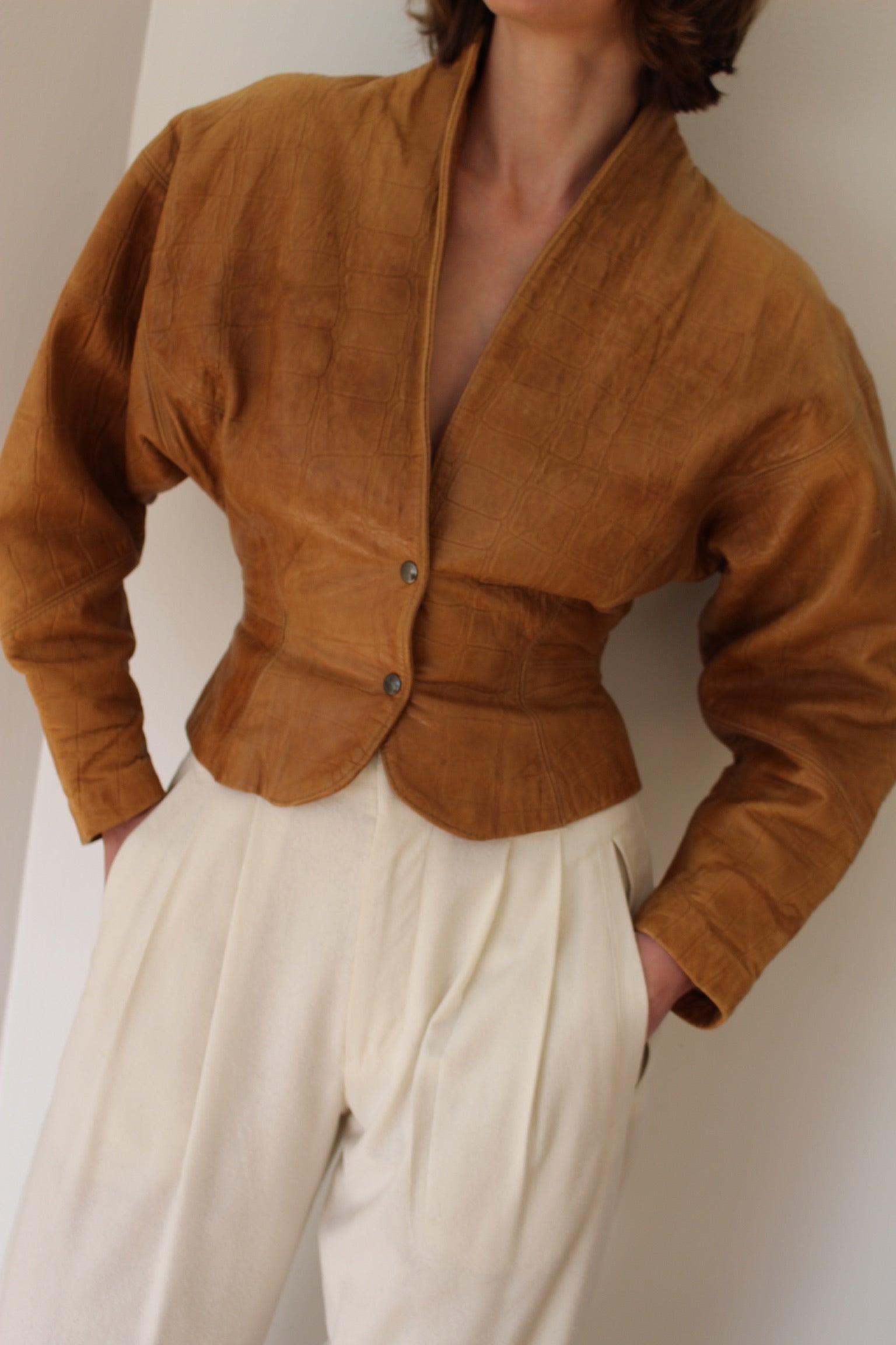 Beautiful camel leather jacket with an incredible embossing throughout. The jacket has a fitted bodice, dolman style sleeve, two front snap closures and a full inner lining.