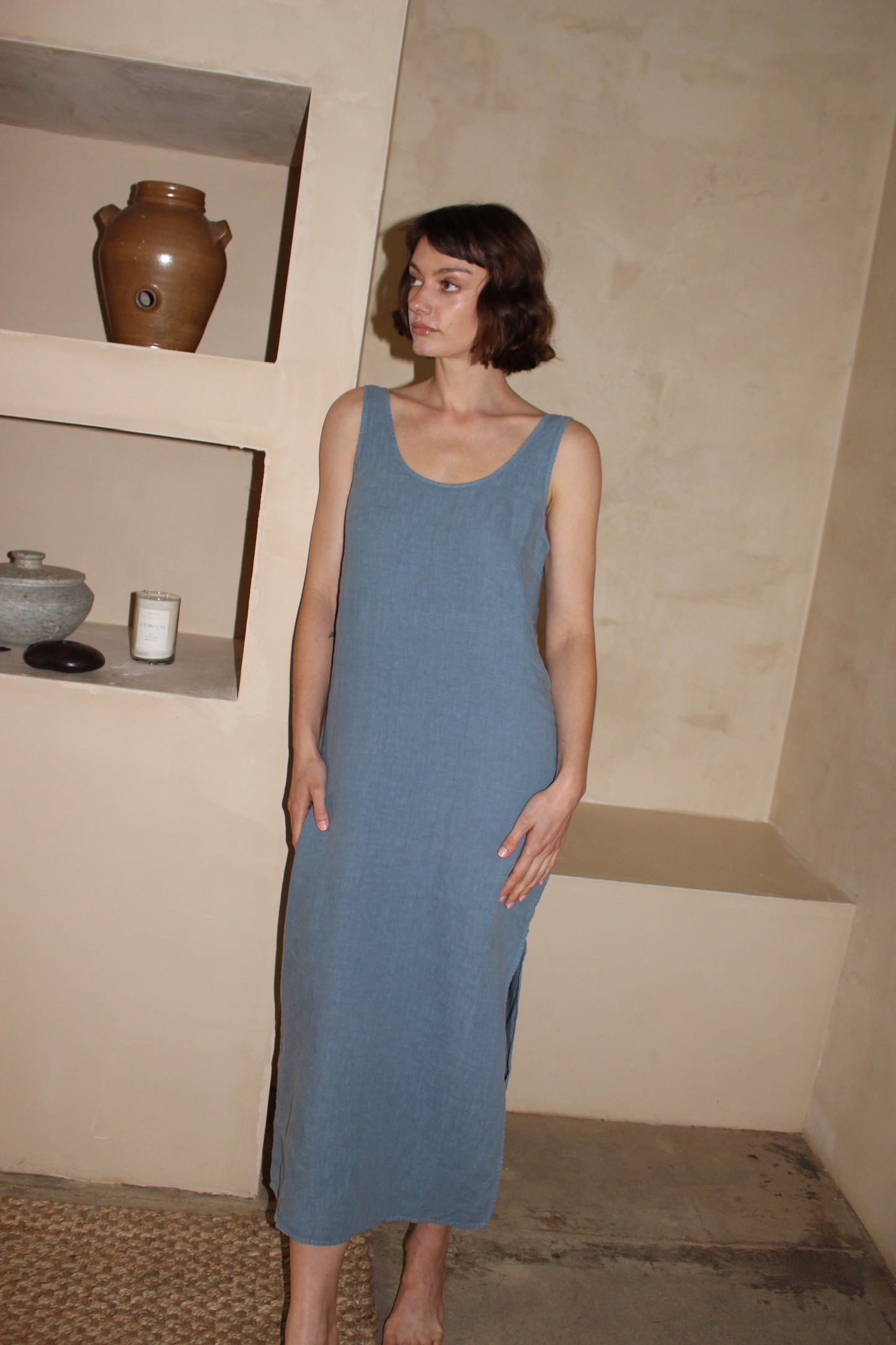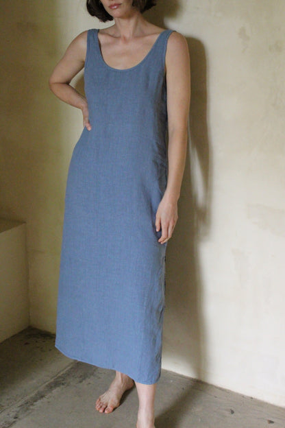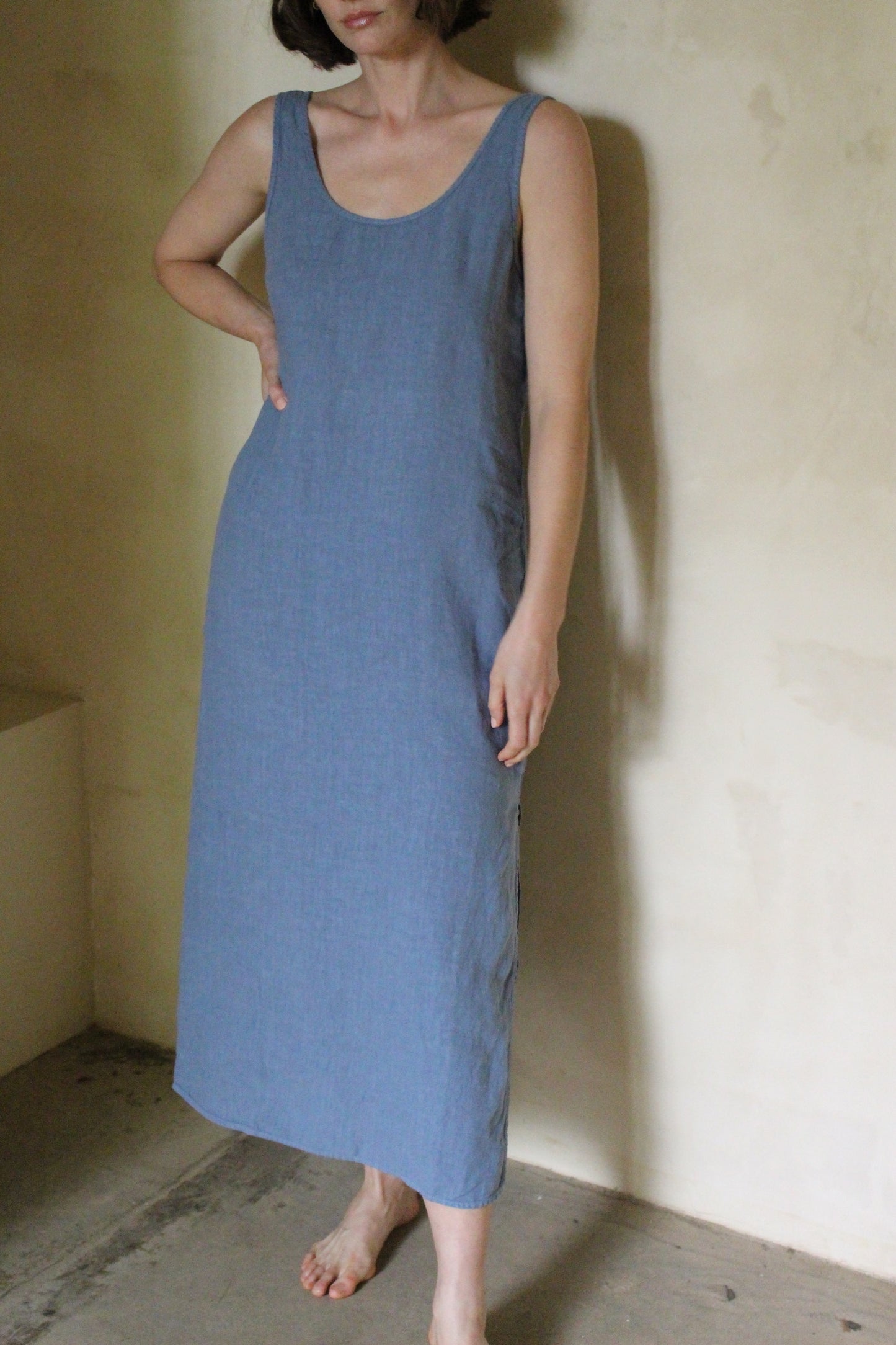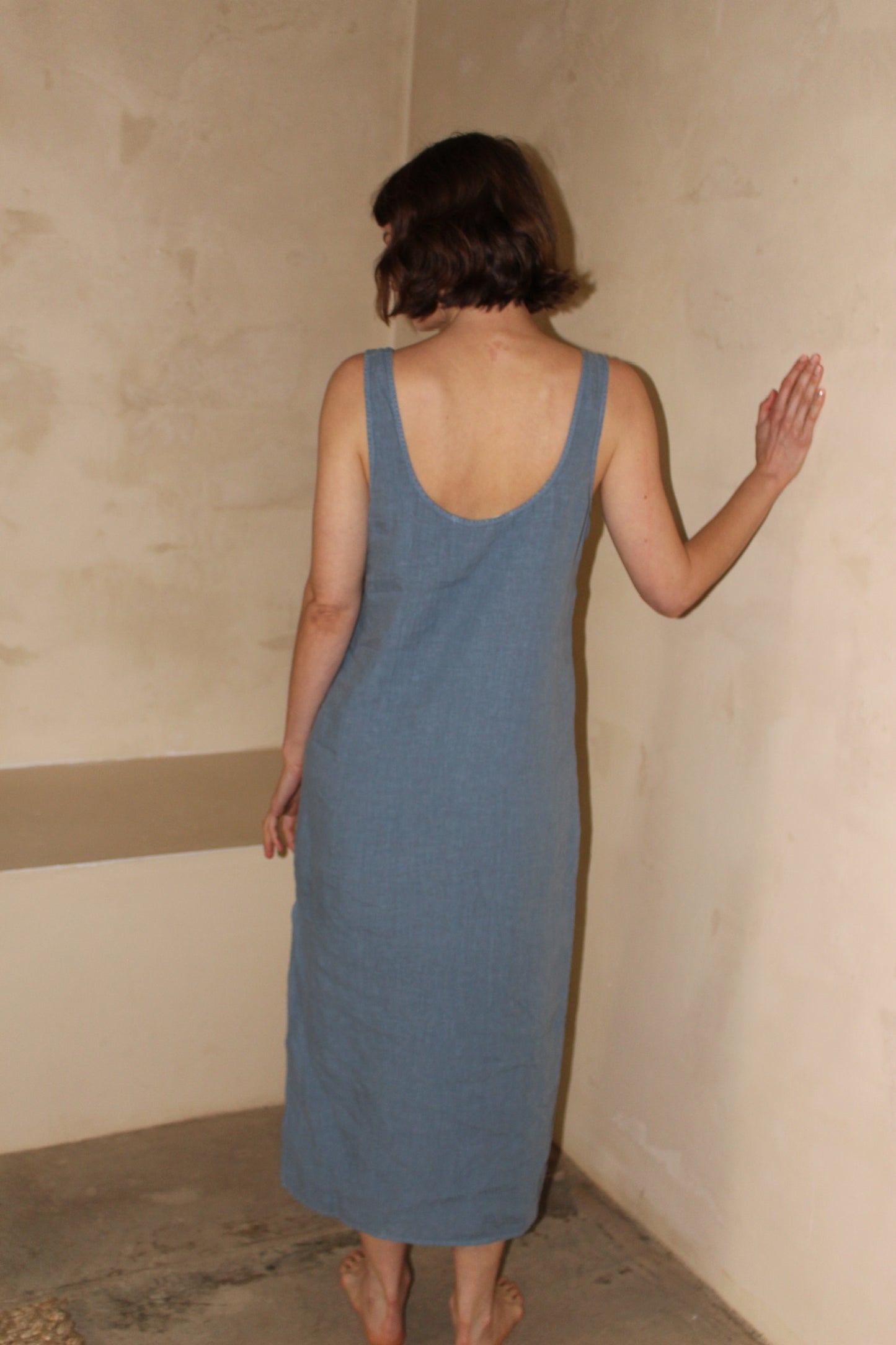 This long linen dress features a traditional design, with a scooped front and back neckline. It has been garment washed and pre-shrunk, and is made from locally sourced linen for a relaxed and comfortable fit.