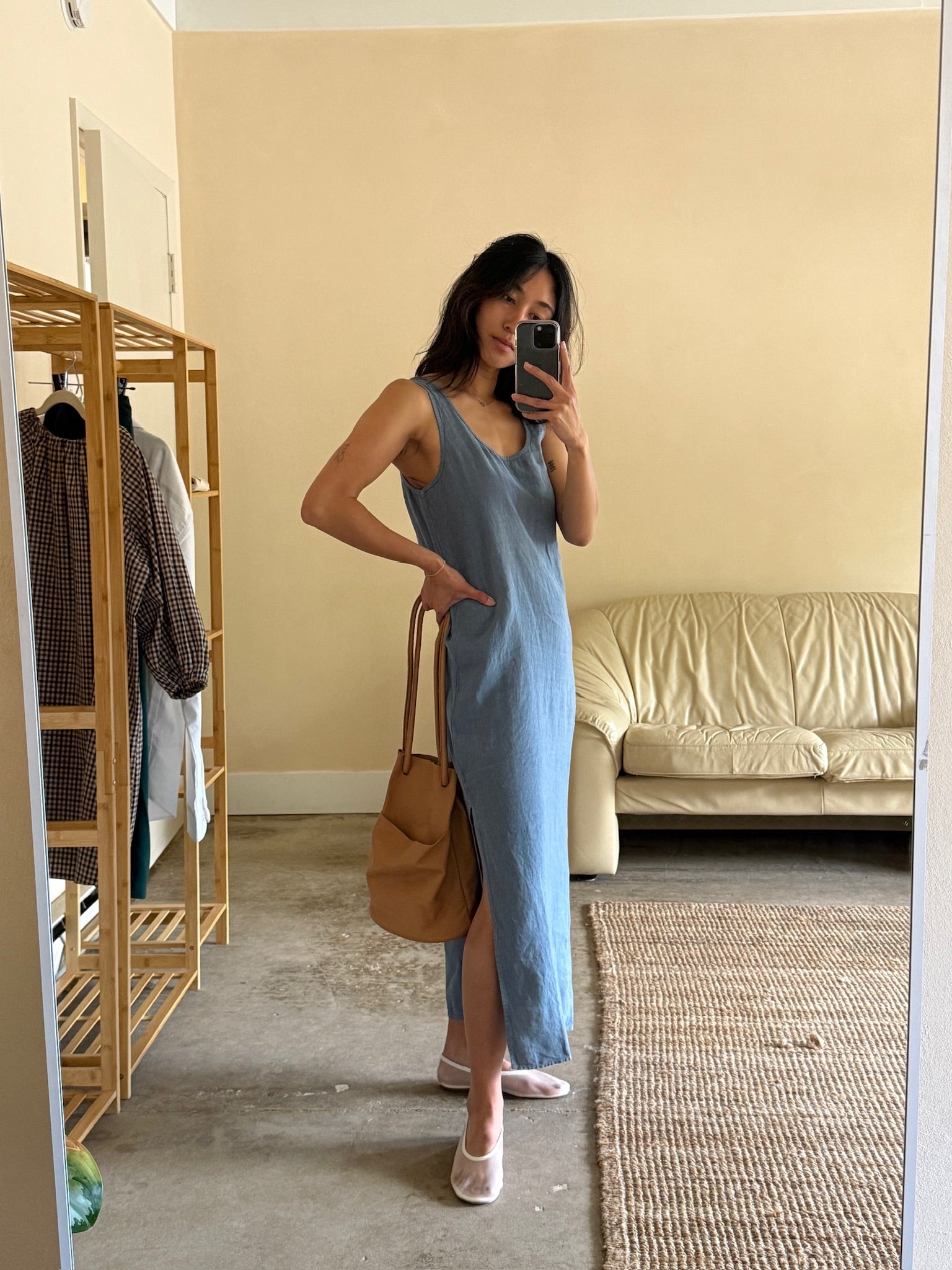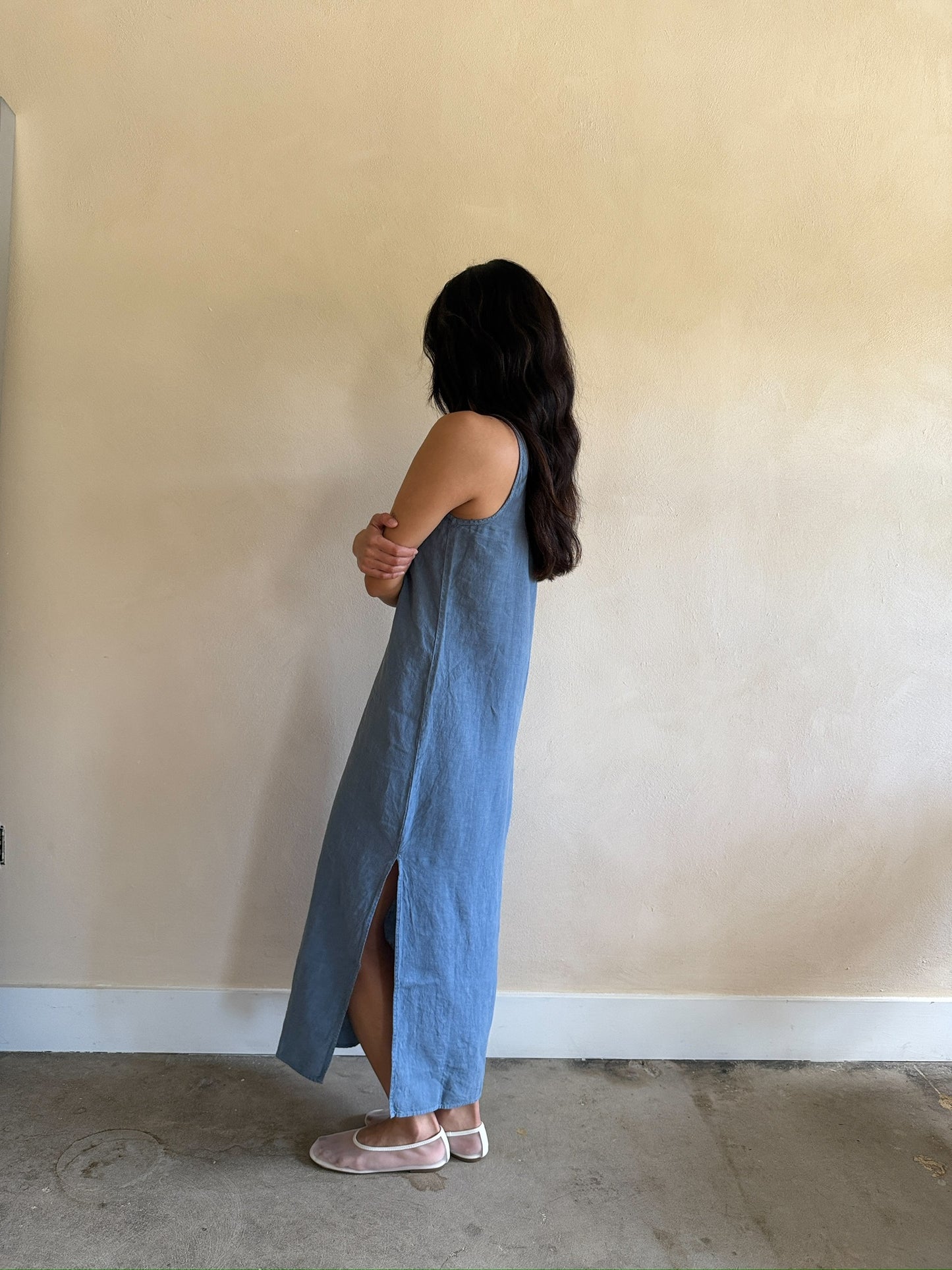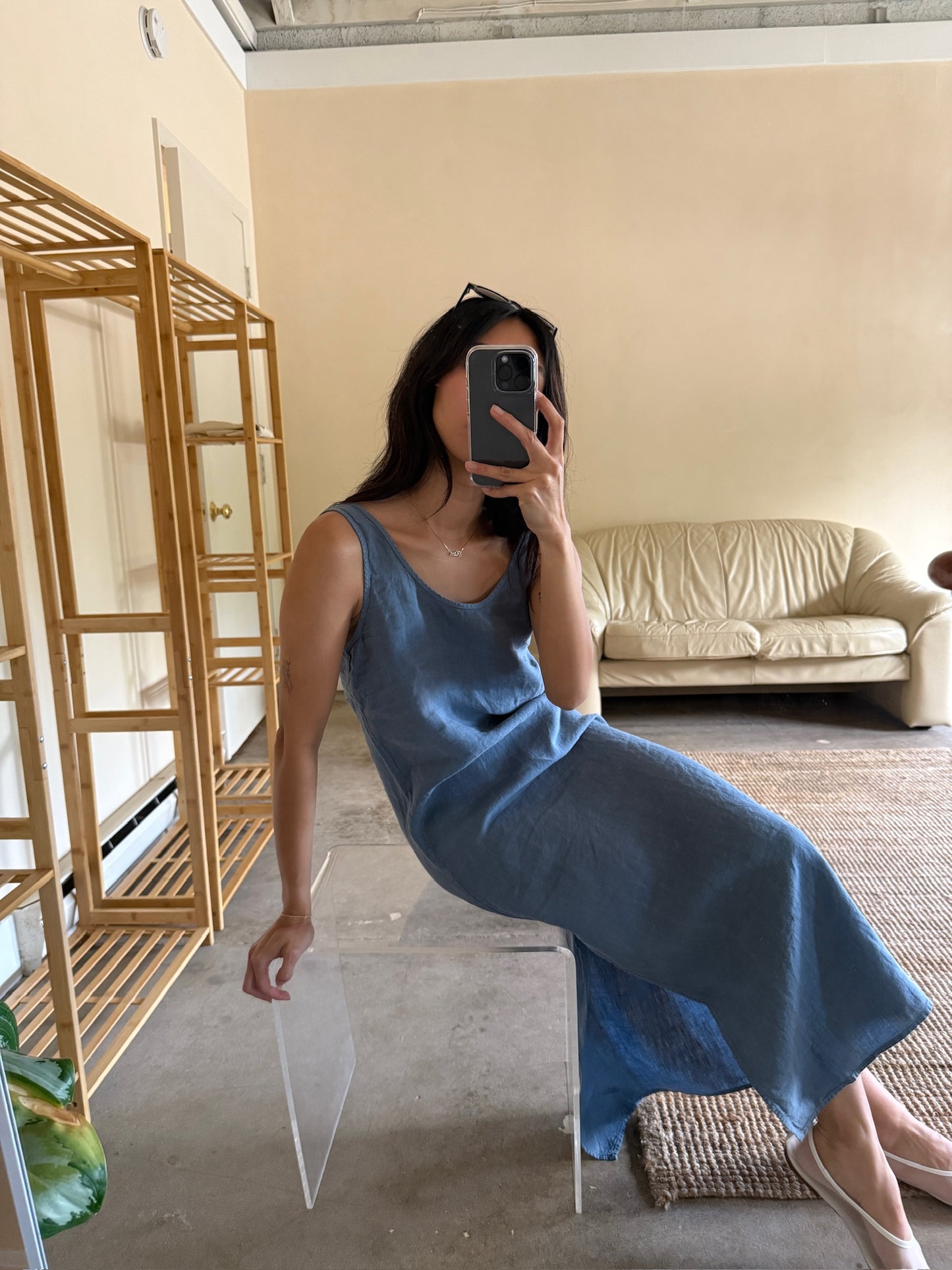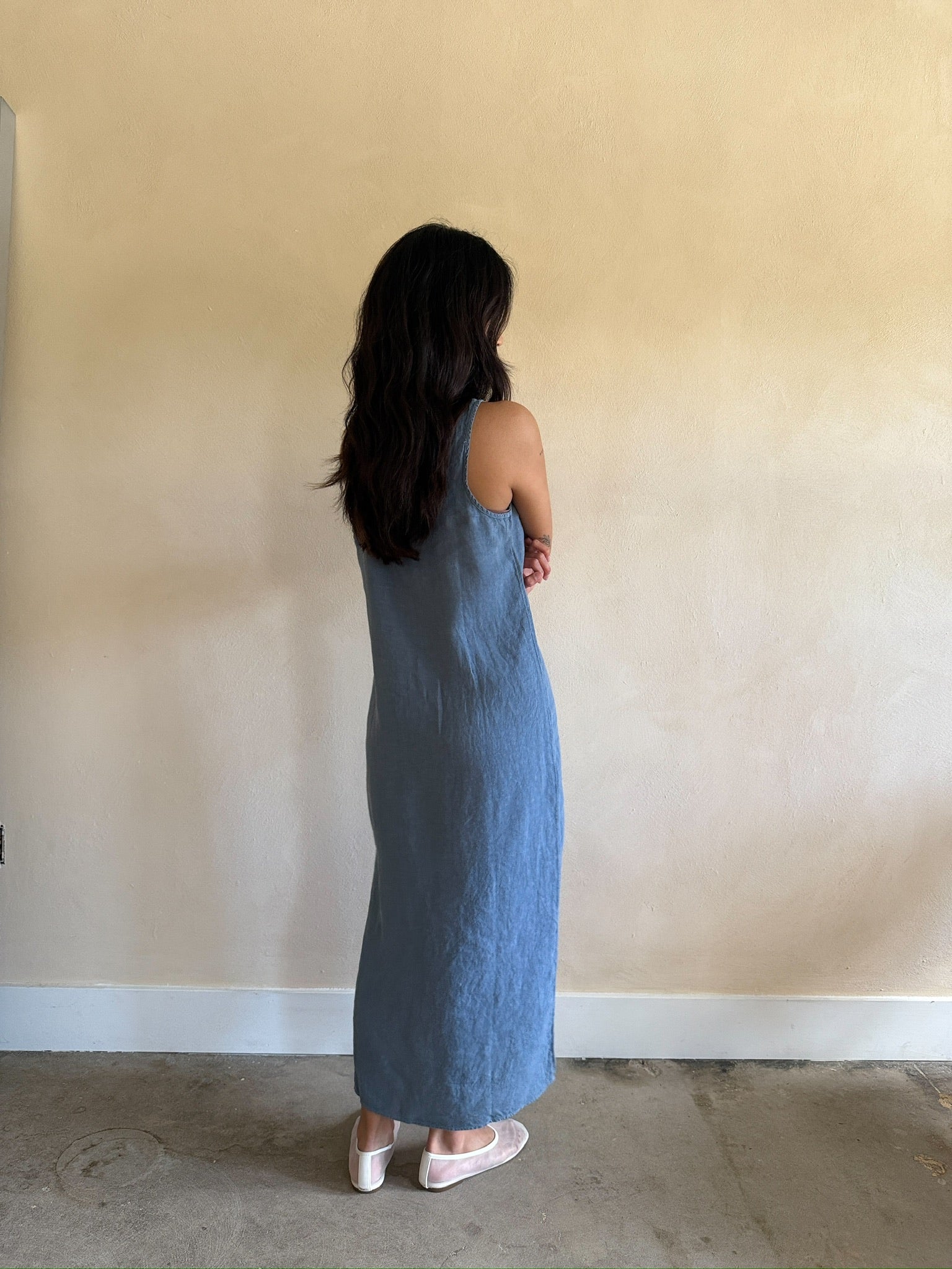 This long linen dress features a traditional design, with a scooped front and back neckline. It has been garment washed and pre-shrunk, and is made from locally sourced linen for a relaxed and comfortable fit.