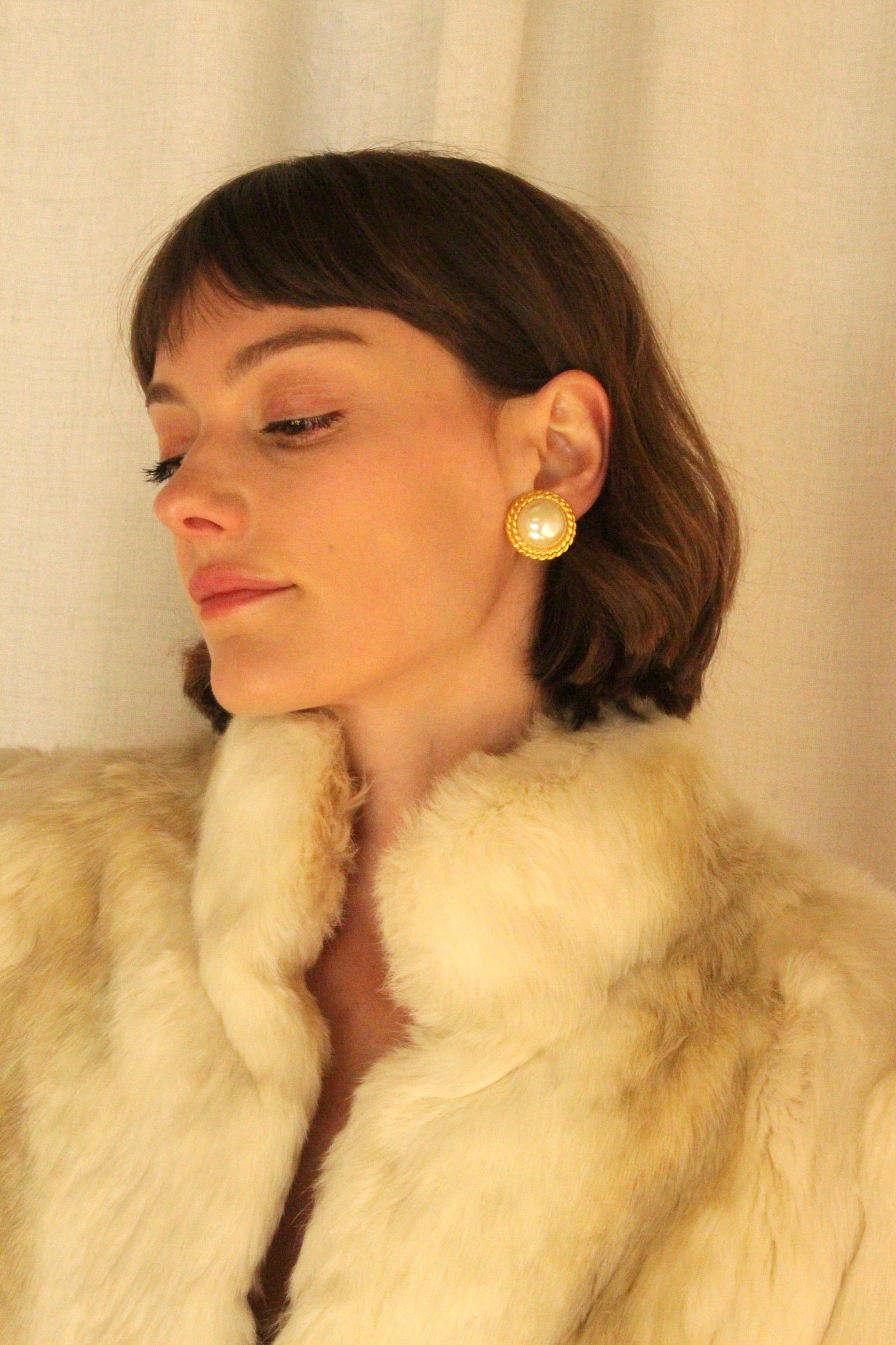 Lovely vintage clip-on earrings in a classic design! Features a large, faux pearl center with a bright gold rope border.