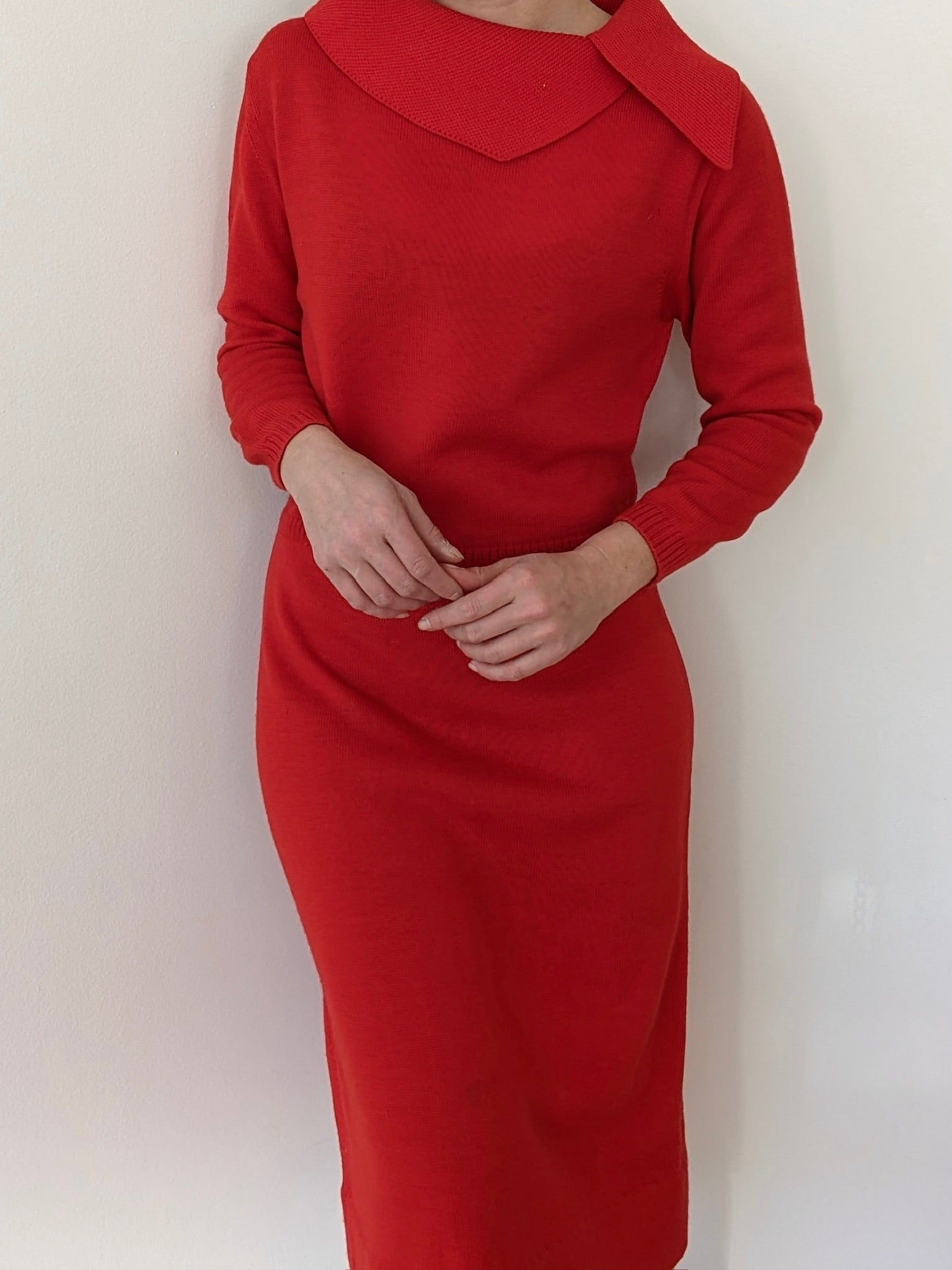 Lovely vintage dress in a thick, knitted wool fabric & brighit holiday red color. Dress has long sleeves, a beautiful collared neckline and a flattering dropped, elastic waist.