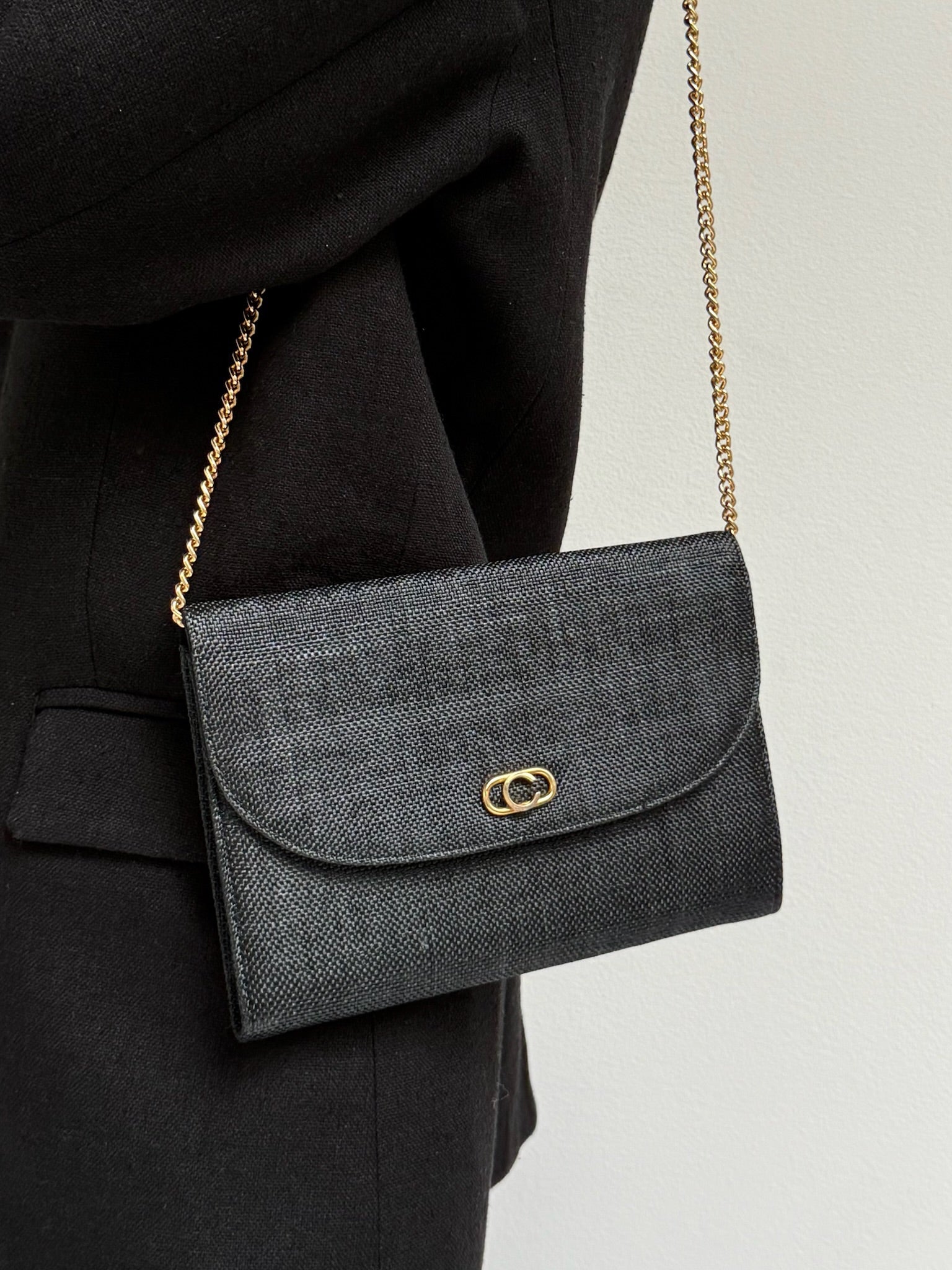 Lovely vintage purse in a dark, woven fabric. Purse has a slim, envelope design with a gold chain strap that can be tucked inside if desired to use as a clutch! Features a simple front snap closure & a small inner compartment.