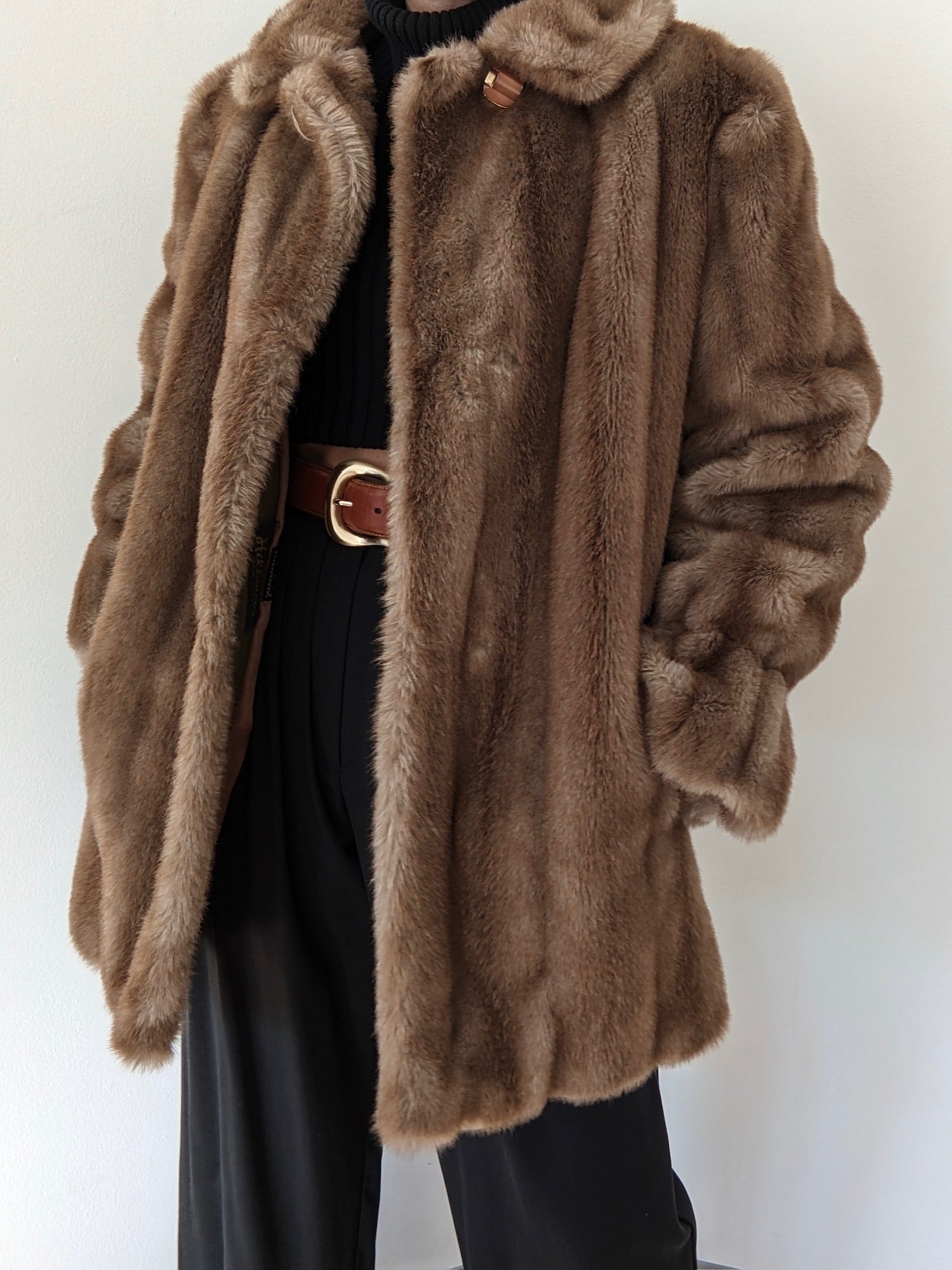 Luxury vintage coat in an incredibly plush & cozy faux fur fabric. Coat has a satin lining, a single statement loop button closure at the very top, deep side pockets and a bold fit.