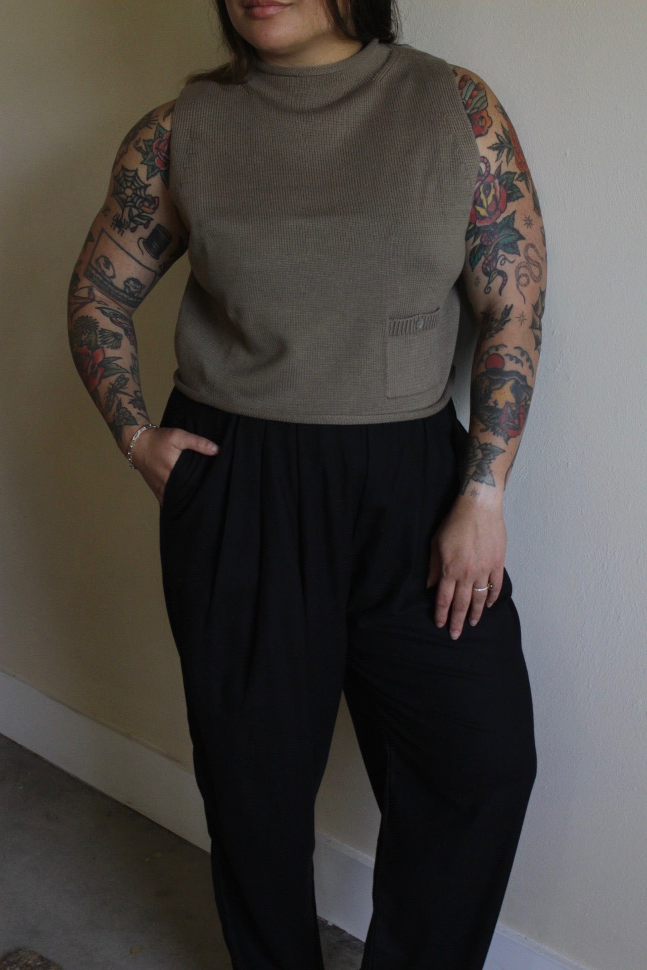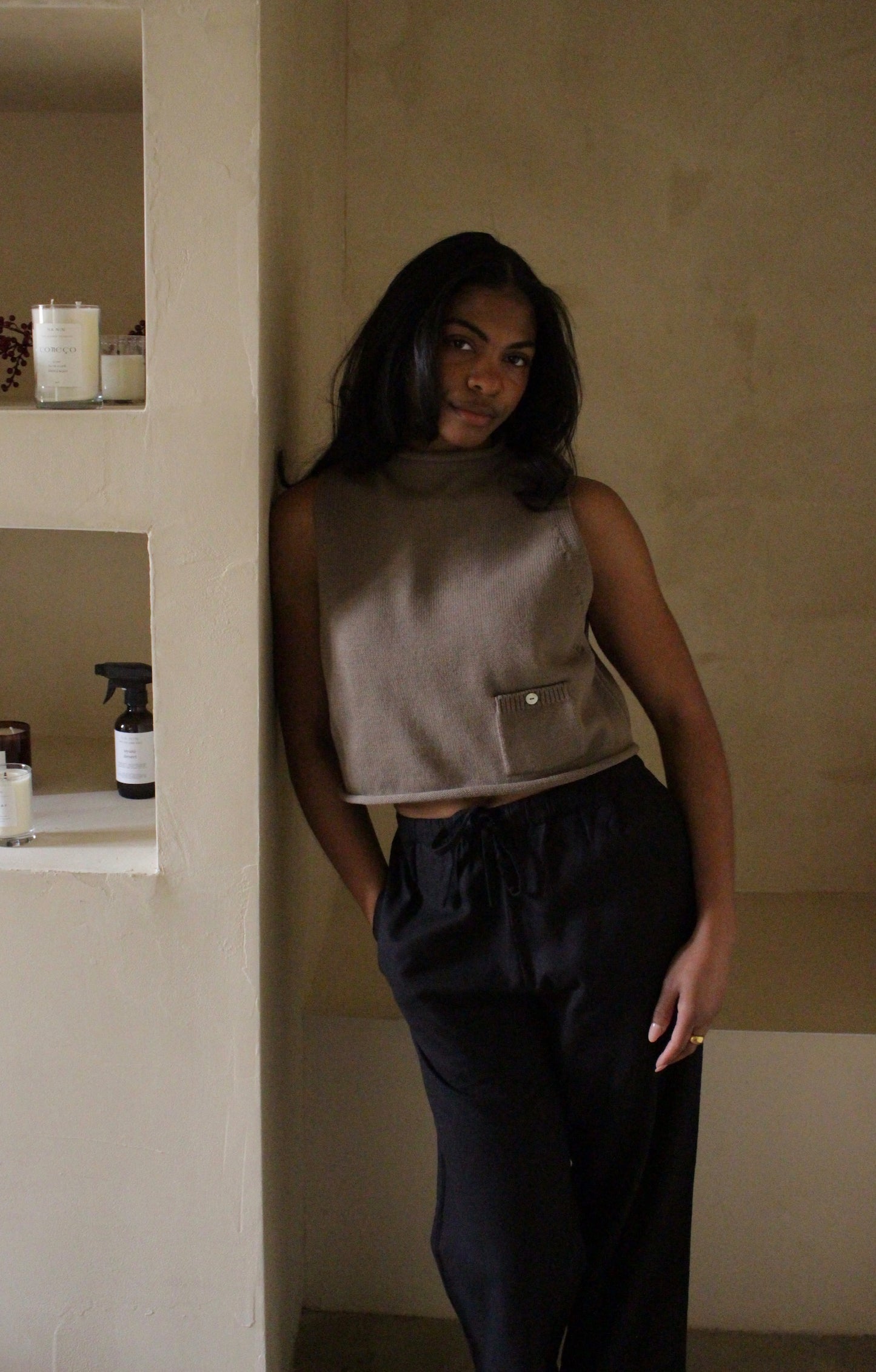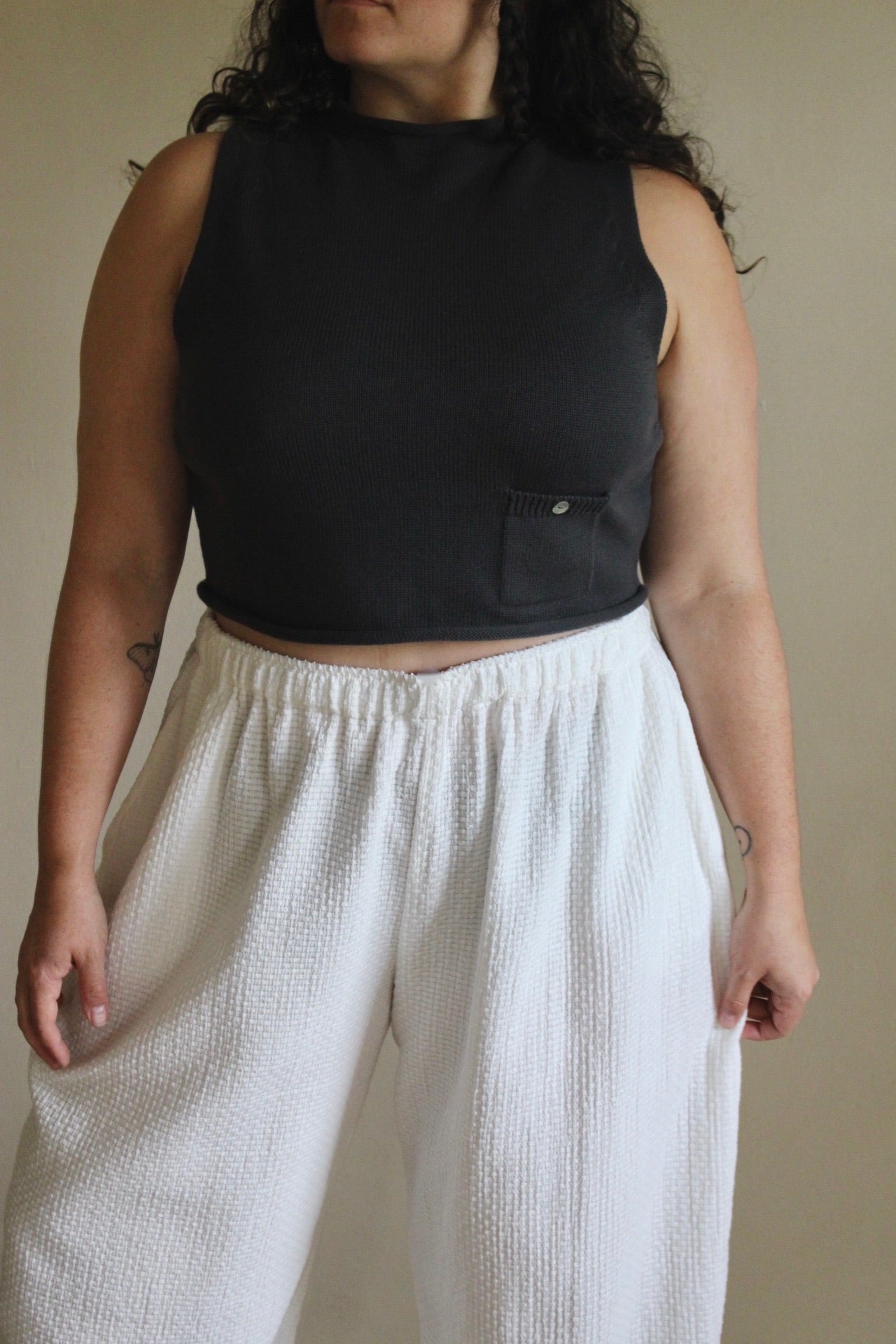 The Milo Pima Cotton Crop Vest is a charming pull-on top that includes a small rolled neckline and intricate accents all over, as well as a little front pocket. We envision pairing the Milo Crop with our Townes Trouser in cotton twill or with one's go-to vintage denim.